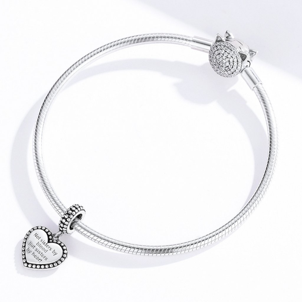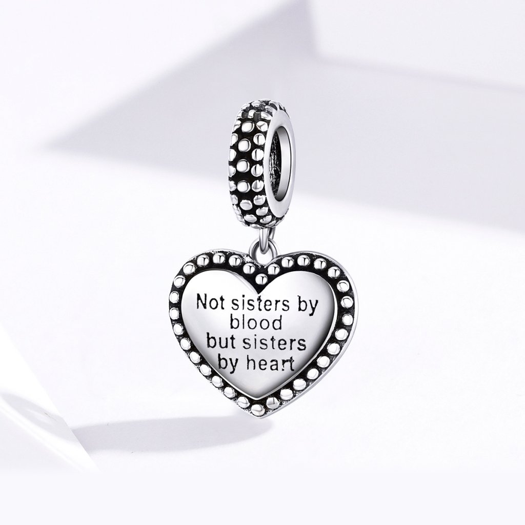 Stříbrný srdcový přívěsek v designu symbolu s anglickým nápisem "Not sisters by blood but sisters by heart" v překladu "Sestry ne krví ale sestry srdcem". Originální design přívěsku, kvalitní zpracování a materiál, ručně dohotovené.