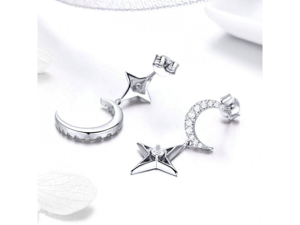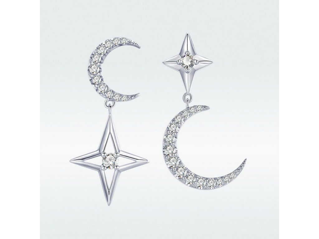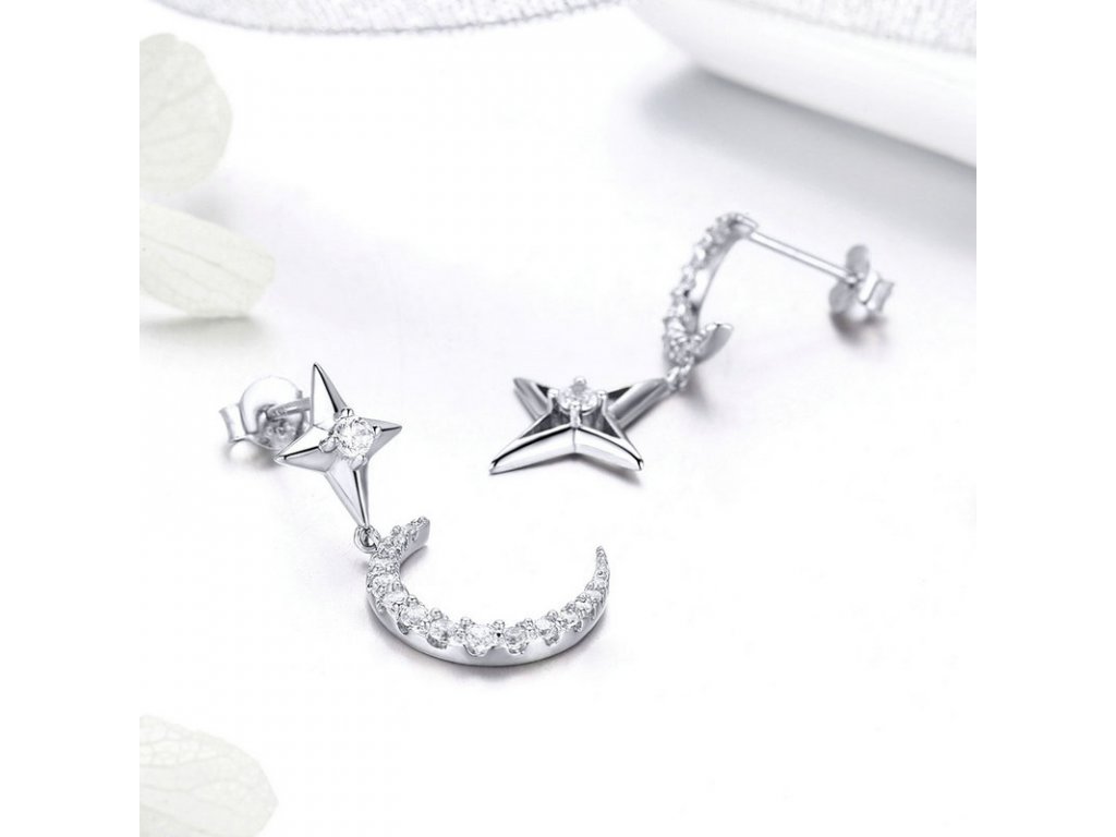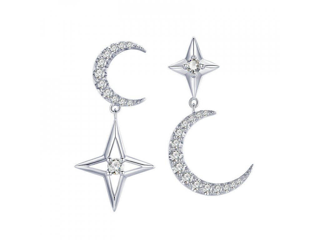 Elegantní stříbrné náušnice ve tvaru měsíce a hvězdy dekorované třpytivými zirkony. Originální design náušnic, kvalitní zpracování a materiál, ručně dohotovené. Stříbro 925/1000, zirkony. DODÁVÁME BALENÉ V DÁRKOVÉM BALENÍ - ZDARMA.