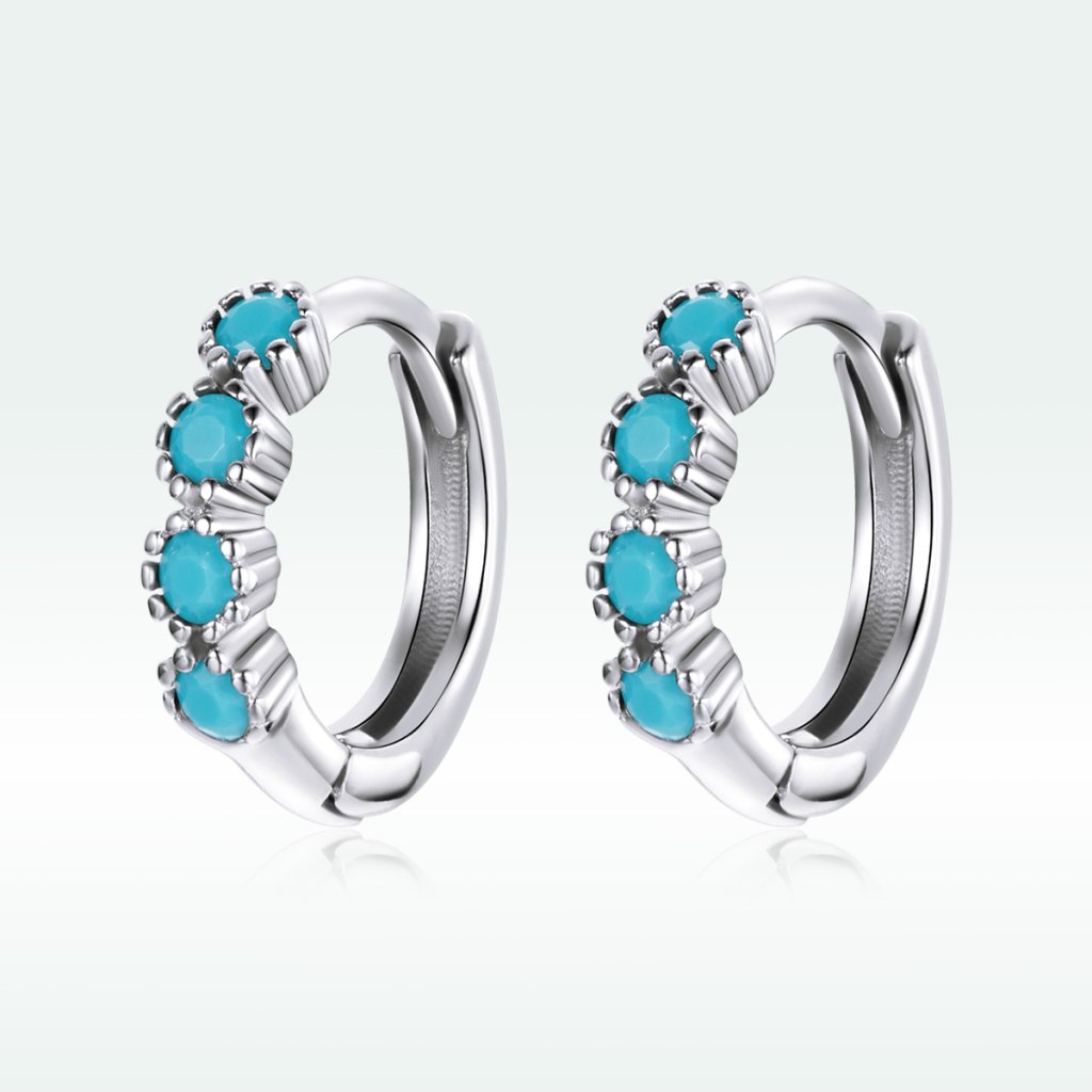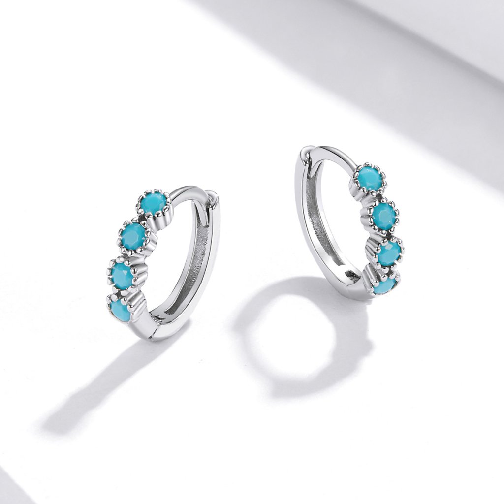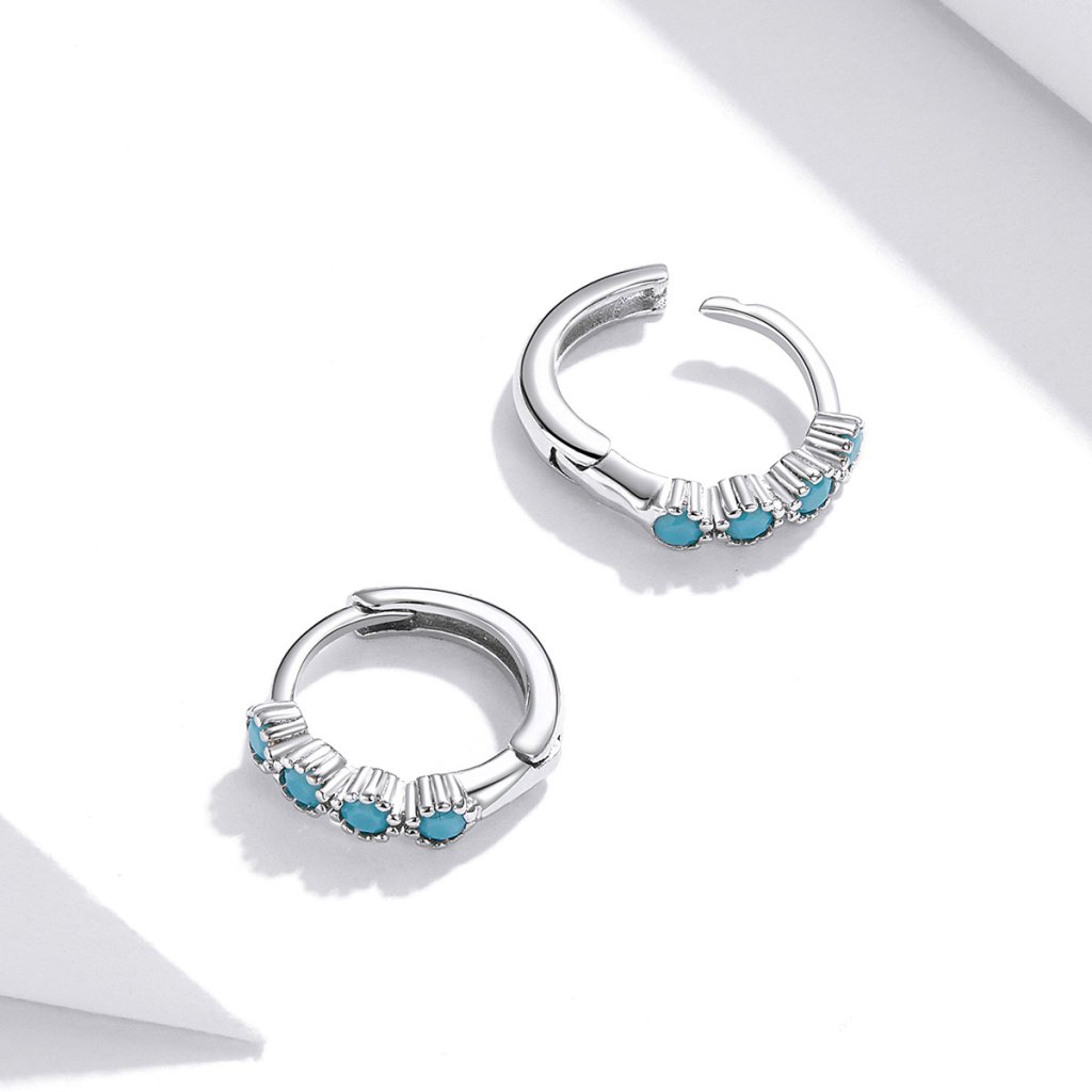 - Stříbrné náušnice kroužky zdobené ručně sázenými matnými tyrkysovými zirkony. Originální design náušnic, kvalitní zpracování a materiál, ručně dohotovené.
