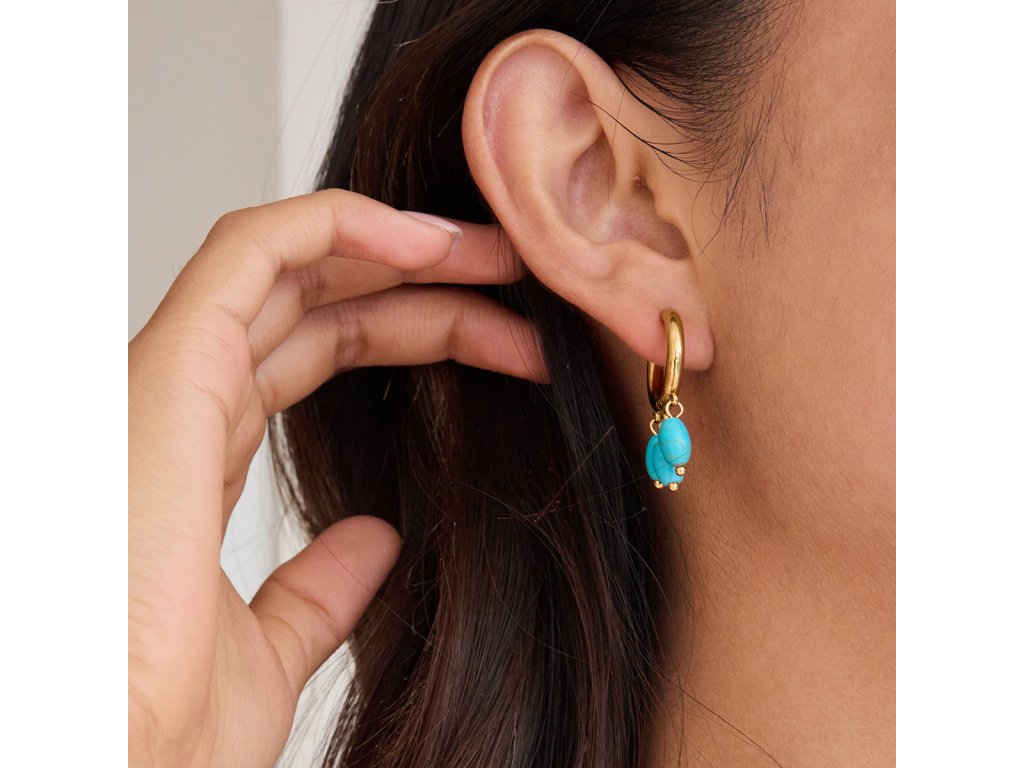 Tyrkysové kameny přinášejí barevný akcent inspirovaný vodou a létem. Jejich jemný pohyb dodává náušnicím dynamiku a přirozenou ženskost, která se krásně projeví při každém kroku.