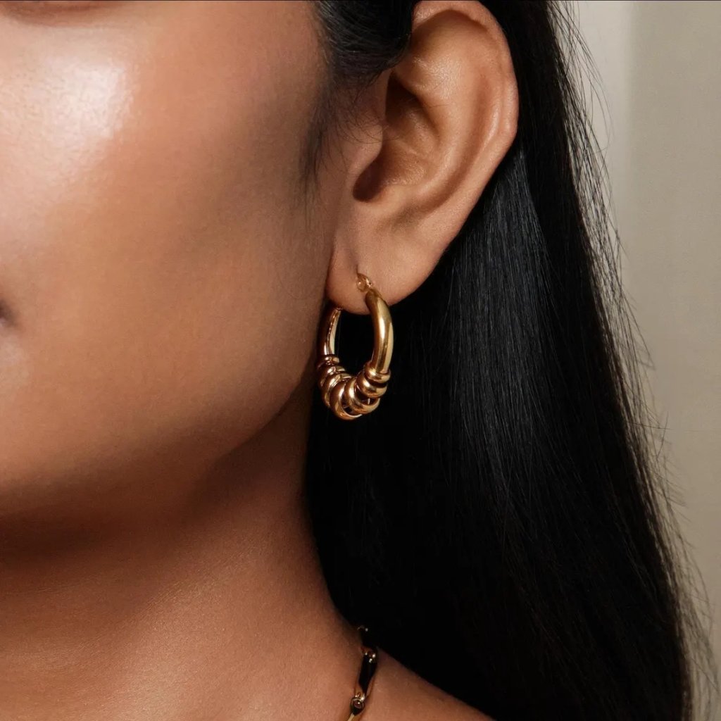 ELENYS Essence Hoops Gold jsou moderní kruhy s luxusním zlatým finišem – detail, který rozzáří každý vzhled.