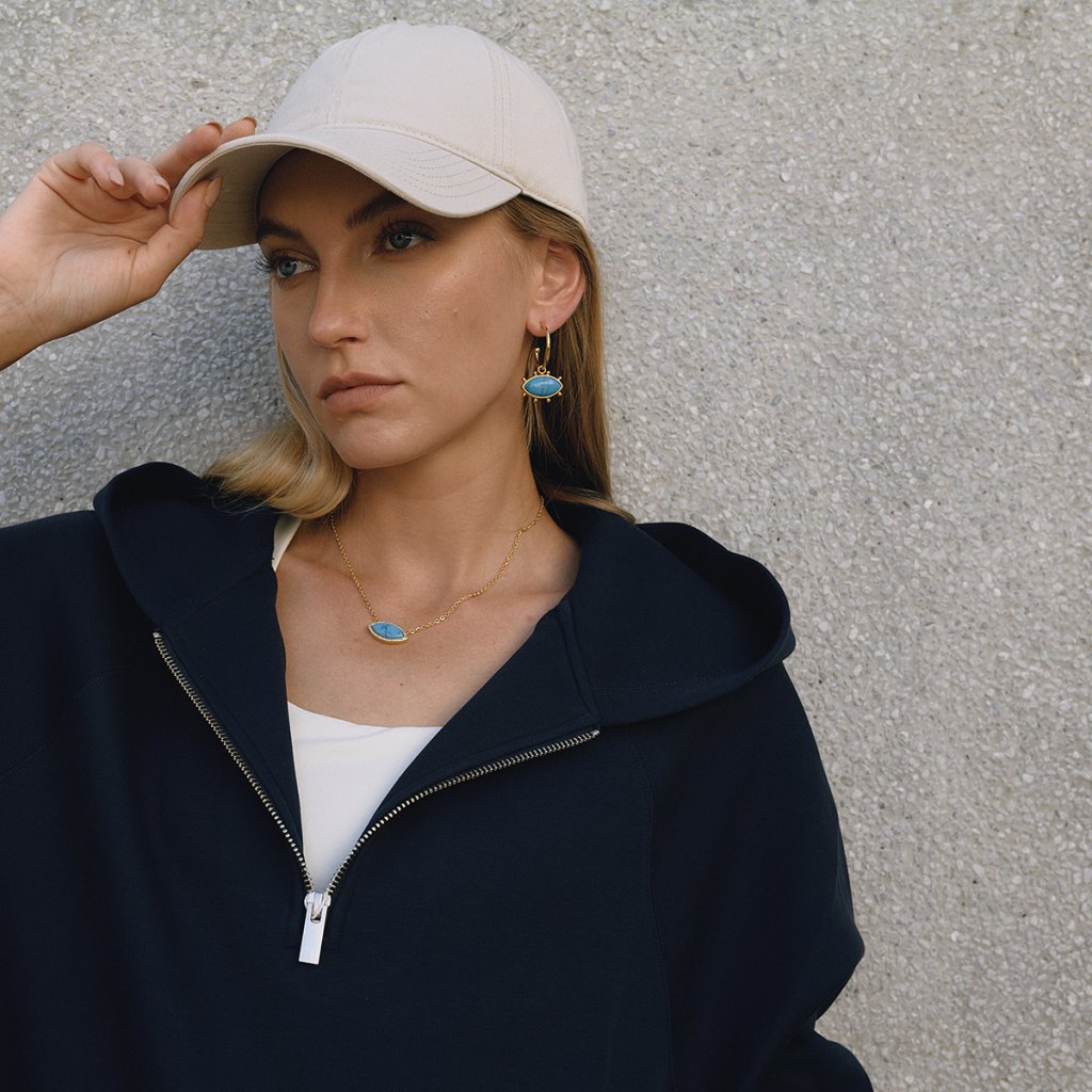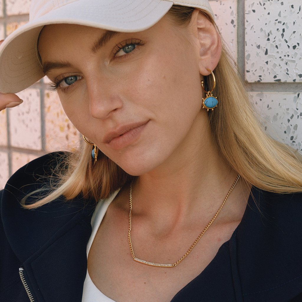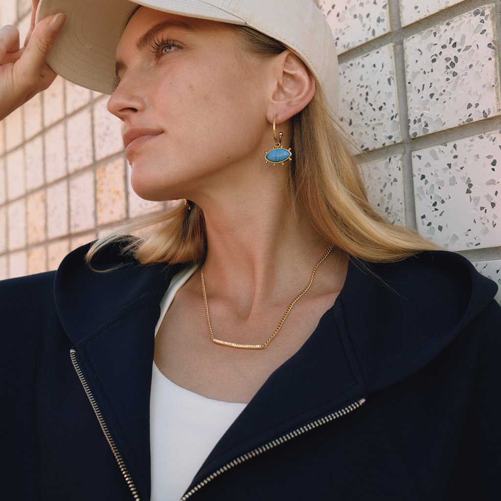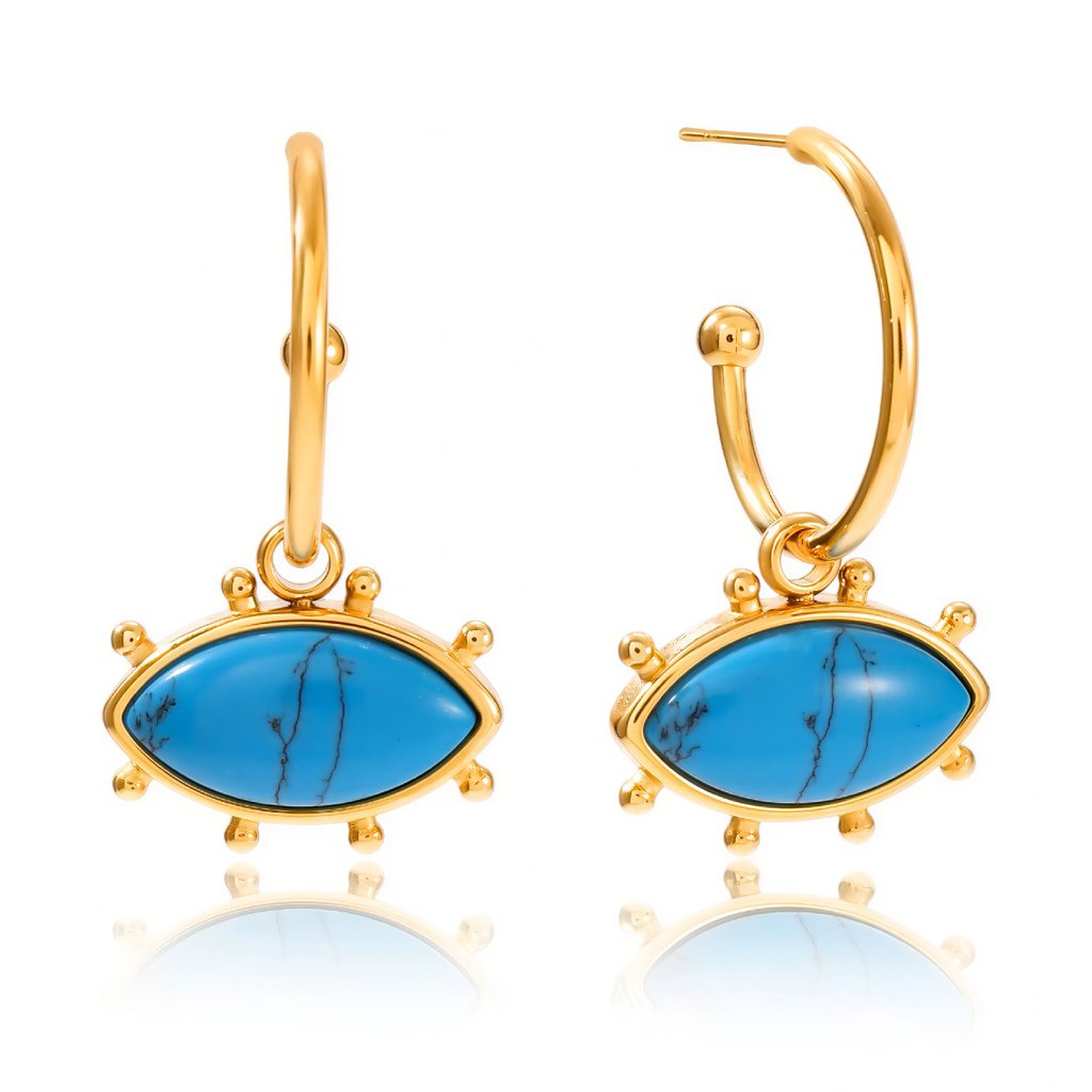 ELENYS Marella vynikají výrazným tyrkysovým kamenem v protáhlém tvaru oka, který je lemován jemnými paprsky. Kontrast s teplým odstínem zlata vytváří elegantní, moderní šperk s lehce mystickým nádechem.