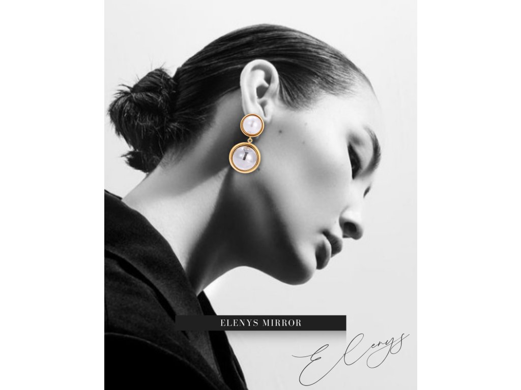 Náušnice ELENYS Mirror zaujmou ikonickým kruhovým tvarem: horní perlový prvek a spodní zrcadlově leštěná kupole v rámečku 18k zlata. Vytvářejí sofistikovaný kontrast světla a tvaru, který opticky projasní pleť a dodá looku moderní eleganci.
