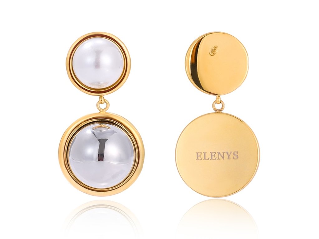 Náušnice ELENYS Mirror zaujmou ikonickým kruhovým tvarem: horní perlový prvek a spodní zrcadlově leštěná kupole v rámečku 18k zlata. Vytvářejí sofistikovaný kontrast světla a tvaru, který opticky projasní pleť a dodá looku moderní eleganci.