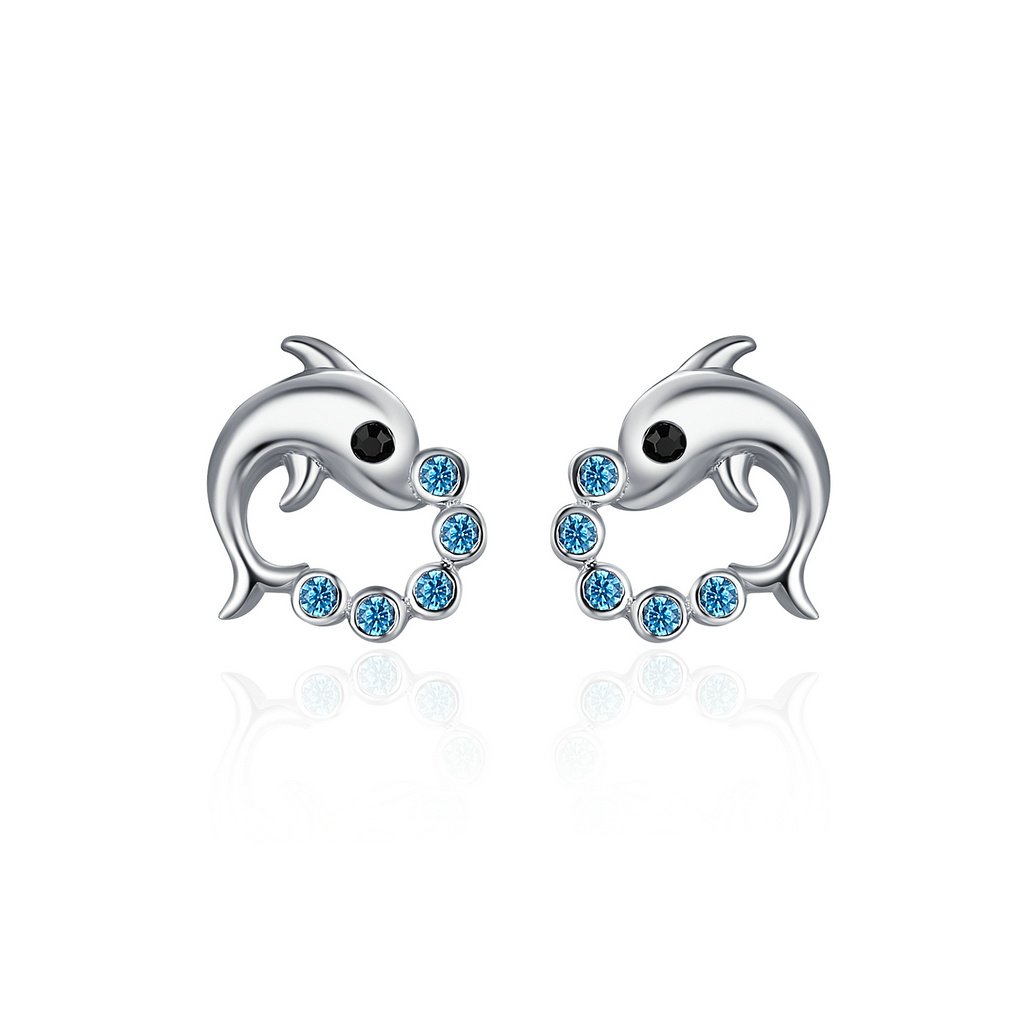 Krásné a roztomilé náušnice v designu delfínů. Jsou zdobené třpytivými kameny v podobě modrých zirkonů.