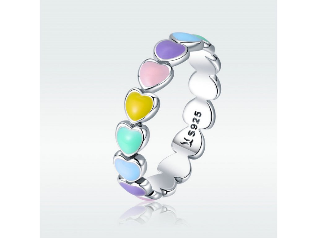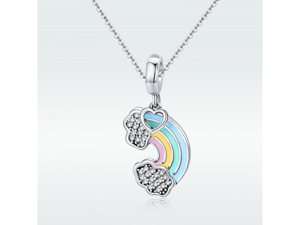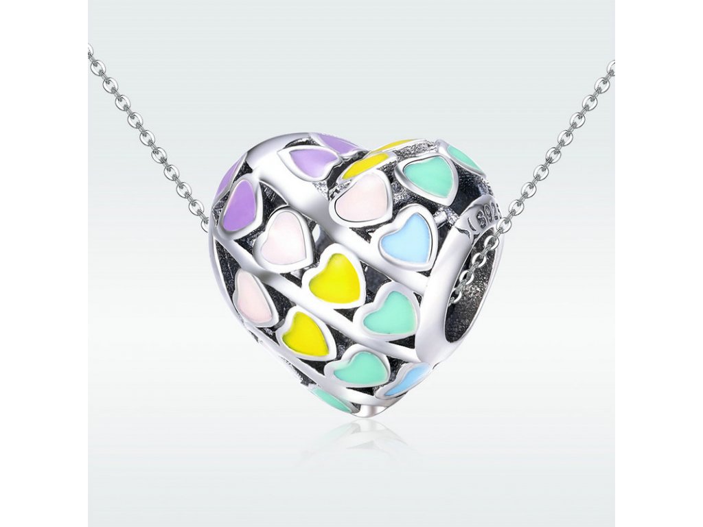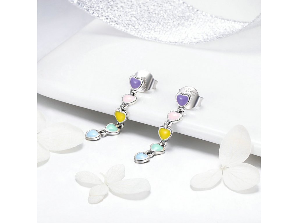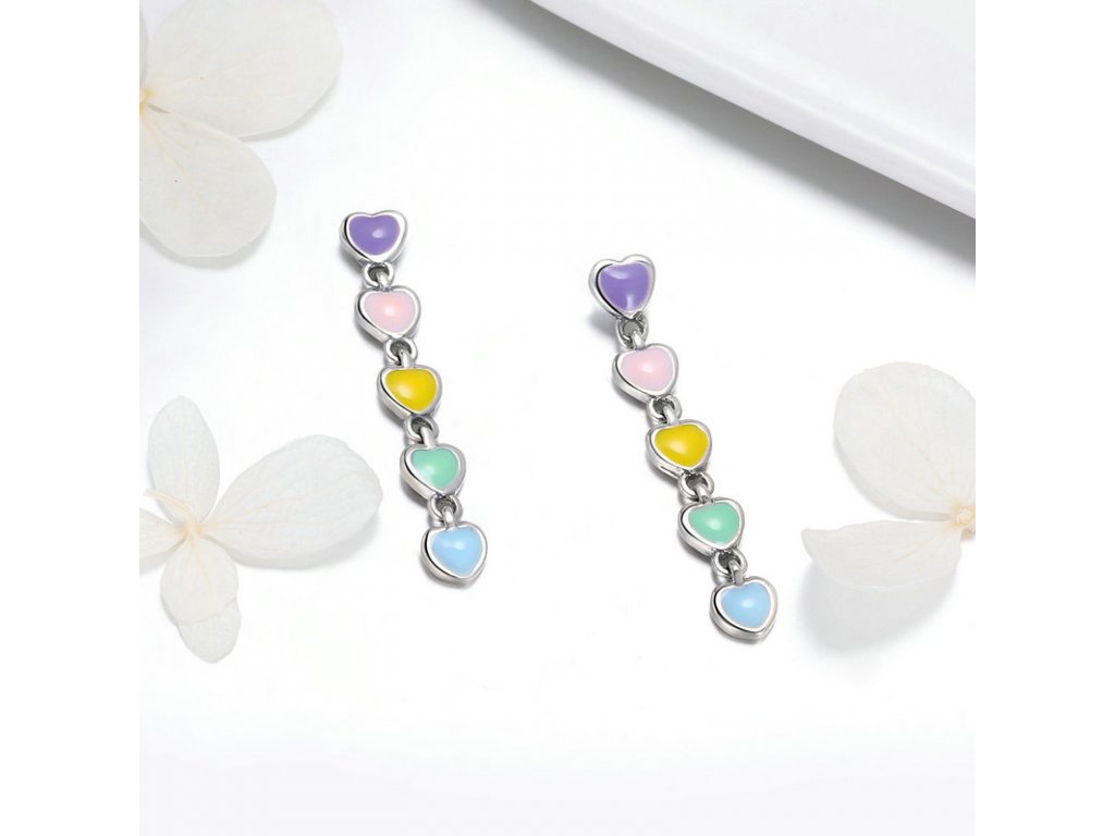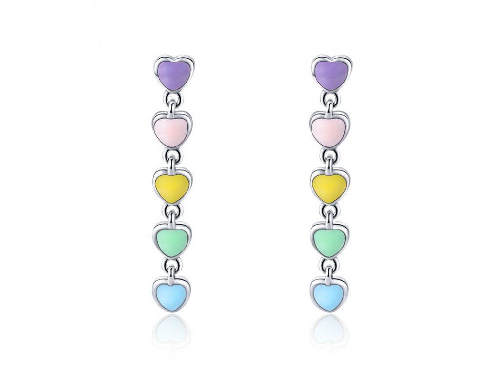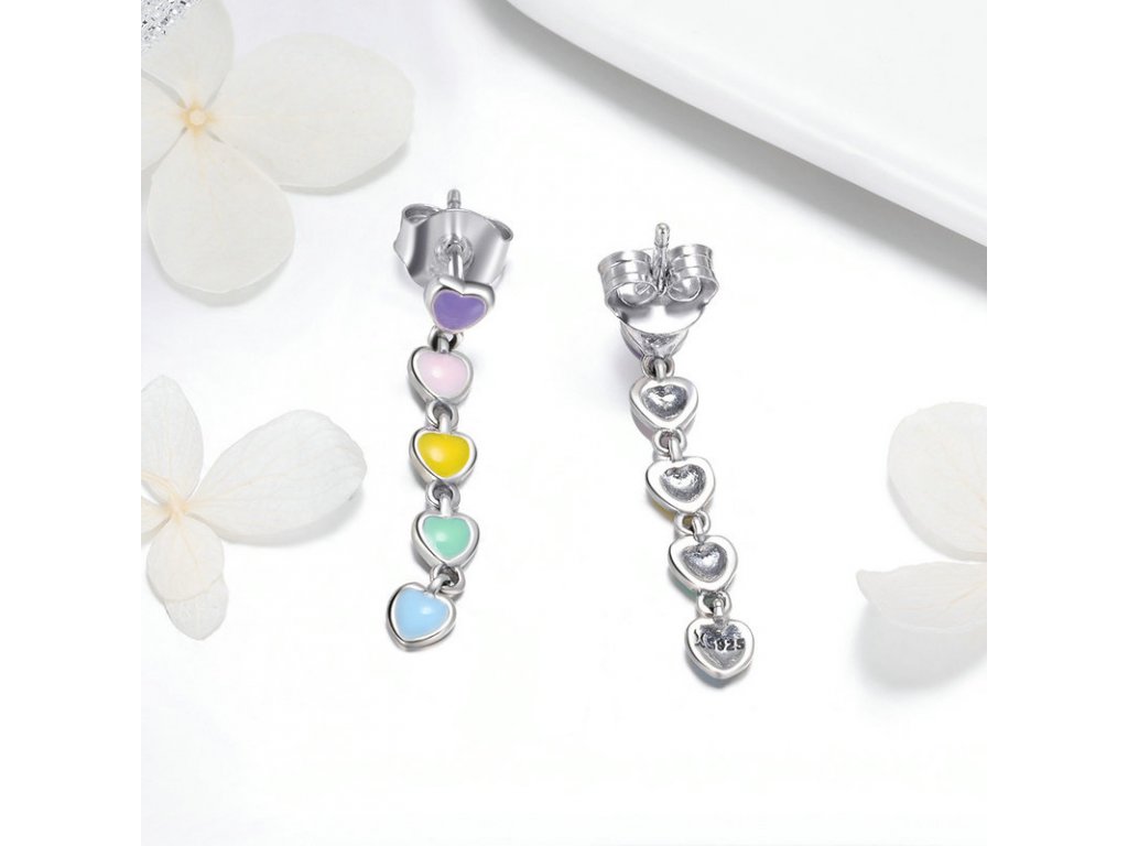 Luxusní a propracované stříbrné náušnice v designu duhového srdce zdobené glazurou.