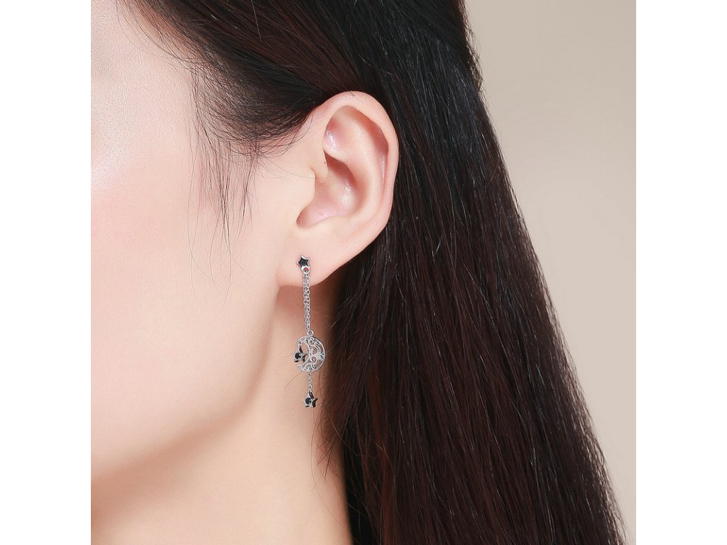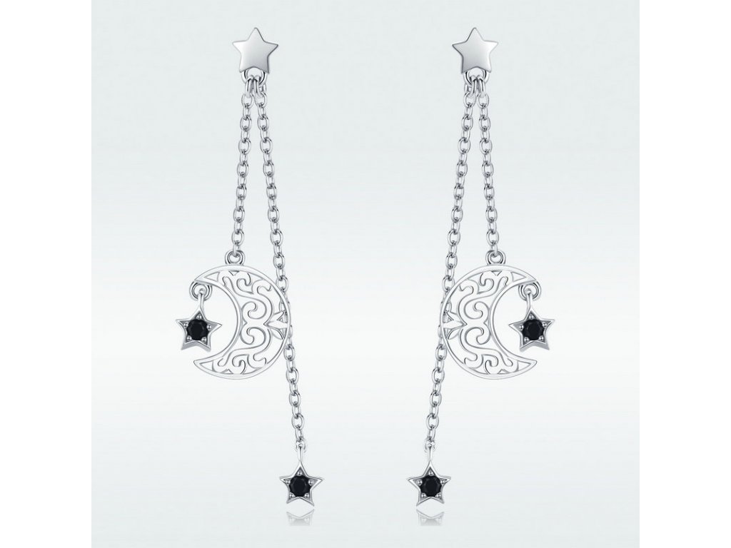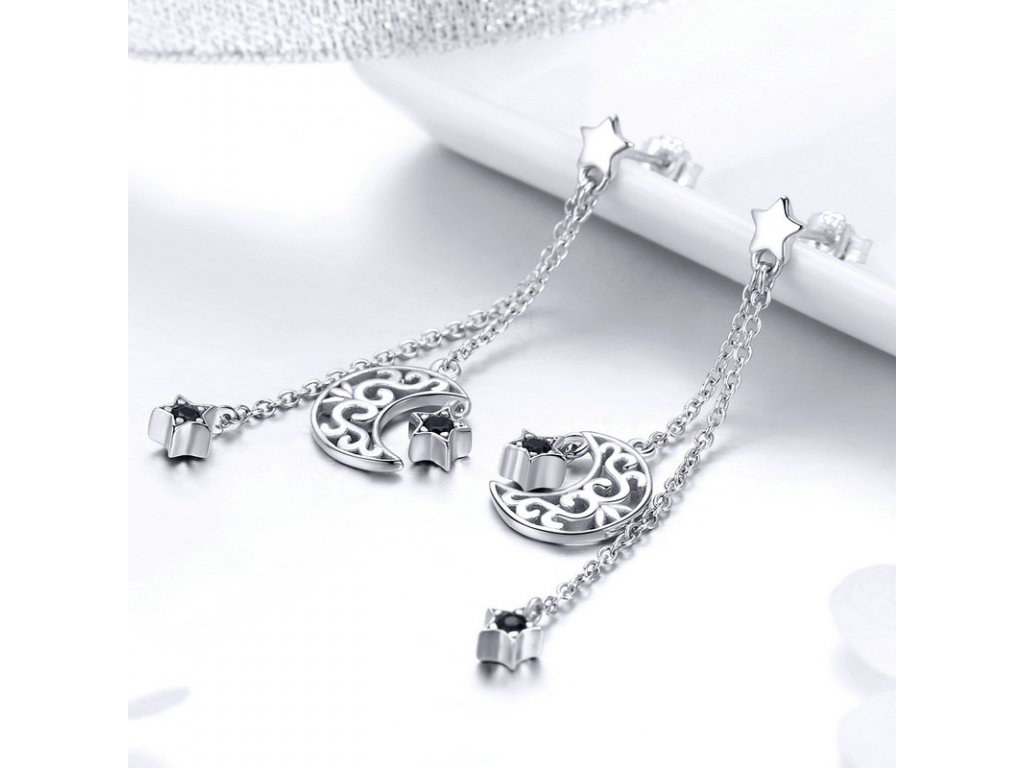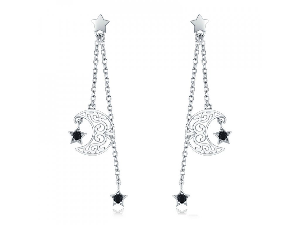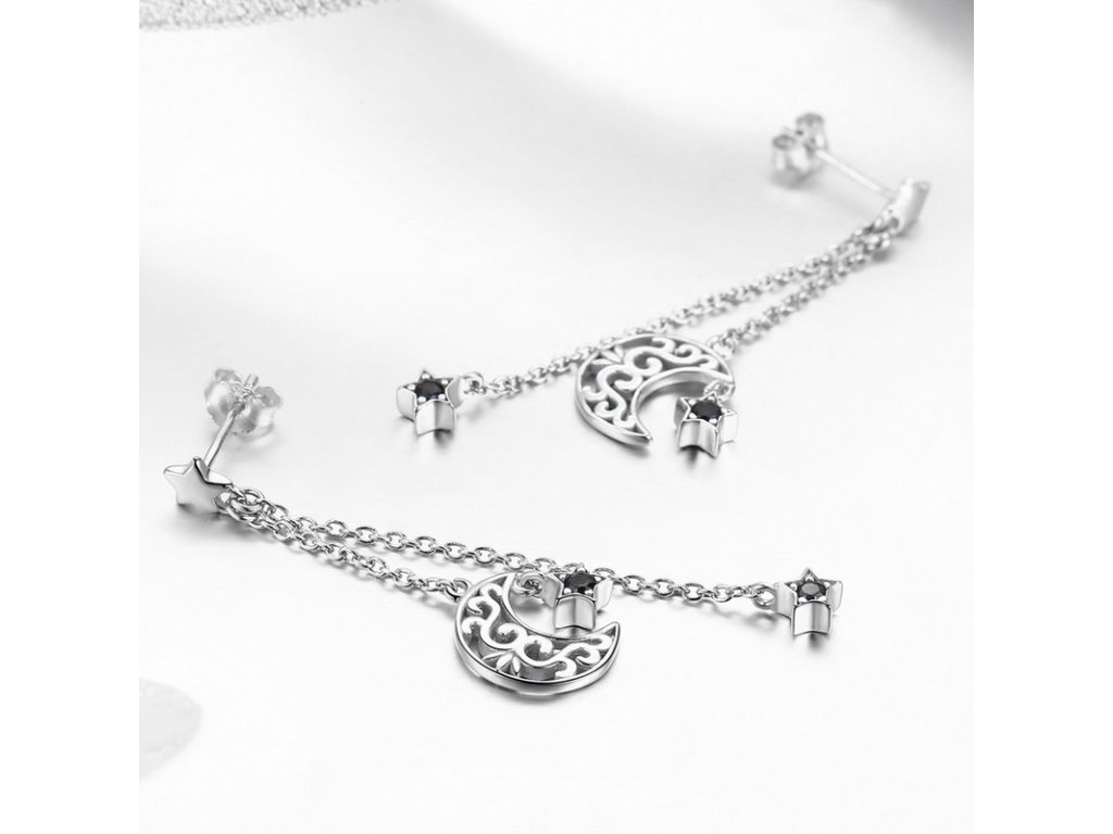 Elegantní stříbrné visací náušnice ve tvaru měsíce a hvězd s černými zirkony. Originální design náušnic, kvalitní zpracování a materiál, ručně dohotovené.