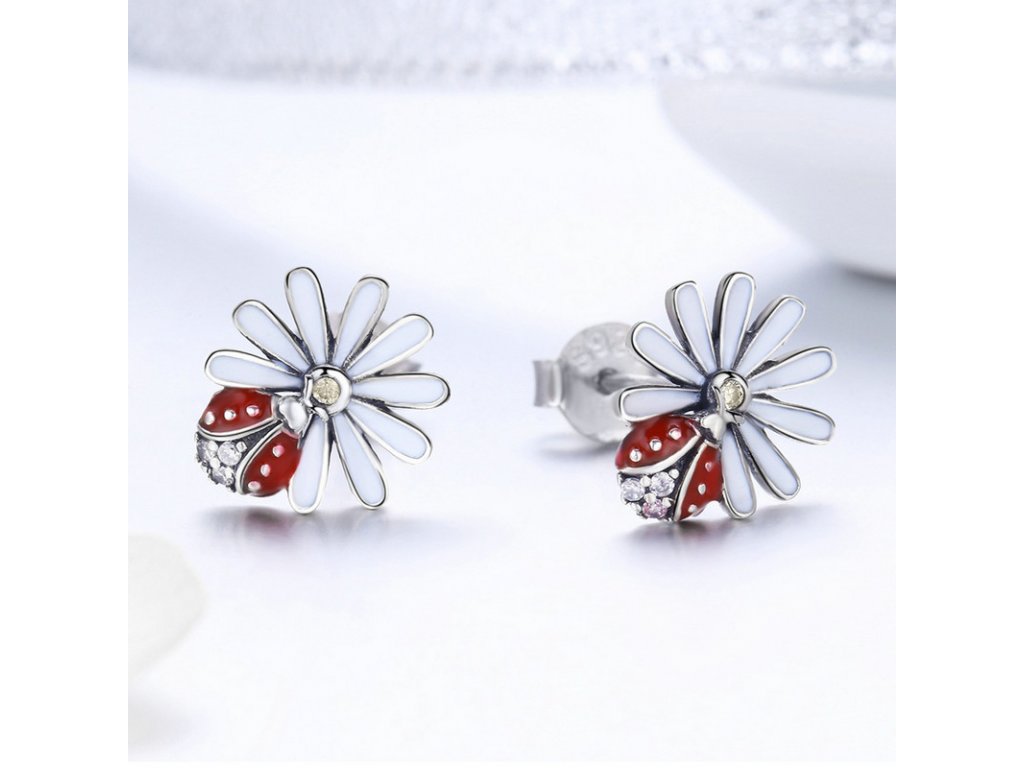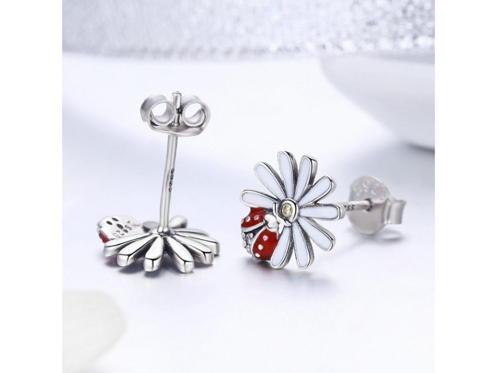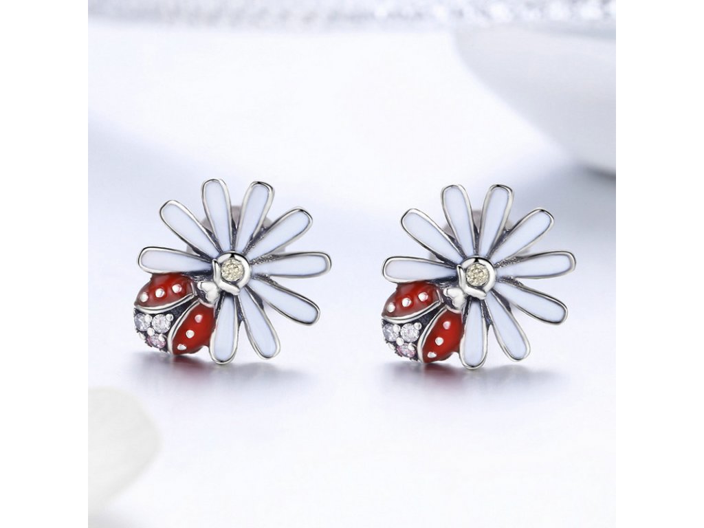 Luxusní a propracované stříbrné náušnice v designu oslnivé sedmikrásky zdobené zirkony a glazurou.