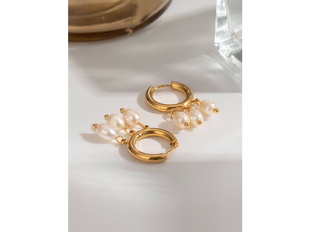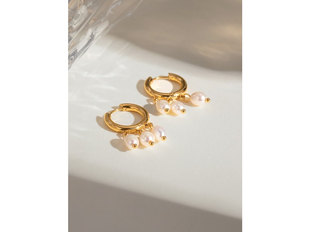 Tři jemné perly na zlatých kroužcích – drobný detail, který rozzáří každý look.