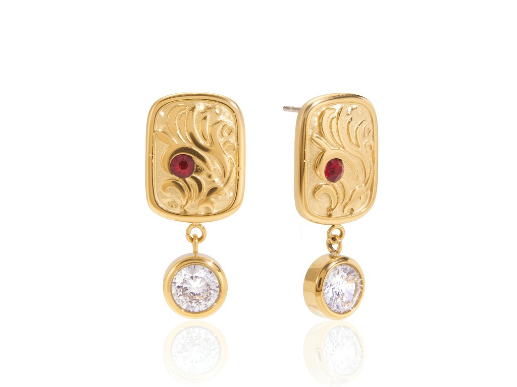 ELENYS Relic Drop jsou visací náušnice, které působí jako drobný šperk s příběhem. Reliéfní prvek s ornamentální strukturou je doplněn čirým zirkonem, který zachycuje světlo a dodává náušnicím jemný, kontrolovaný třpyt.