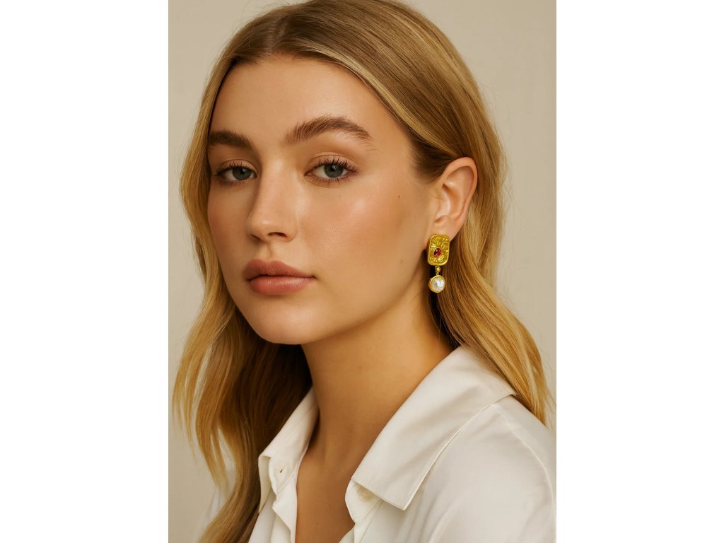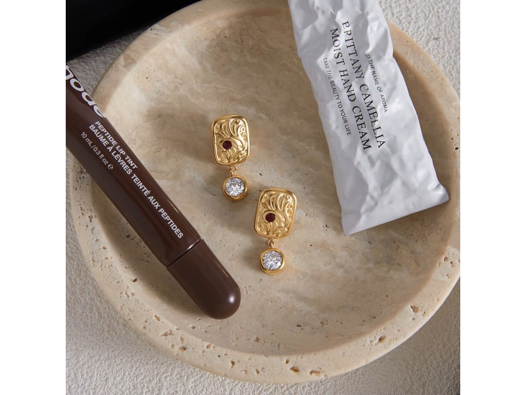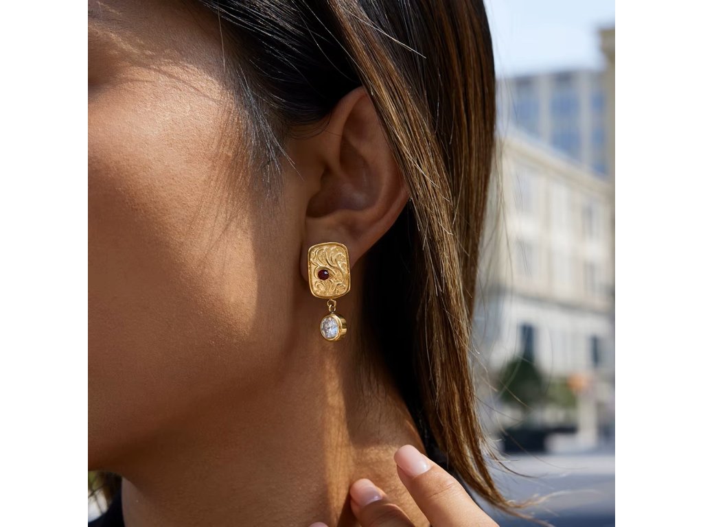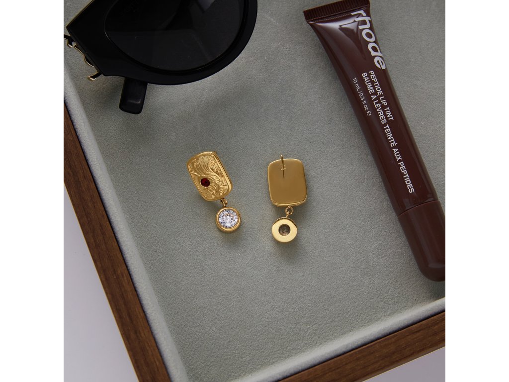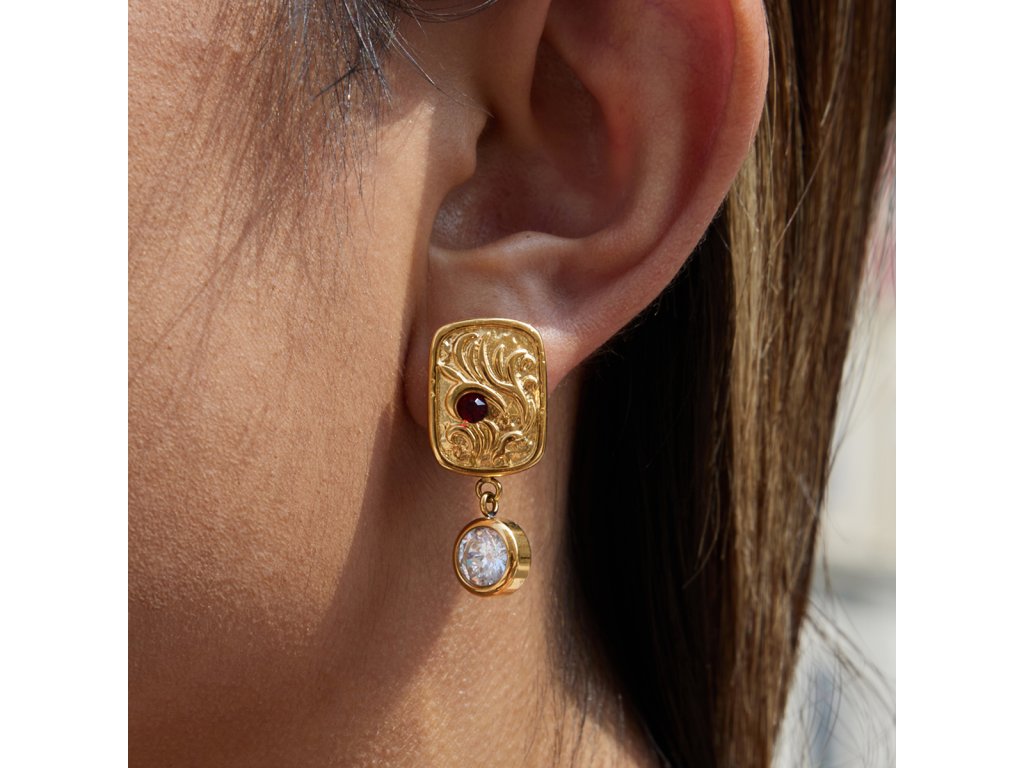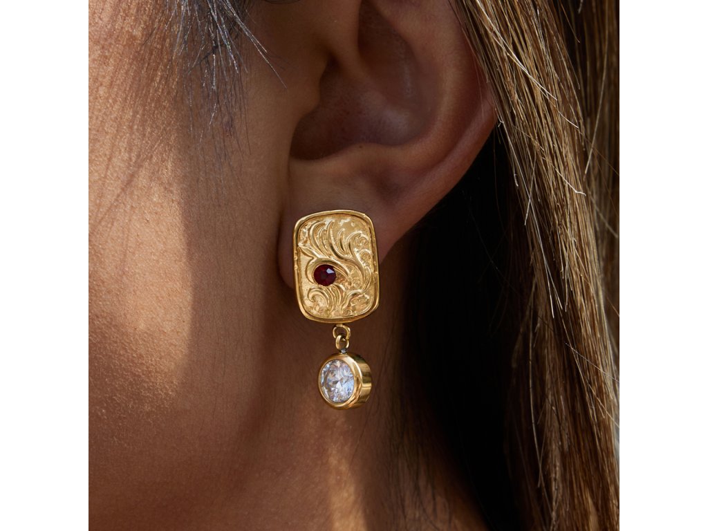 ELENYS Relic Drop jsou visací náušnice, které působí jako drobný šperk s příběhem. Reliéfní prvek s ornamentální strukturou je doplněn čirým zirkonem, který zachycuje světlo a dodává náušnicím jemný, kontrolovaný třpyt.