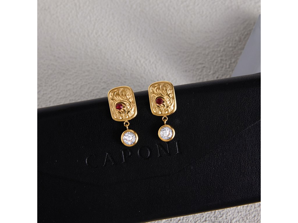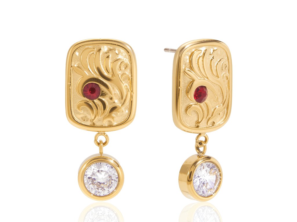 Ornamentální reliéf připomíná starobylý symbol nebo osobní talisman. Zirkon dodává světelný akcent, který zvýrazňuje detail, aniž by narušoval charakter šperku. Náušnice jsou výrazné, ale nepůsobí přehnaně.
