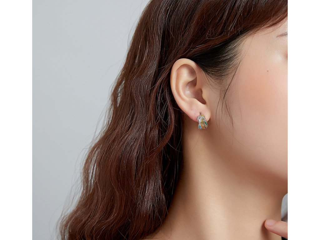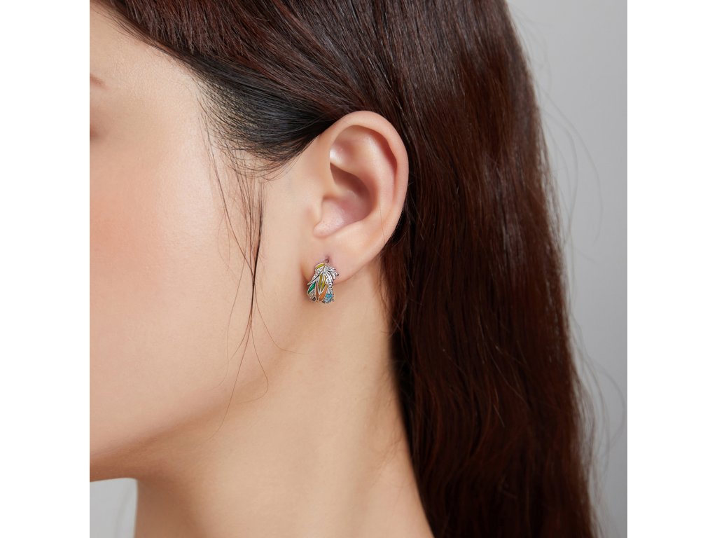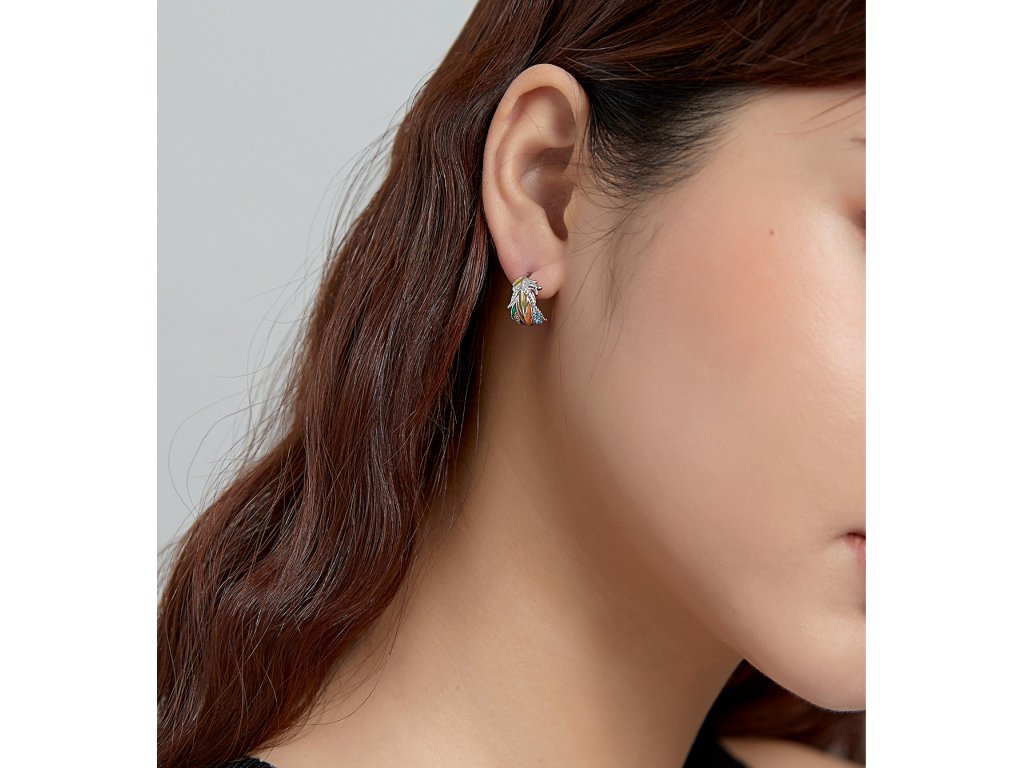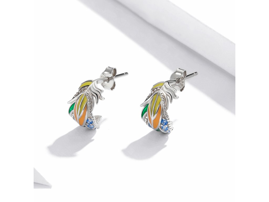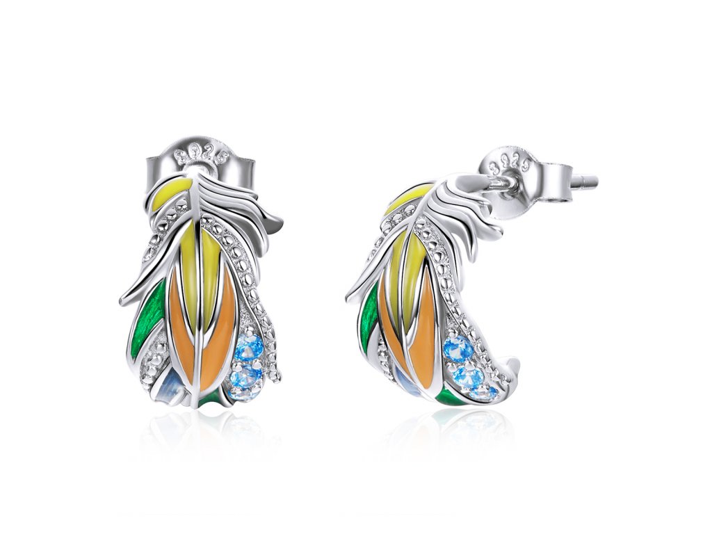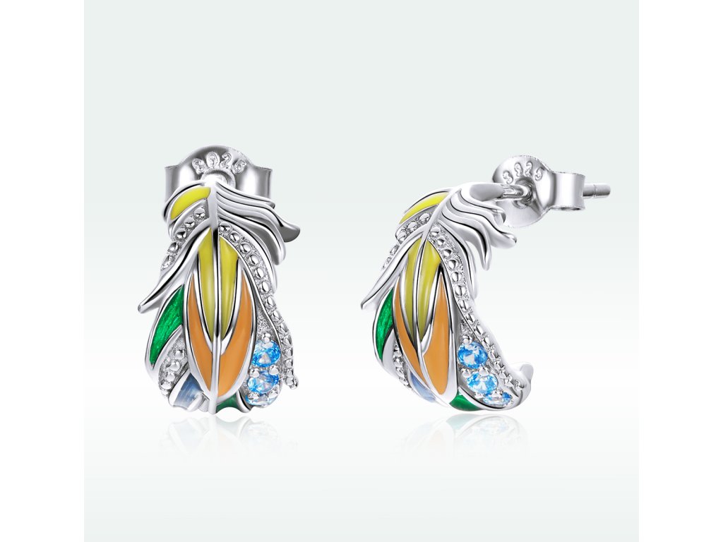 - Stříbrné náušnice v designu barevných pírek zdobené nebesky modrými zirkony a ručně nanášenou barevnou glazurou. Originální design náušnic, kvalitní zpracování a materiál, ručně dohotovené.