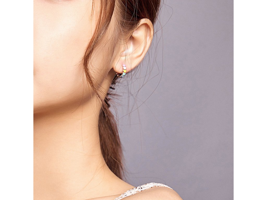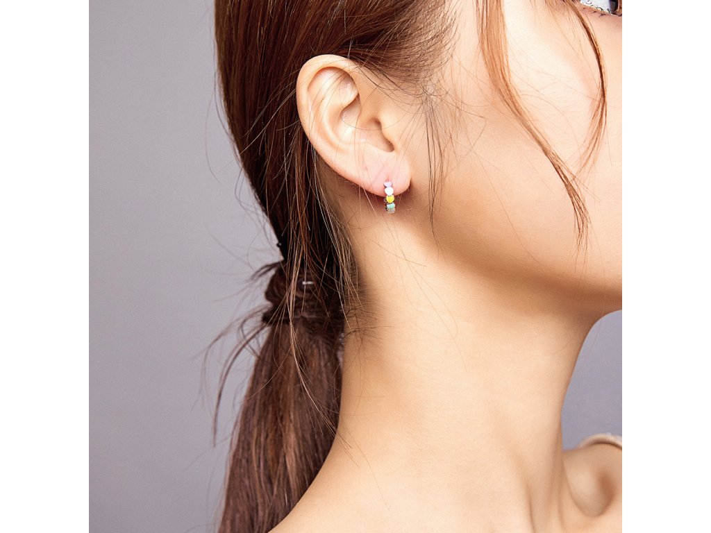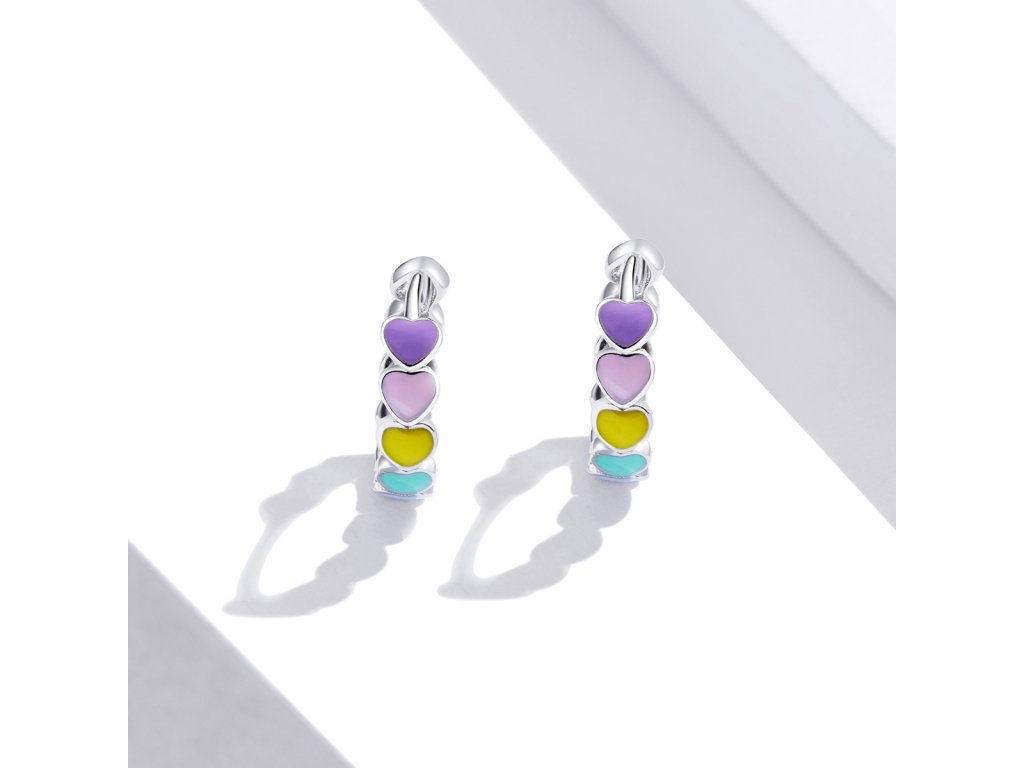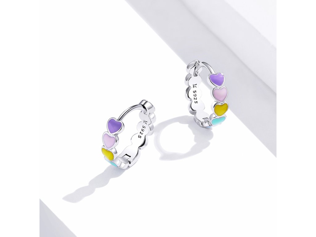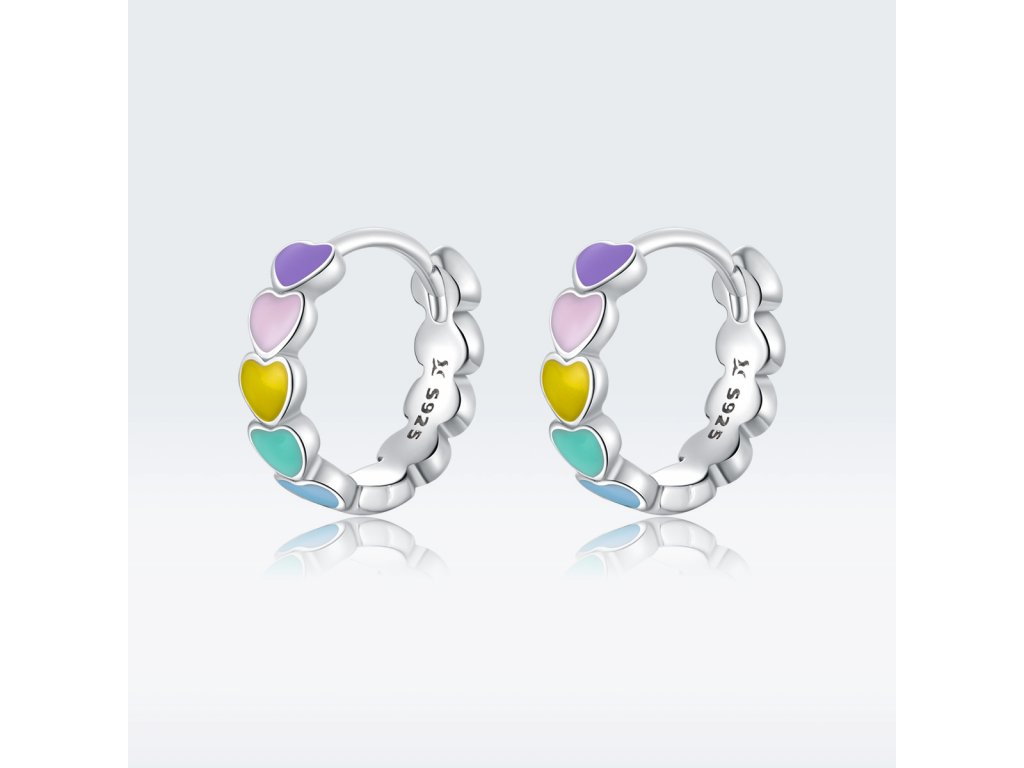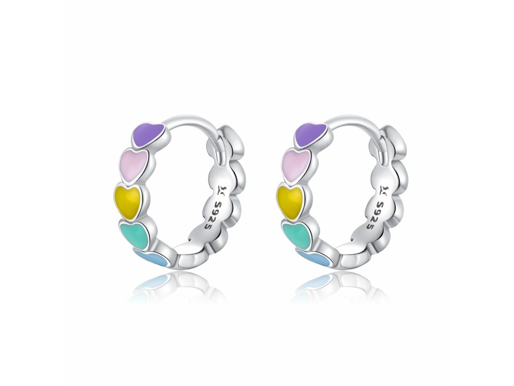 - Stříbrné kroužky v designu duhových náušnic v podobě barevných srdcí zdobených ručně nanášenou glazurou. Originální design náušnic, kvalitní zpracování a materiál, ručně dohotovené.