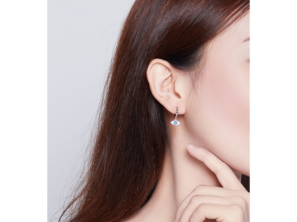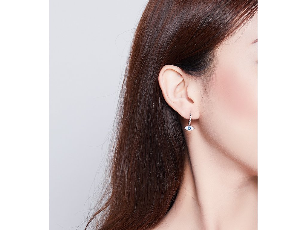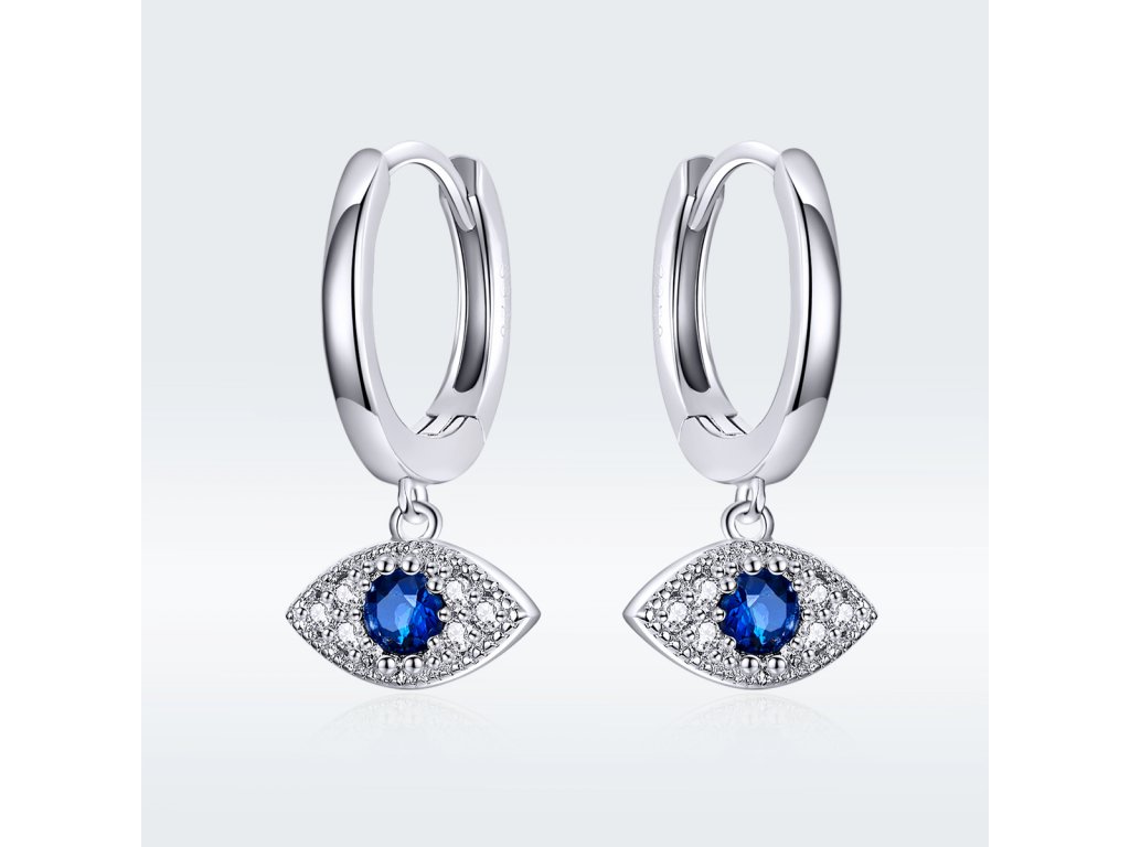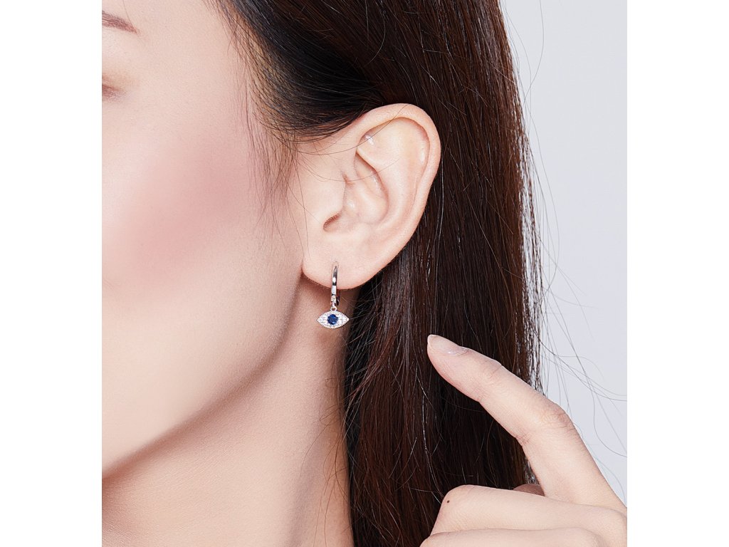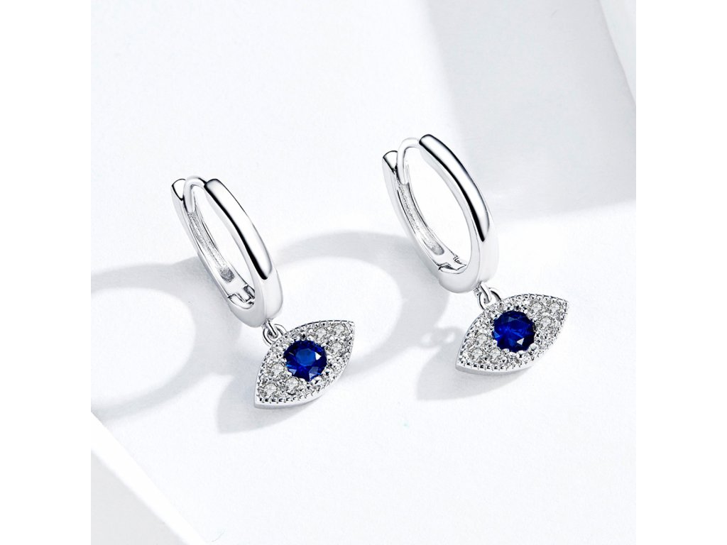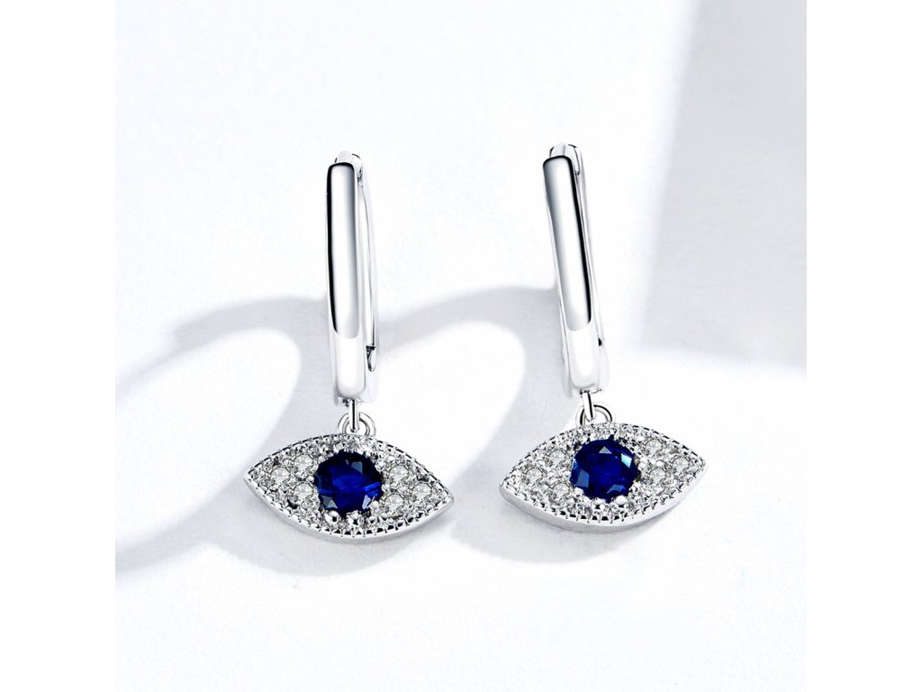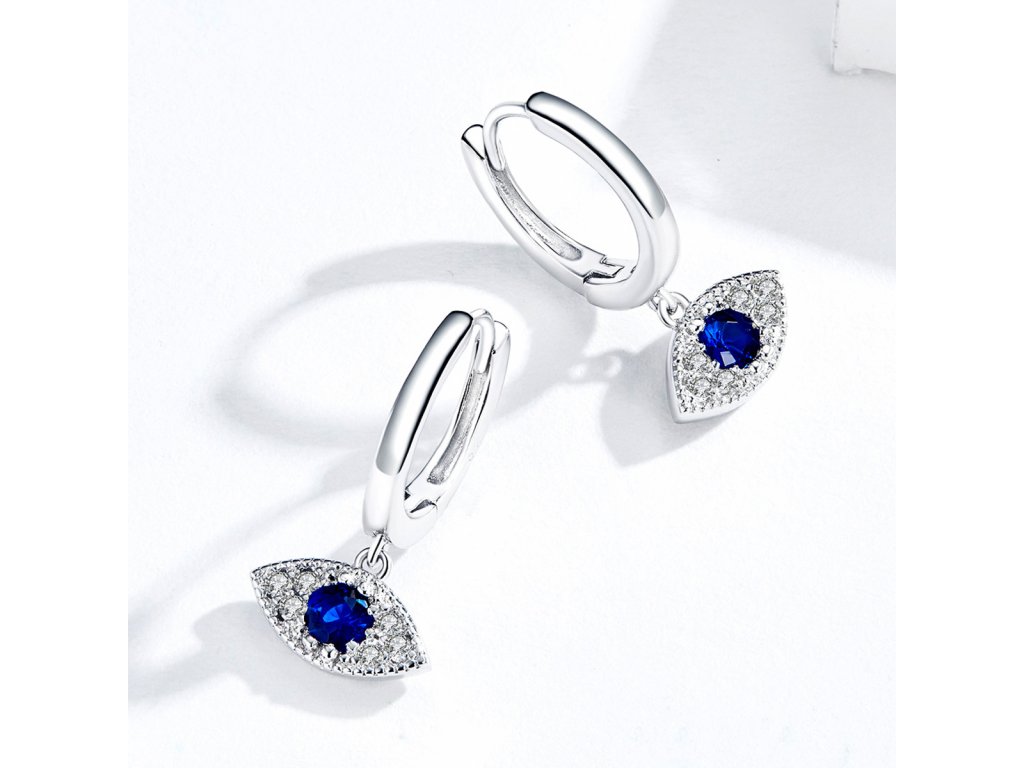 - Stříbrné náušnice v designu Hamsy symbolu ochrany zdobené čirými a tmavě modrými třpytivými zirkony. Originální design náušnic, kvalitní zpracování a materiál, ručně dohotovené.