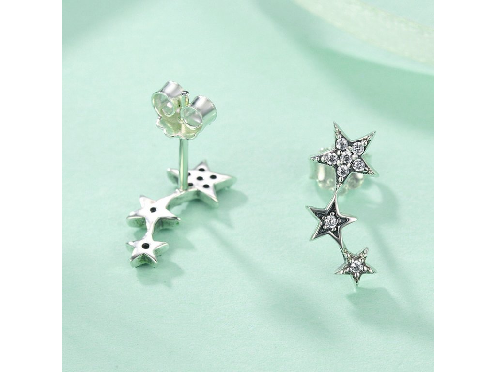 Stříbrné náušnice v designu hvězd posázených třpytivými zirkony. Rozměry: (výška x šířka) 1.3 x 0.6 cm. Materiál: pravé stříbro kvality 925, zirkony. DODÁVÁME BALENÉ V DÁRKOVÉ KRABIČCE - ZDARMA.