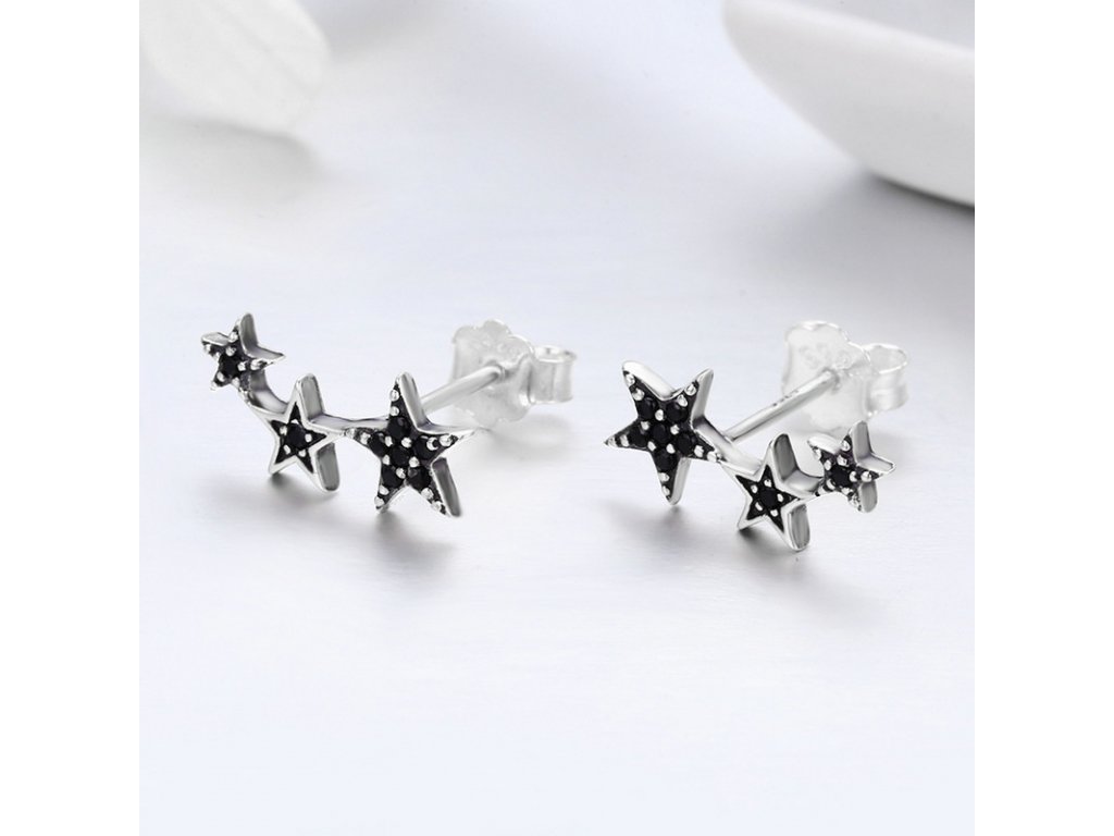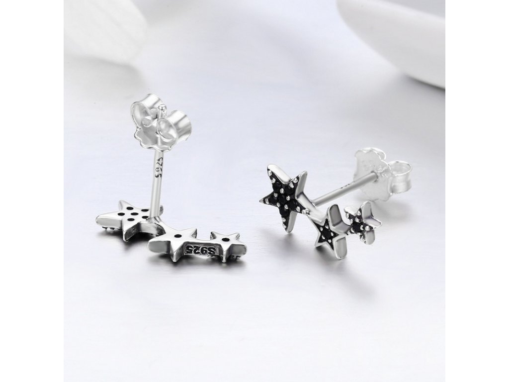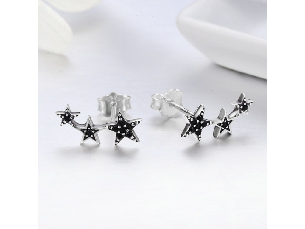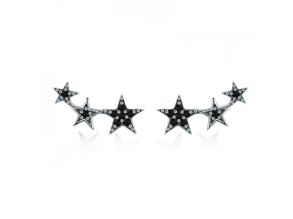 Stříbrné propracované hvězdné náušnice přes celé ucho zdobené smaltem a černými zirkony. Rozměry: (šířka x výška) 1.3 x 0.6 cm. Materiál: pravé stříbro kvality 925, zirkony. DODÁVÁME BALENÉ V DÁRKOVÉ KRABIČCE - ZDARMA.