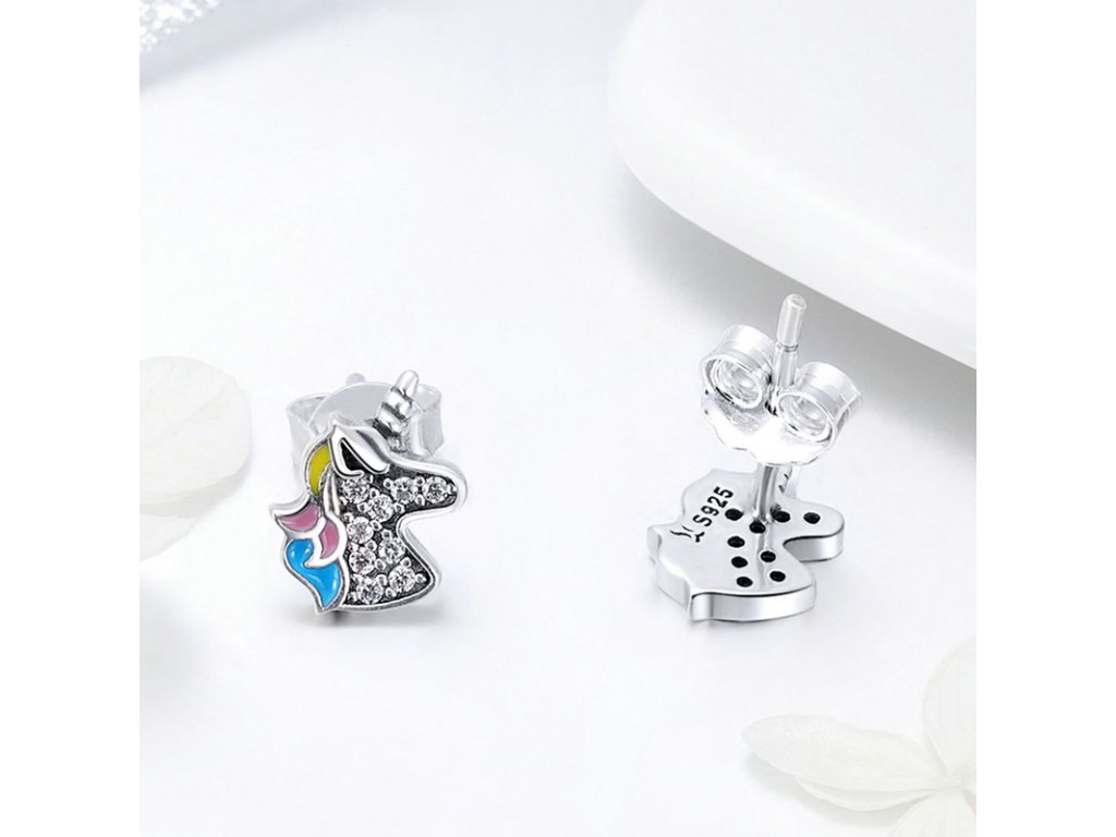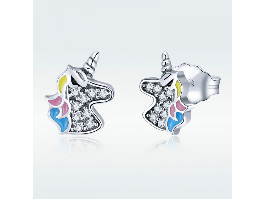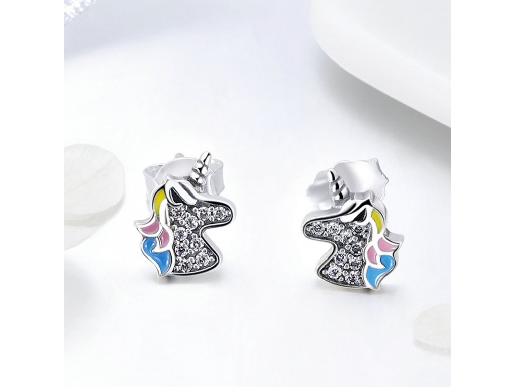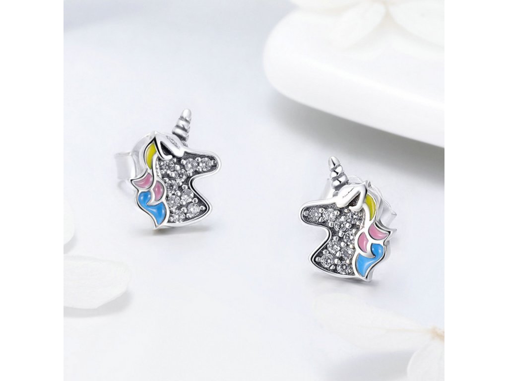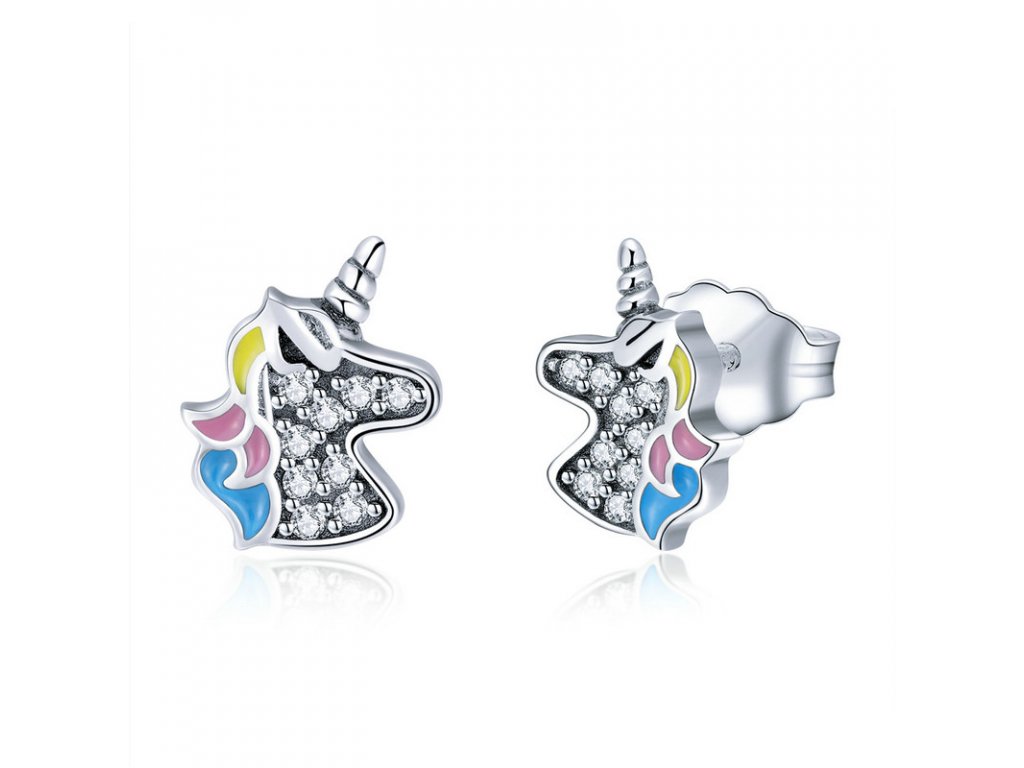Originální stříbrné náušnice ve tvaru jednorožce Unicorn zdobeného čirými zirkony a barevnou glazurou. Originální design náušnic, kvalitní zpracování a materiál, ručně dohotovené.