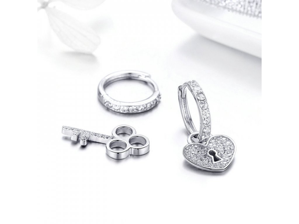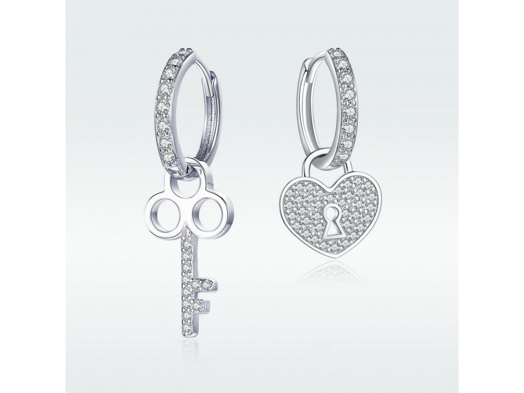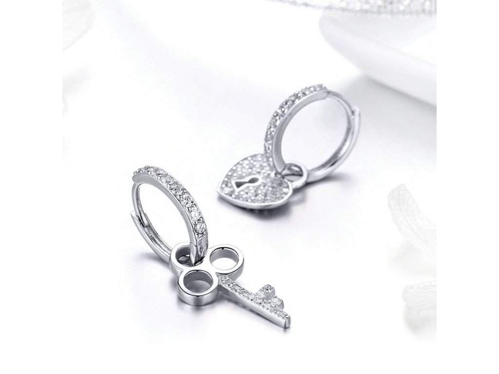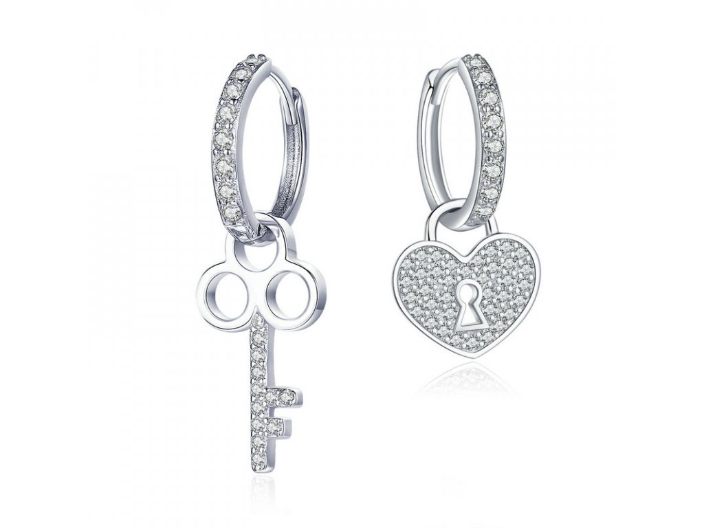 Originální stříbrné náušnice se zirkony, kde jedna náušnice je ve tvaru zámku a druhá ve tvaru klíče. Lze je nosit i jako samostatné třpytivé kroužky. Originální design náušnic, kvalitní zpracování a materiál, ručně dohotovené.