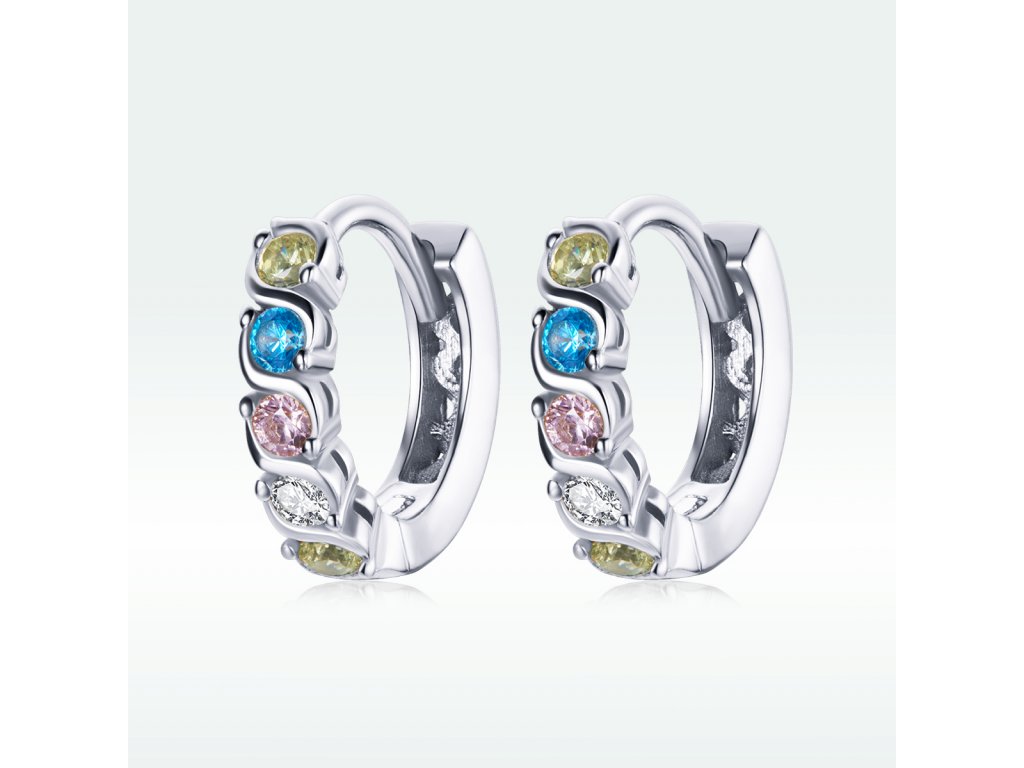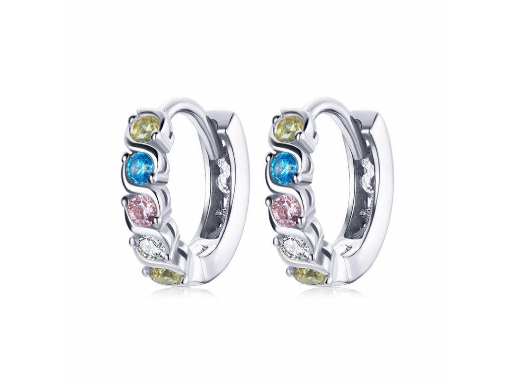 - Stříbrné kruhové náušnice zdobené blýskavými barevnými zirkony. Originální design náušnic, kvalitní zpracování a materiál, ručně dohotovené.