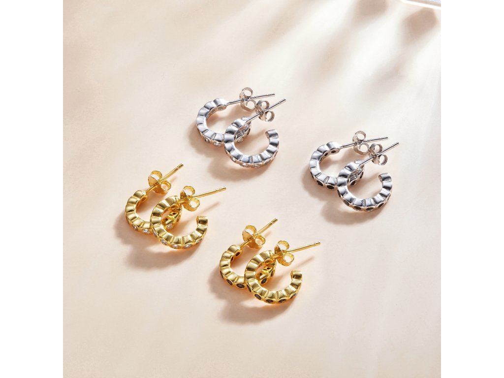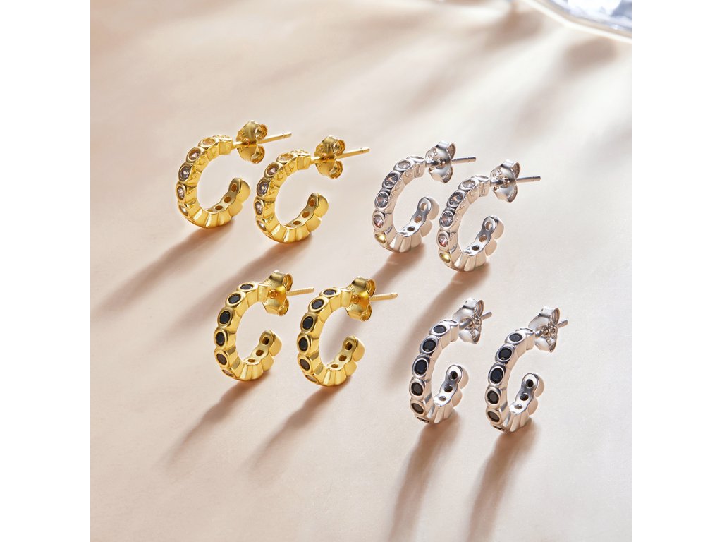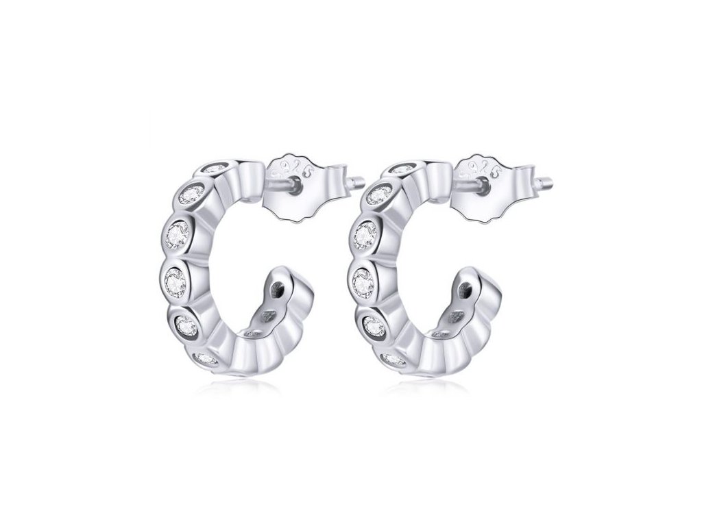 - Stříbrné elegantní kruhové náušnice zdobené třpytivými kameny v podobě čirých zirkonů. Originální design náušnic, kvalitní zpracování a materiál, ručně dohotovené.