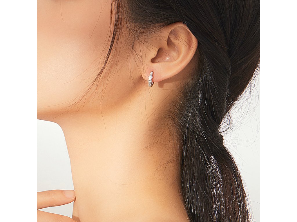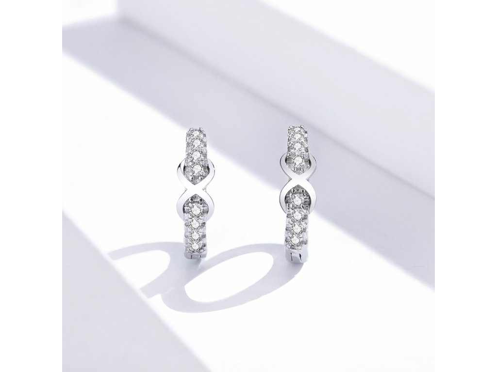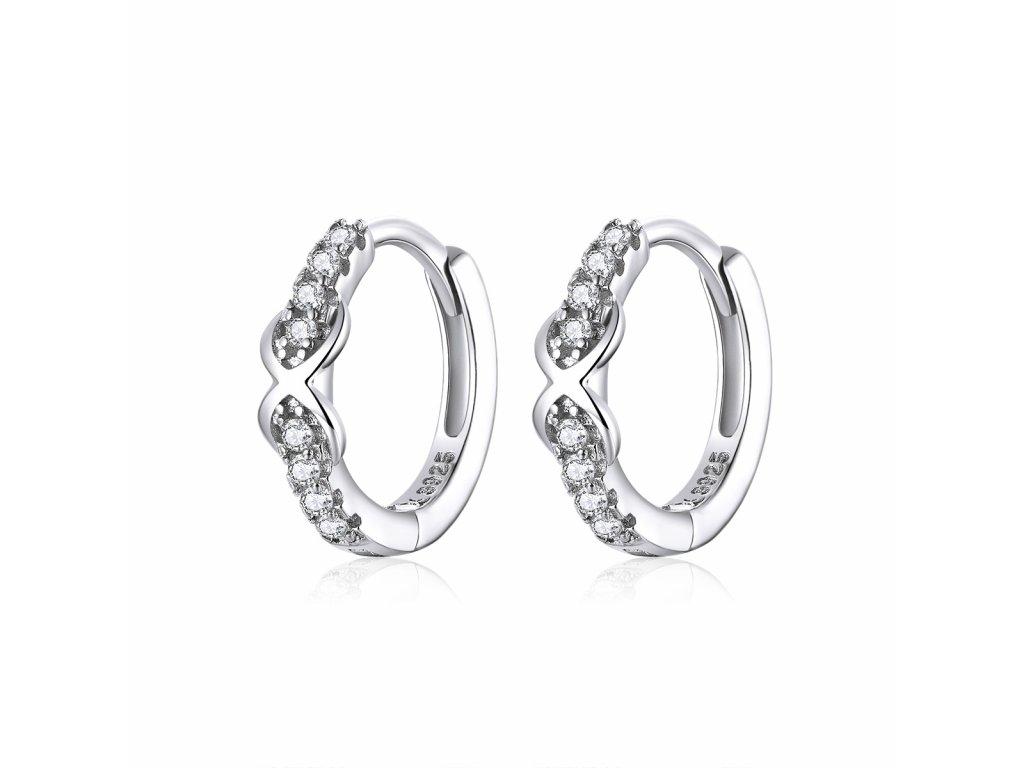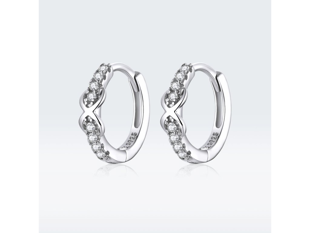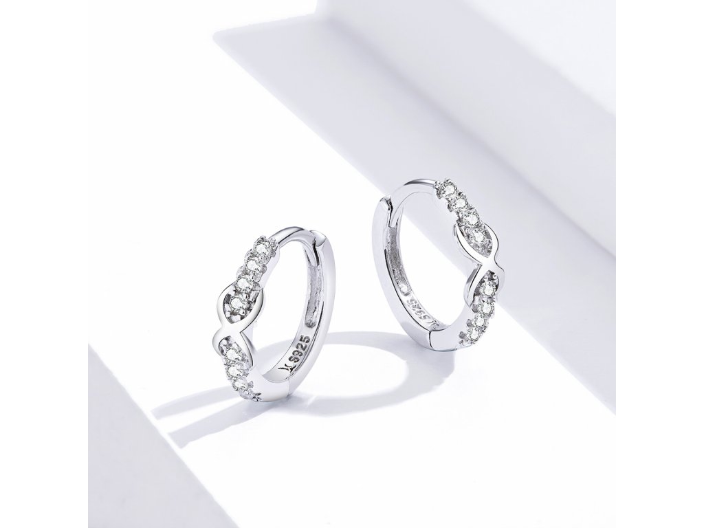 - Stříbrné náušnice malé kroužky v designu Symbolu nekonečné lásky posázené třpytivými kameny v podobě čirých zirkonů. Originální design náušnic, kvalitní zpracování a materiál, ručně dohotovené.