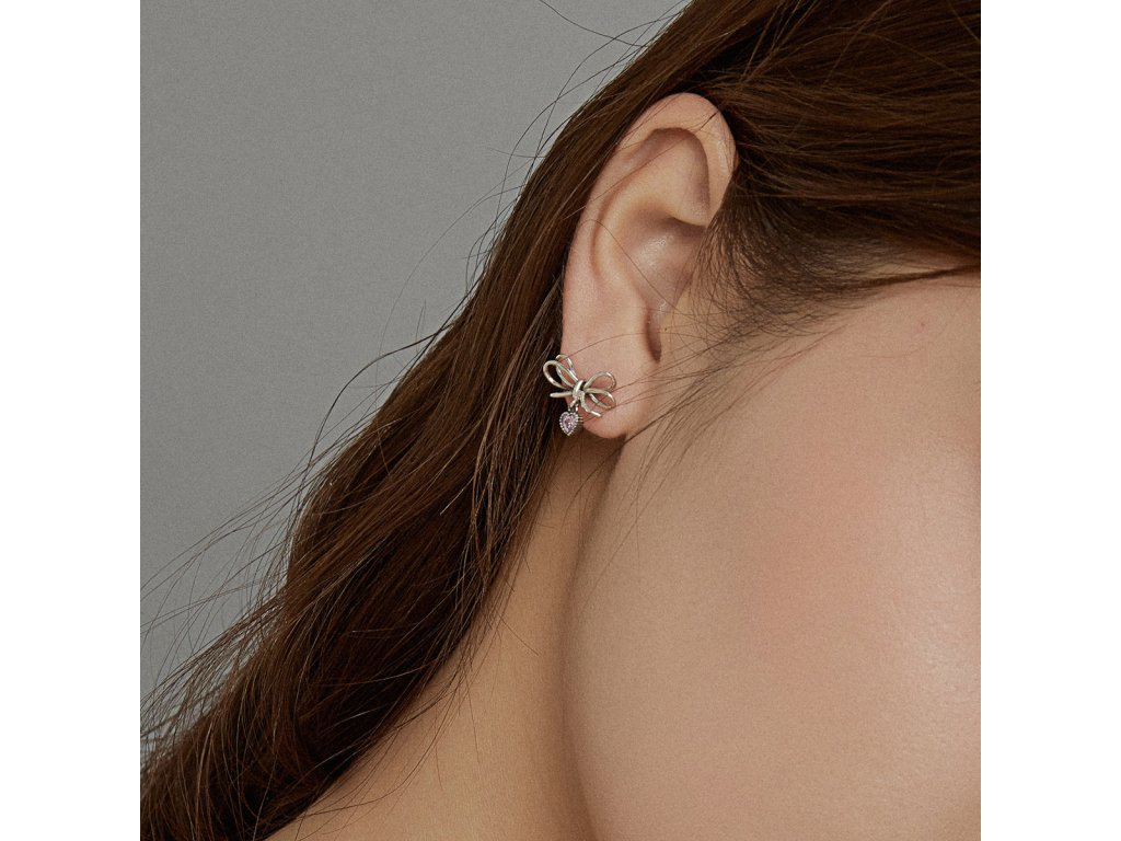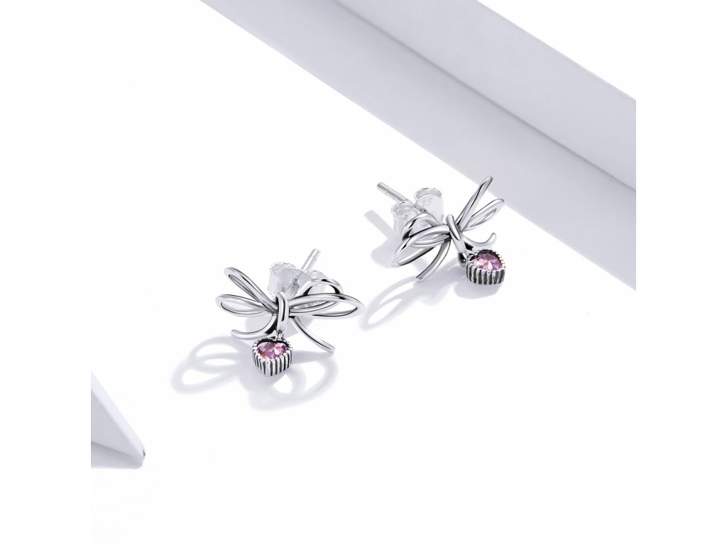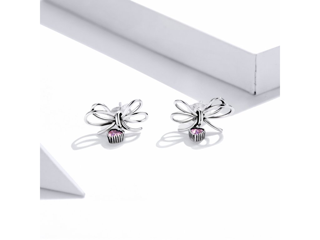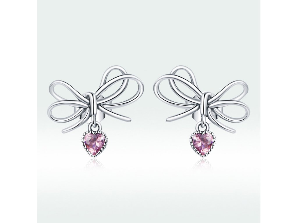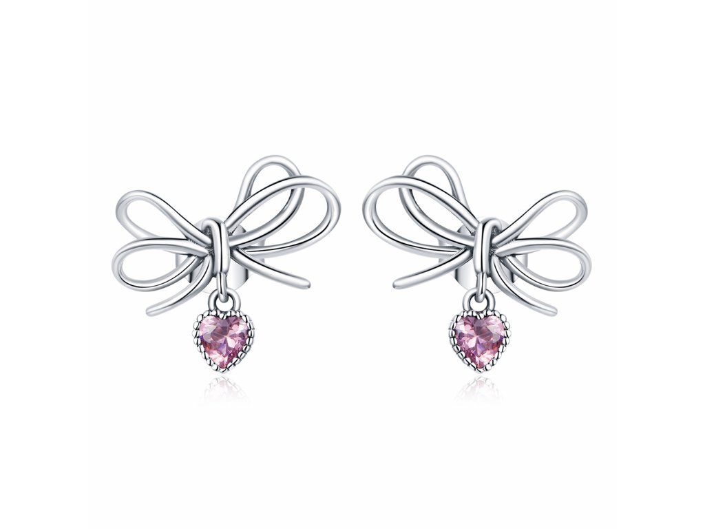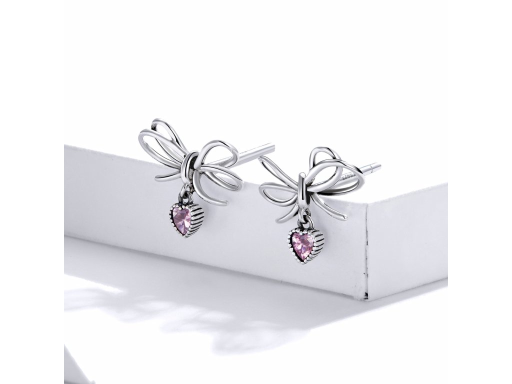 - Stříbrné peckové náušnice v designu krásných mašliček z lásky zdobené srdcovými přívěsky s blyštivými růžovými zirkony. Originální design náušnic, kvalitní zpracování a materiál, ručně dohotovené.