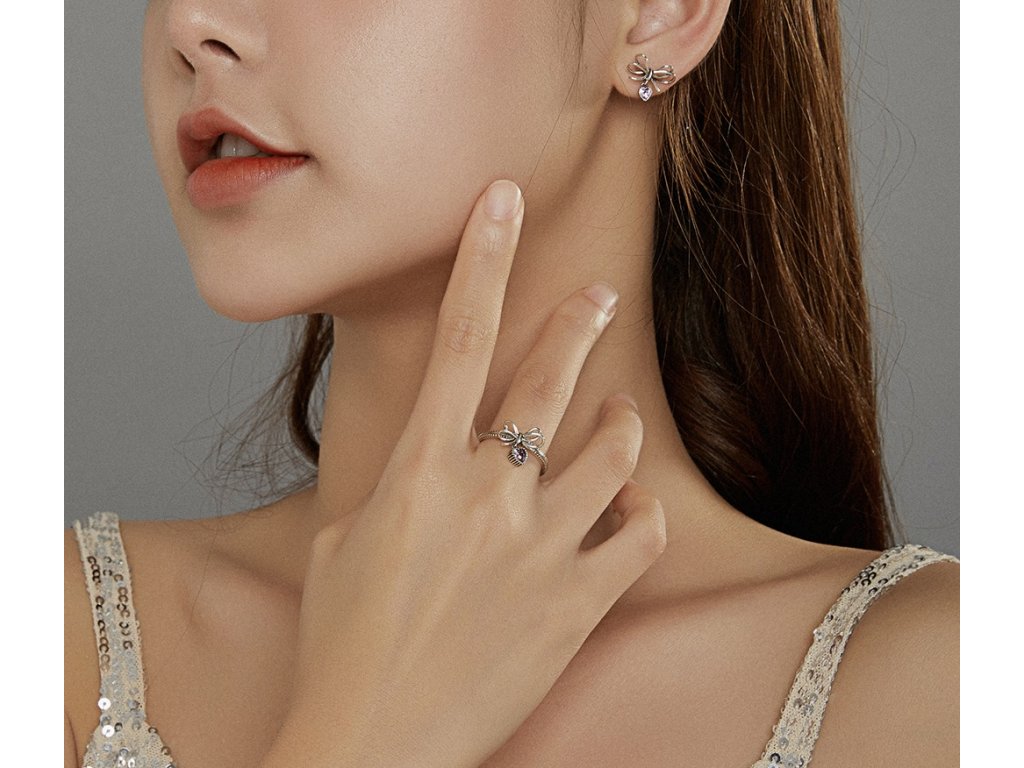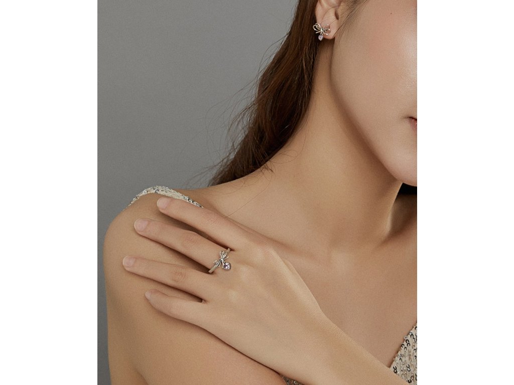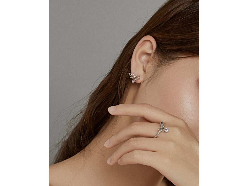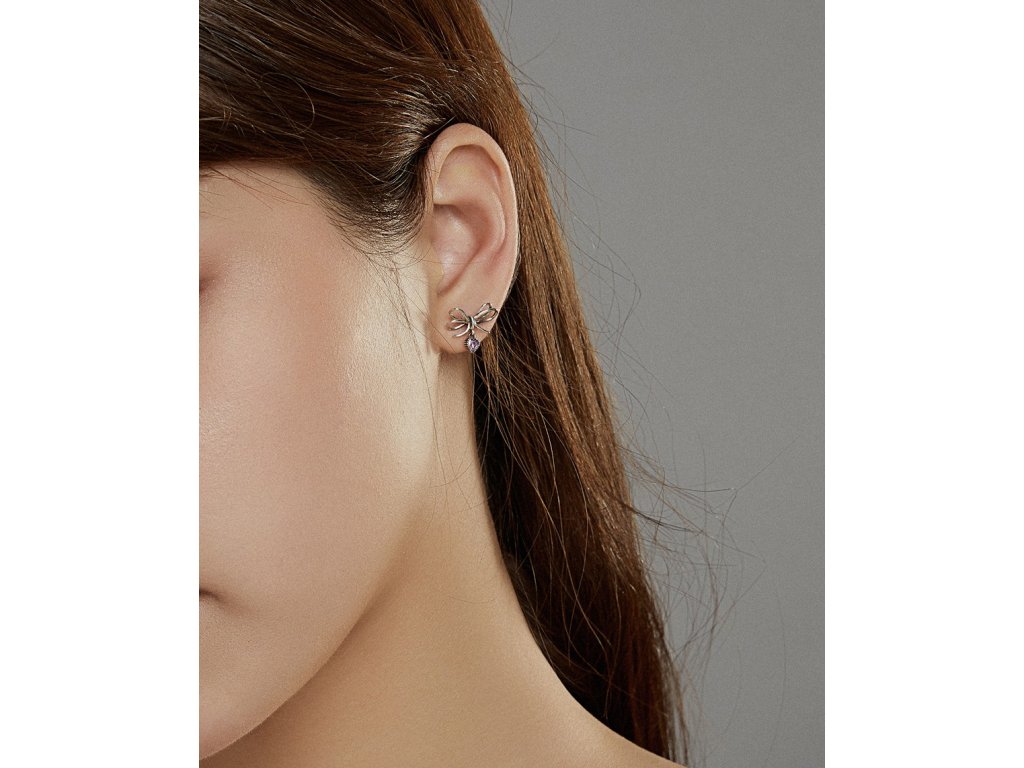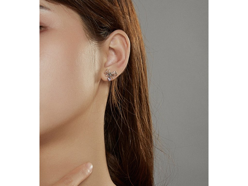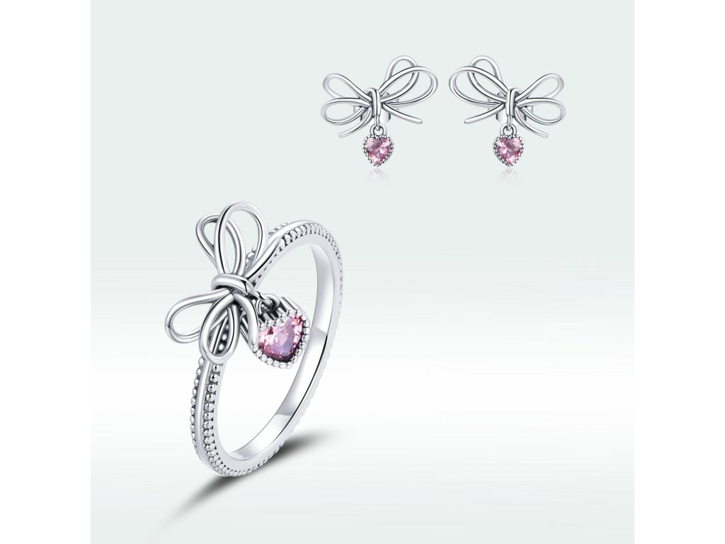 - Stříbrné peckové náušnice v designu krásných mašliček z lásky zdobené srdcovými přívěsky s blyštivými růžovými zirkony. Originální design náušnic, kvalitní zpracování a materiál, ručně dohotovené.