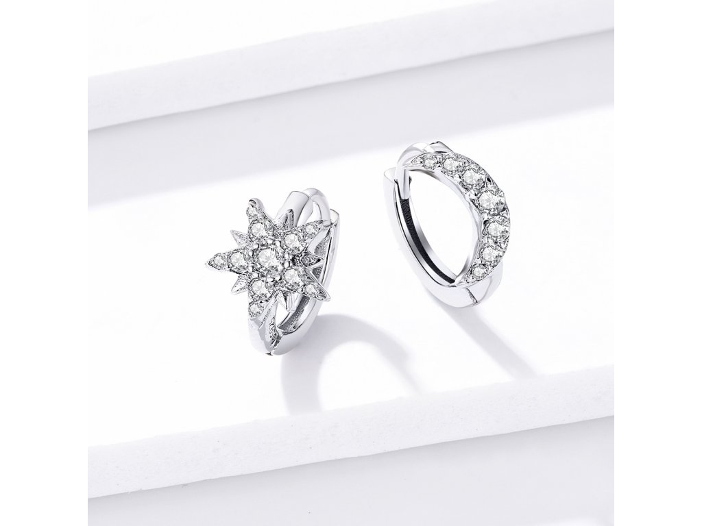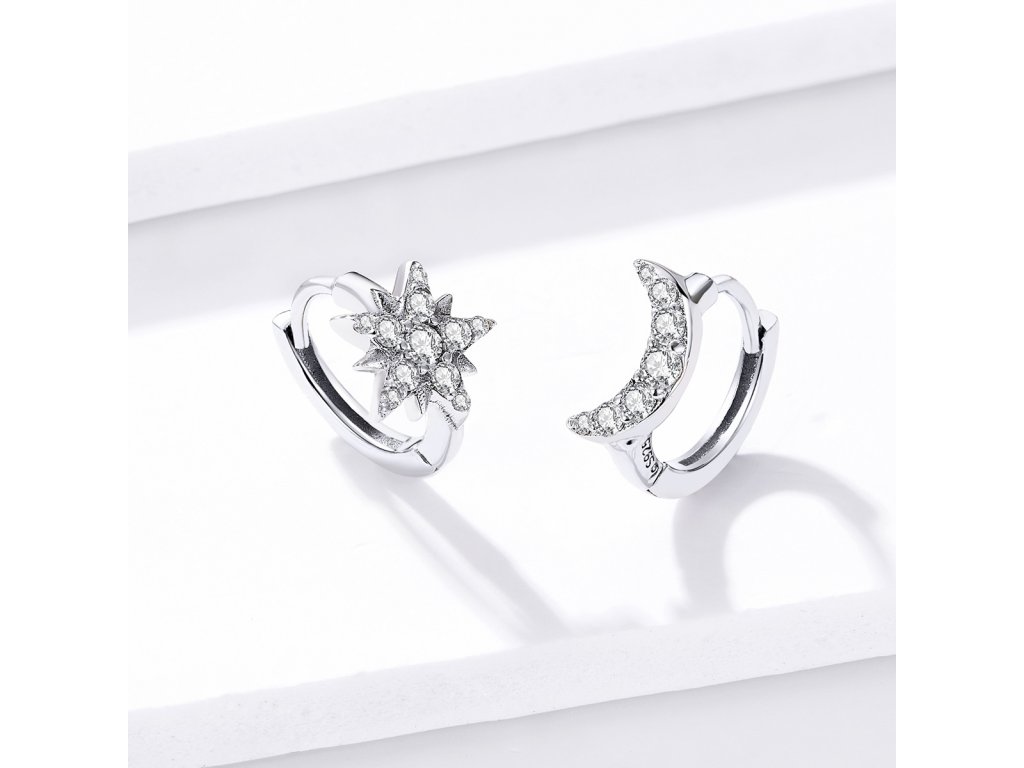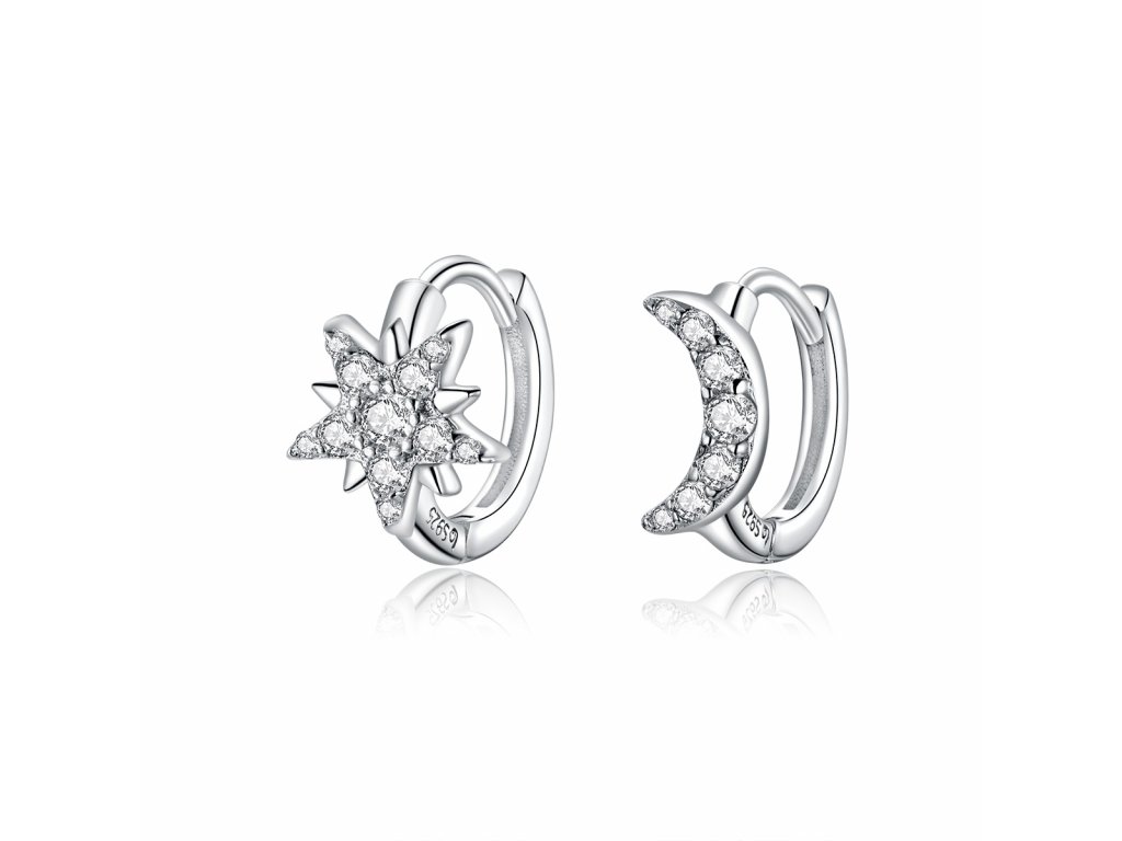 - Stříbrné náušnice Měsíc a hvězda zdobené čirými třpytivými zirkony. Originální design náušnic, kvalitní zpracování a materiál, ručně dohotovené.