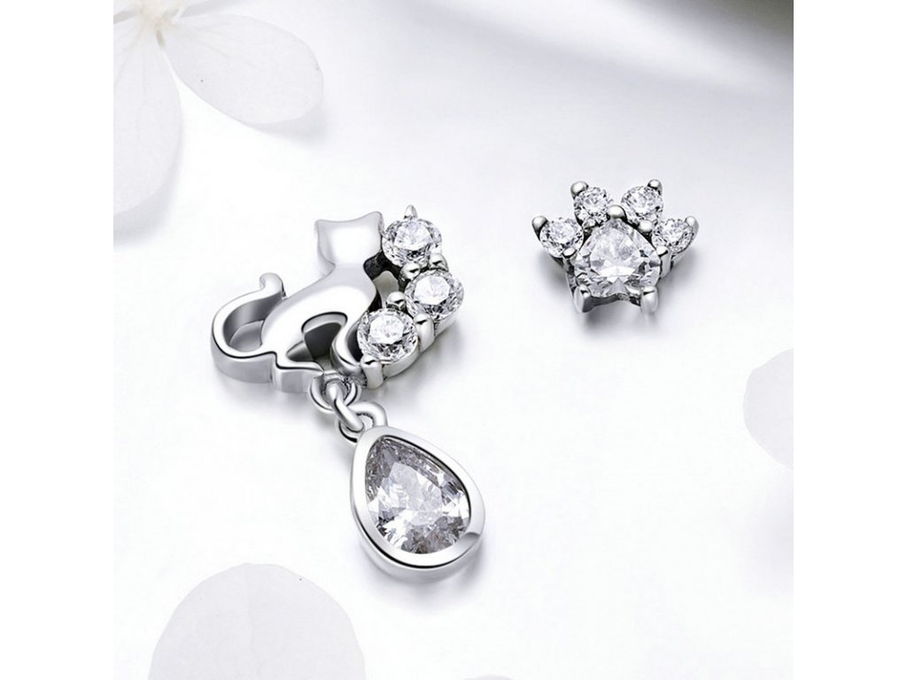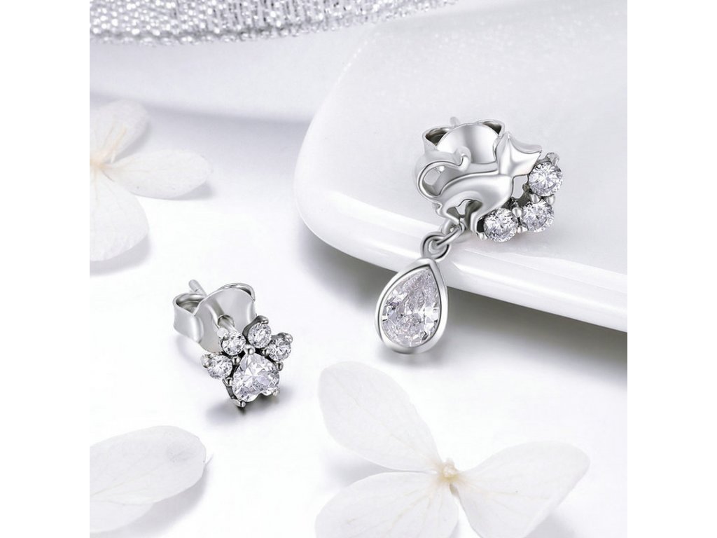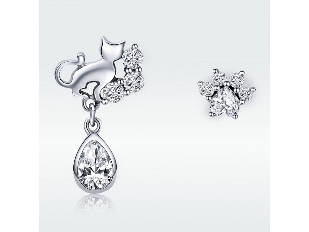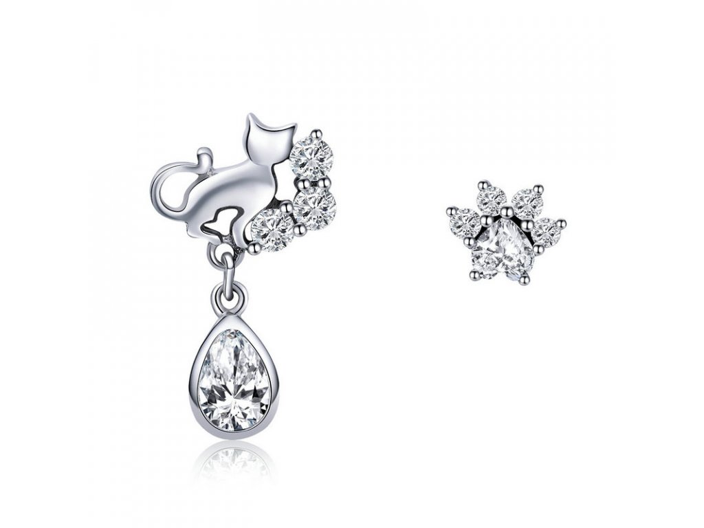 Originální stříbrné náušnice v designu milované kočky, kde jedna náušnice znázorňuje siluetu kočky a druhá kočičí tlapky/packy s posázenými zirkony. Originální design náušnic, kvalitní zpracování a materiál, ručně dohotovené. Slaďte náušnice s ostatními šperky značky Royal Fashion a vytvořte tak neodolatelný set.