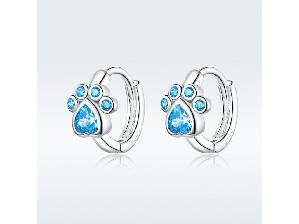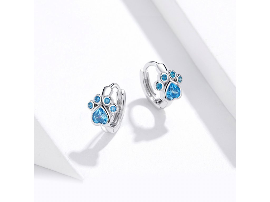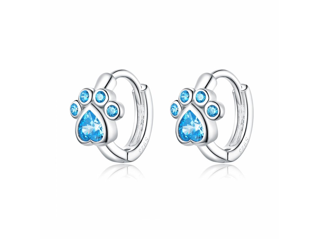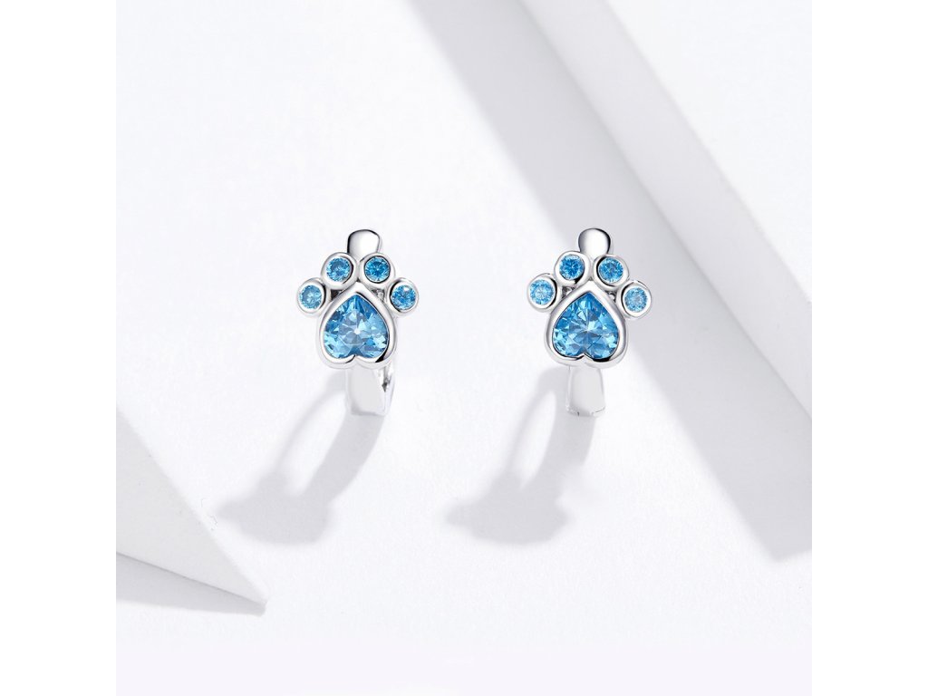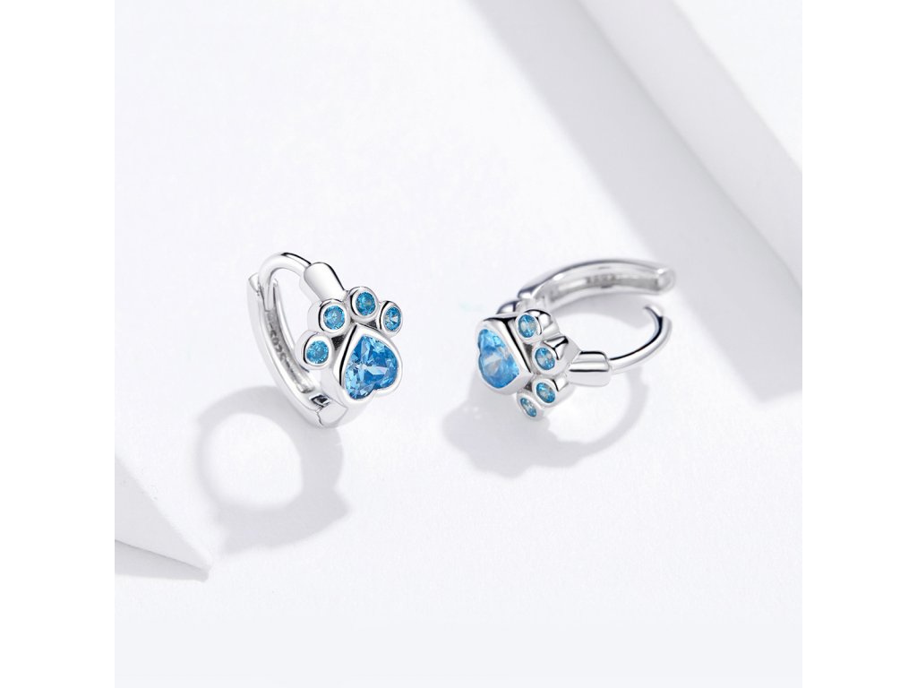 - Stříbrné náušnice v designu packy zdobeného ručně posázenými modrými třpytivými zirkony. Originální design náušnic, kvalitní zpracování a materiál, ručně dohotovené.