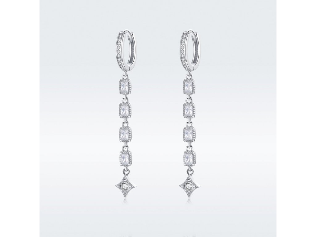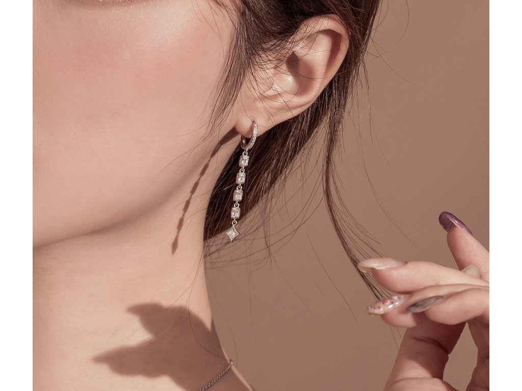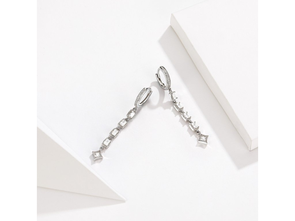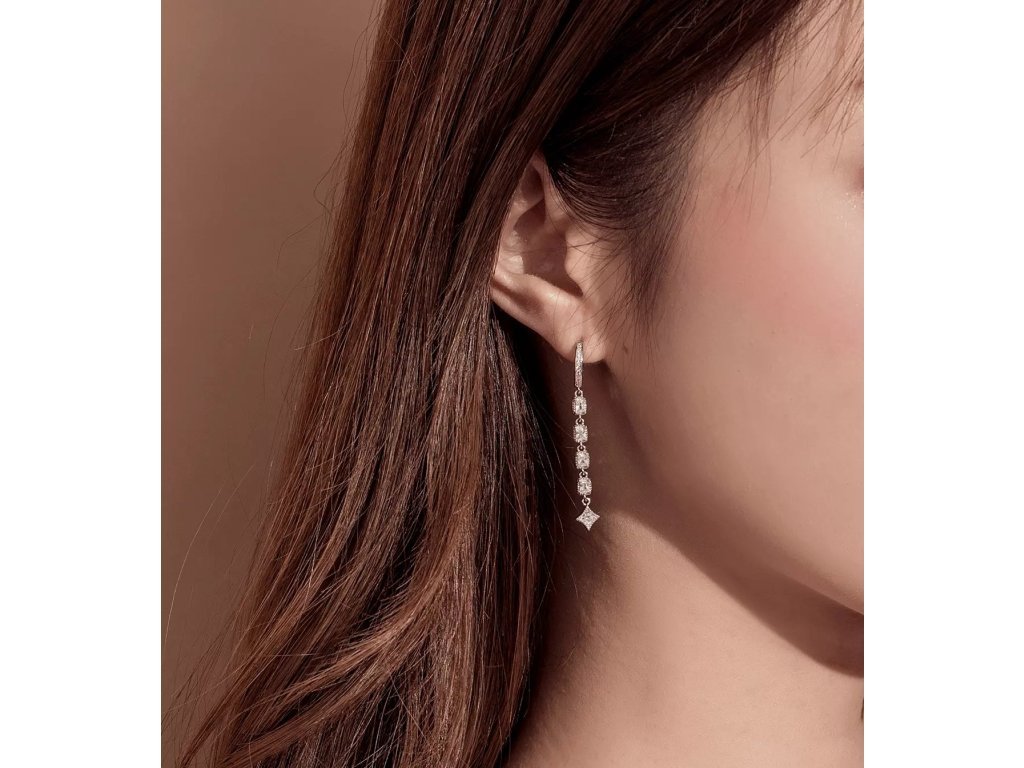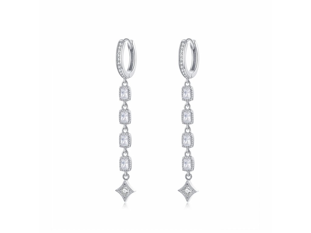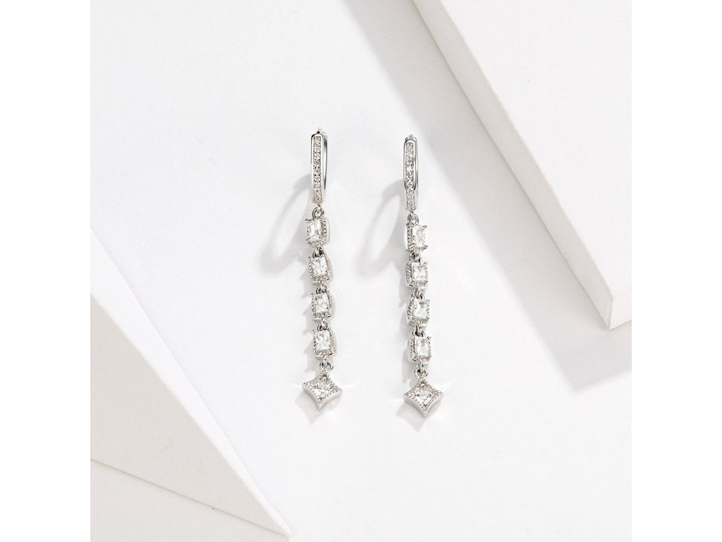 - Stříbrné dlouhé náušnice v designu Princeznin klenot zdobené čirými kameny v podobě zirkonů. Originální design náušnic, kvalitní zpracování a materiál, ručně dohotovené.