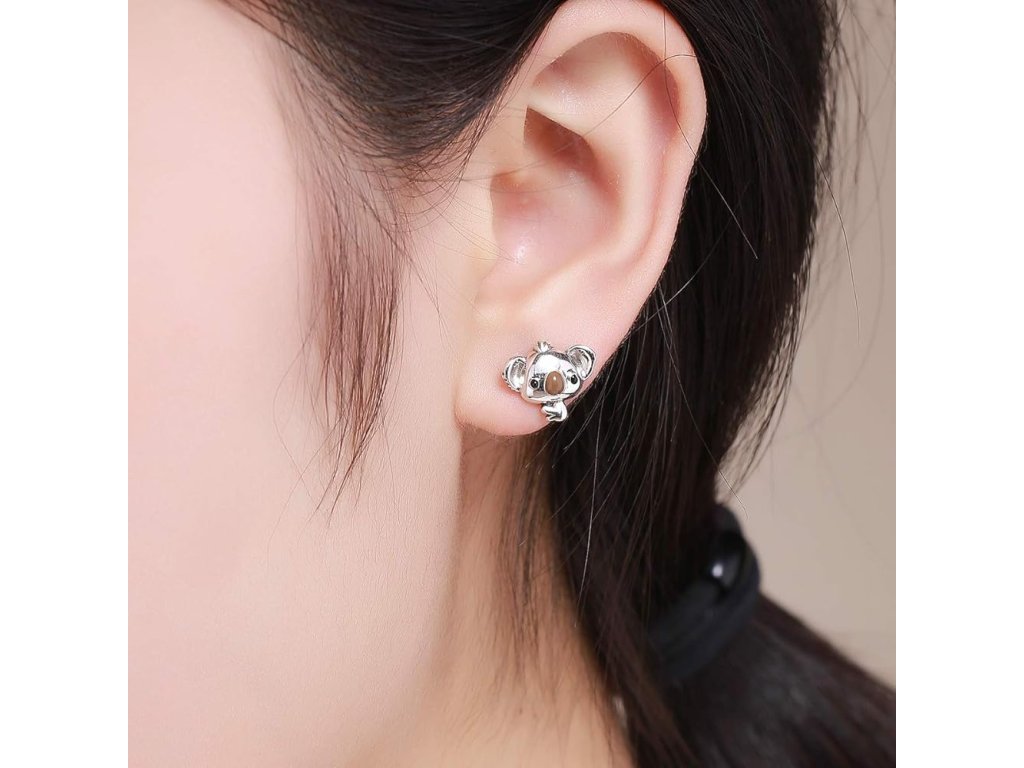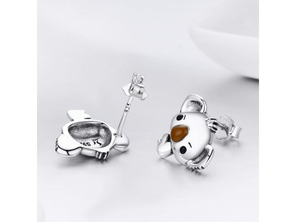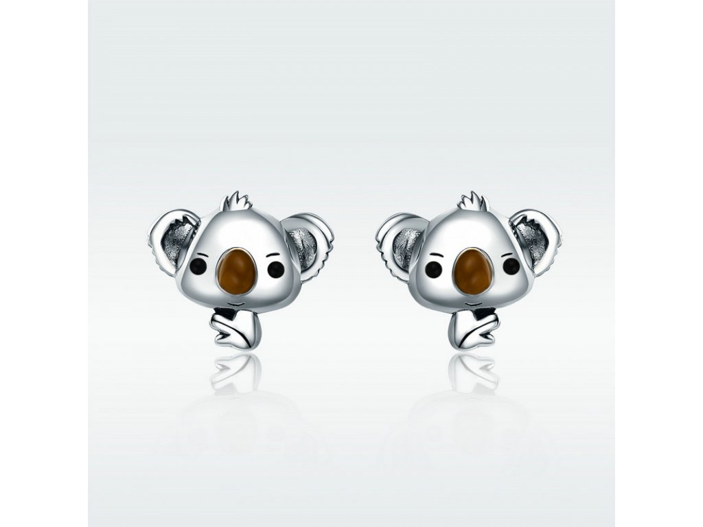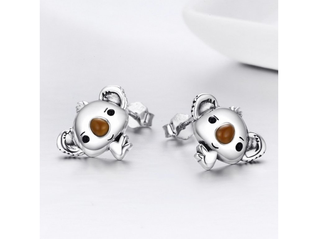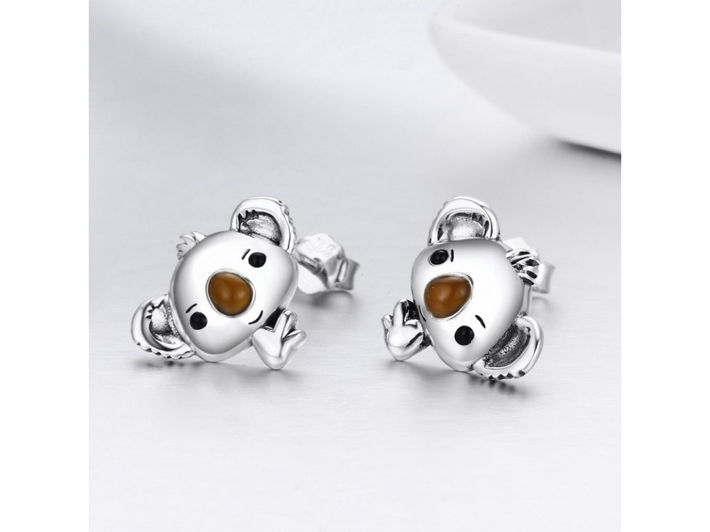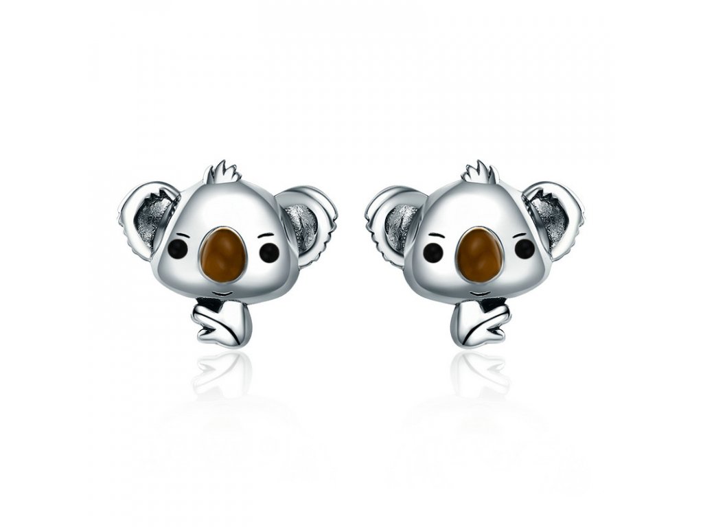 Stříbrné propracované peckové náušnice v designu roztomilé koaly zdobené ručně nanášenou glazurou.