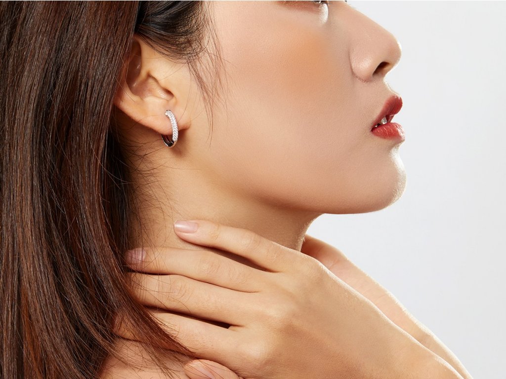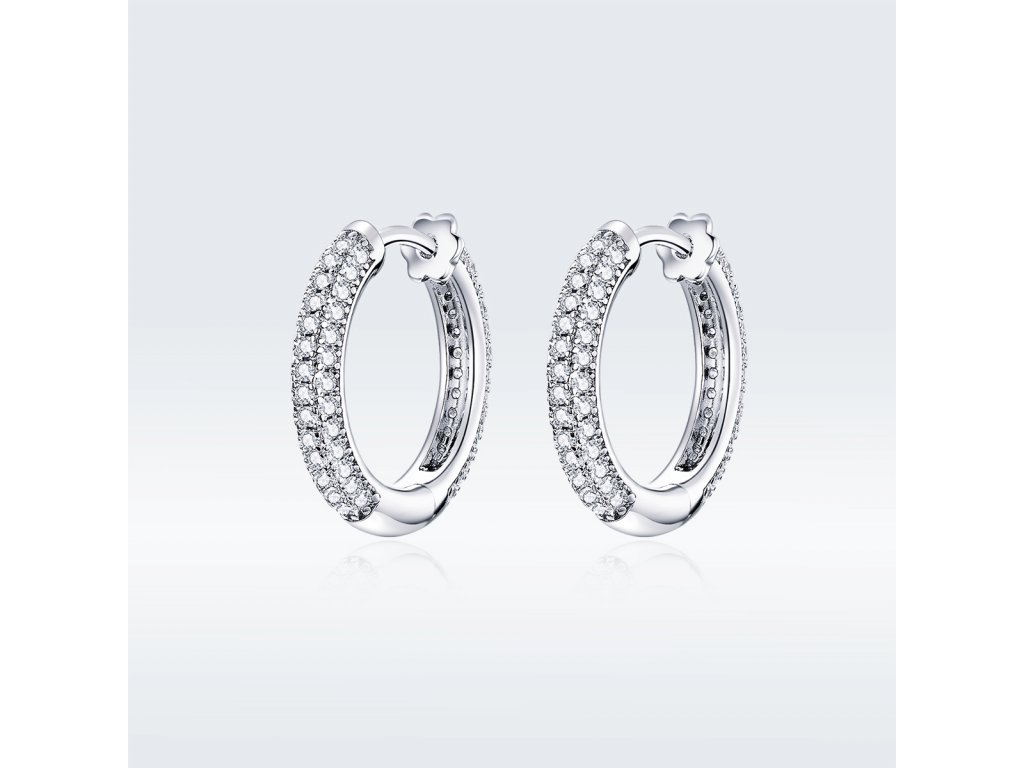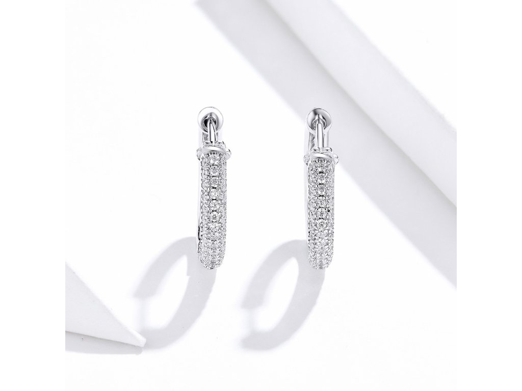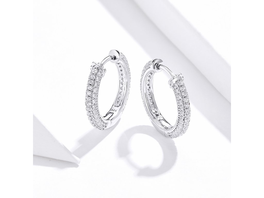 - Stříbrné náušnice Třpytivé kroužky zdobené čirými zirkony. Originální design náušnic, kvalitní zpracování a materiál, ručně dohotovené.