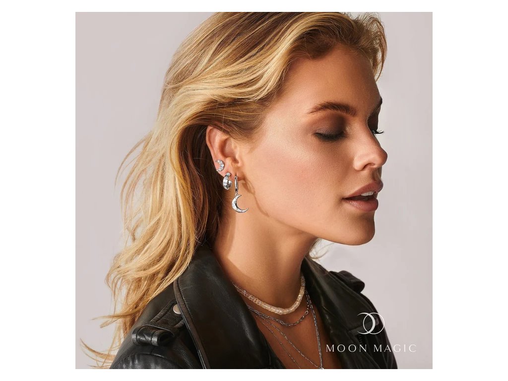 - Luxusní stříbrné rhodiované visací náušnice v designu měsíce obohacené měsíčními duhovými drahokamy Moonstony a čirými třpytivými drahokamy topazy. Originální design náušnic, kvalitní zpracování a materiál, ručně dohotovené.