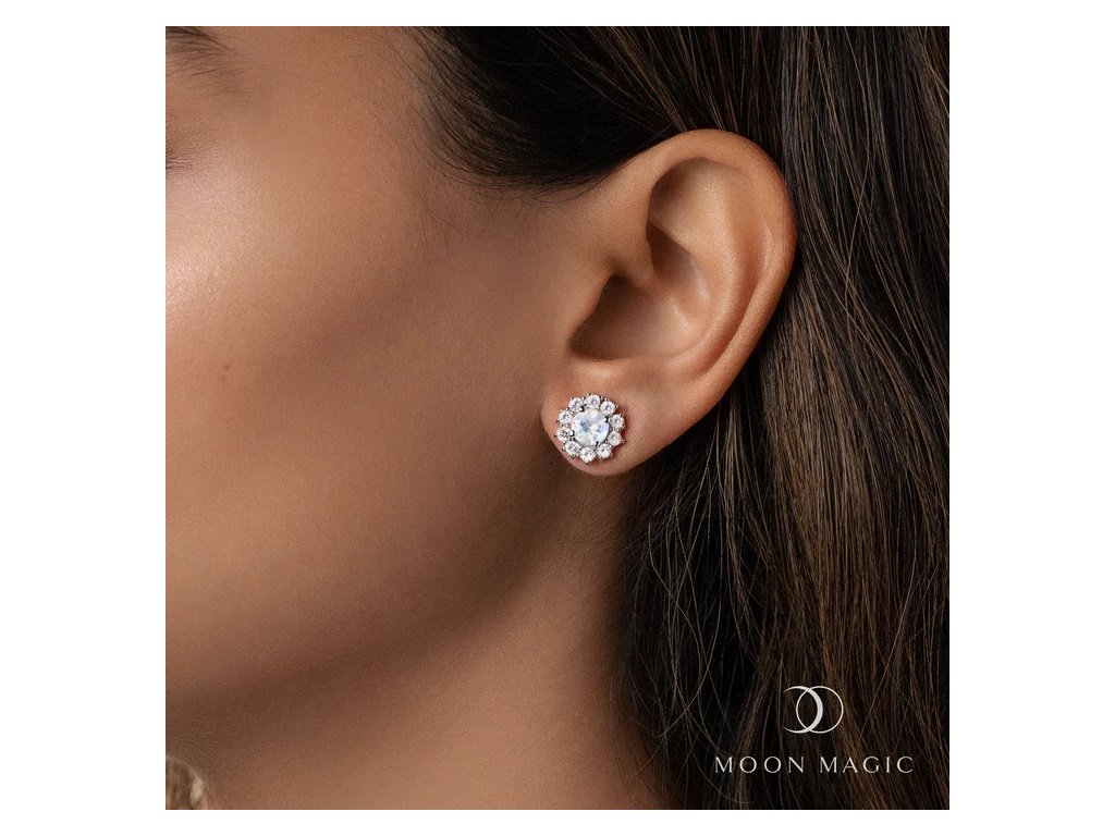 - Luxusní stříbrné rhodiované peckové náušnice v designu květů obohacené měsíčním duhovým drahokamem Moonstonem a čirými třpytivými drahokamy topazy. Originální design náušnic, kvalitní zpracování a materiál, ručně dohotovené.