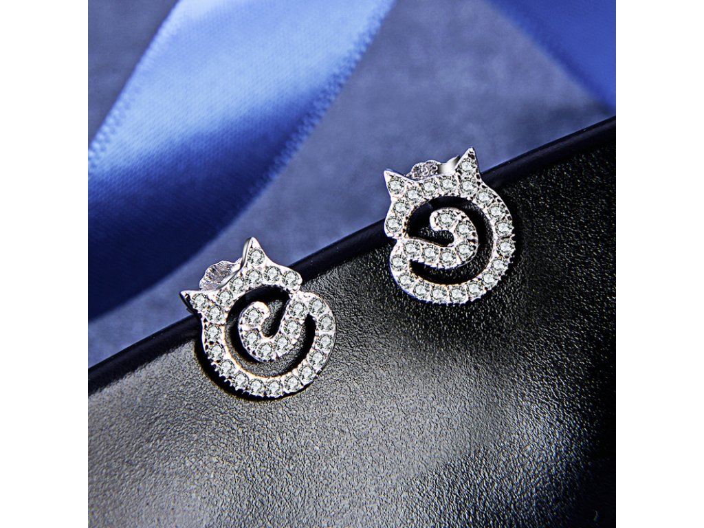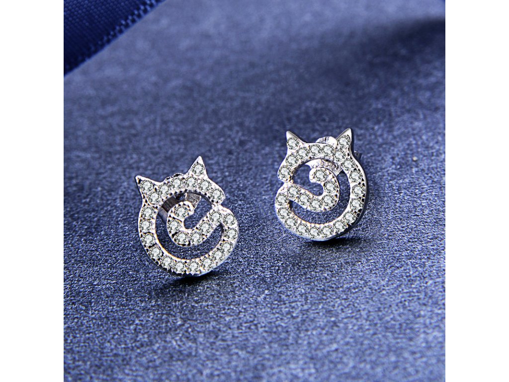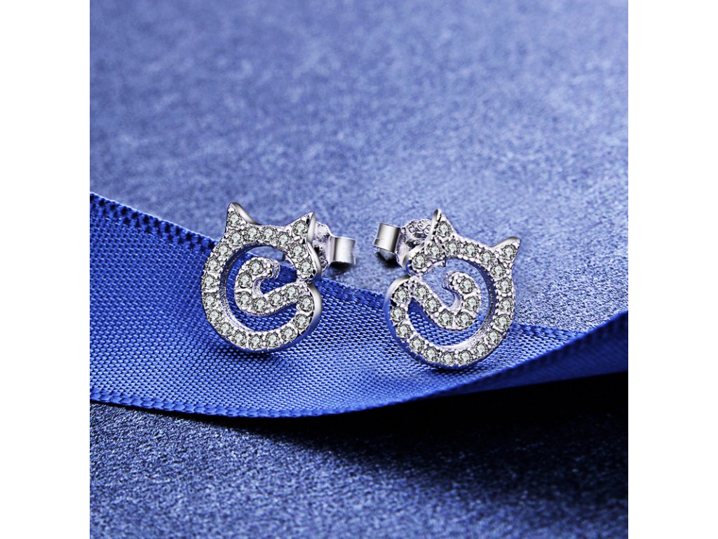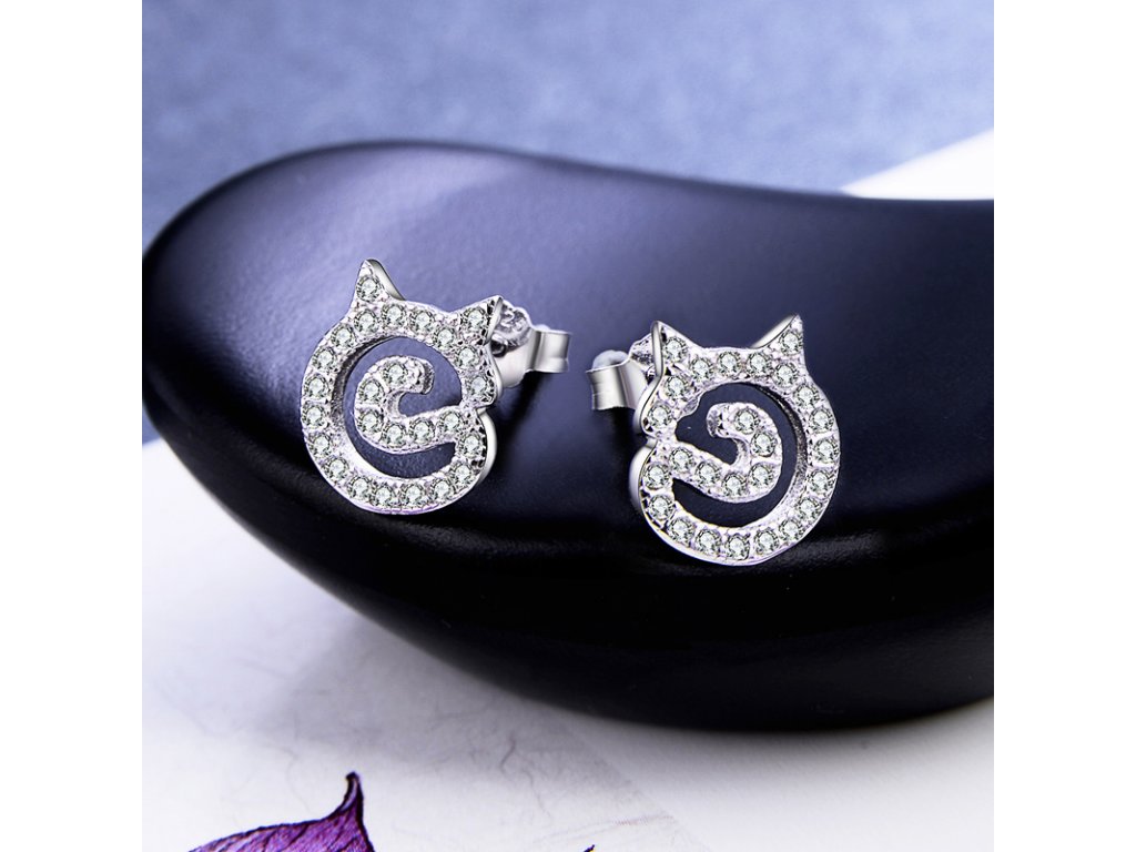 - Stříbrné peckové a elegantní náušnice v designu milovaných kočiček zdobených čirými třpytivými zirkony. Originální design náušnic, kvalitní zpracování a materiál, ručně dohotovené.