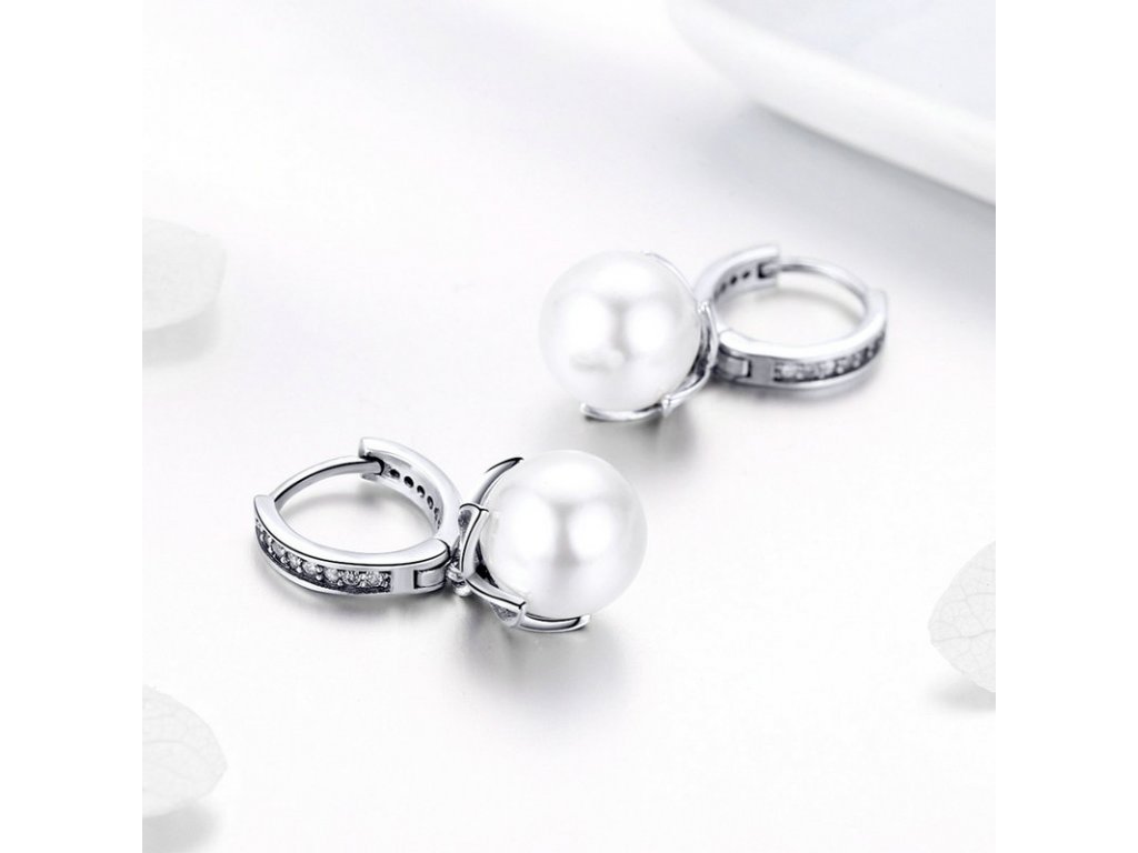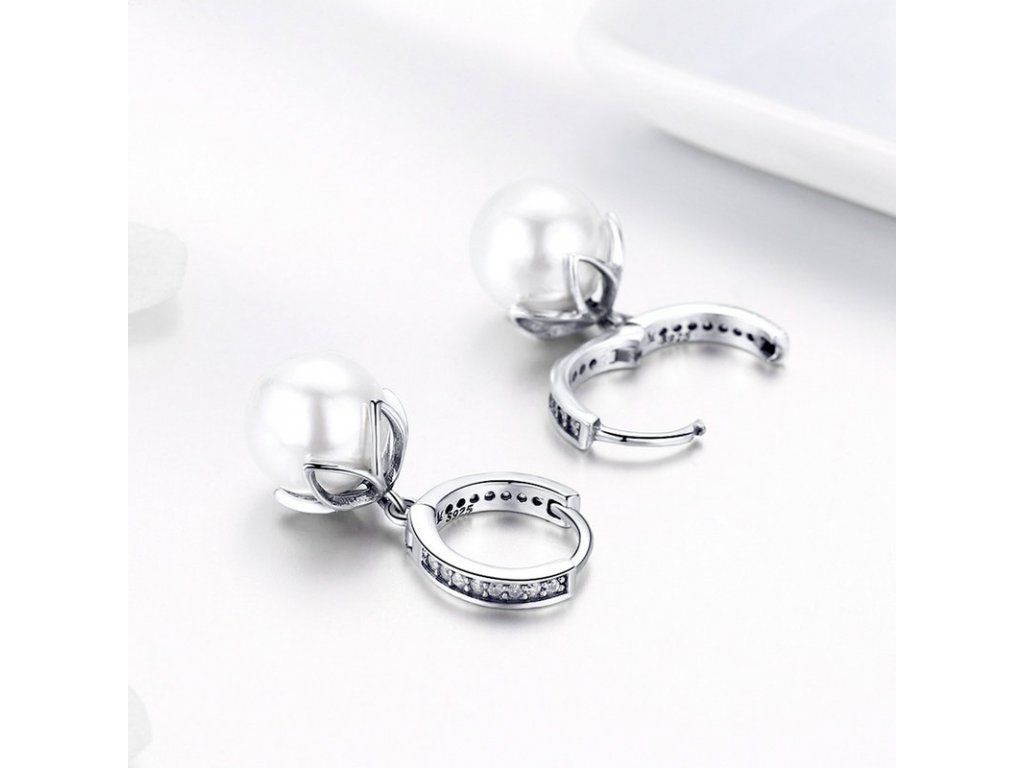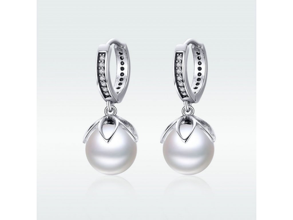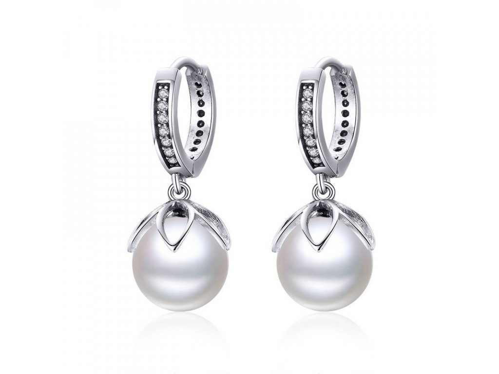 Luxusní stříbrné náušnice obohacené perlou a očko náušnic je posázeno třpytivými zirkony. Originální design náušnic, kvalitní zpracování a materiál, ručně dohotovené.