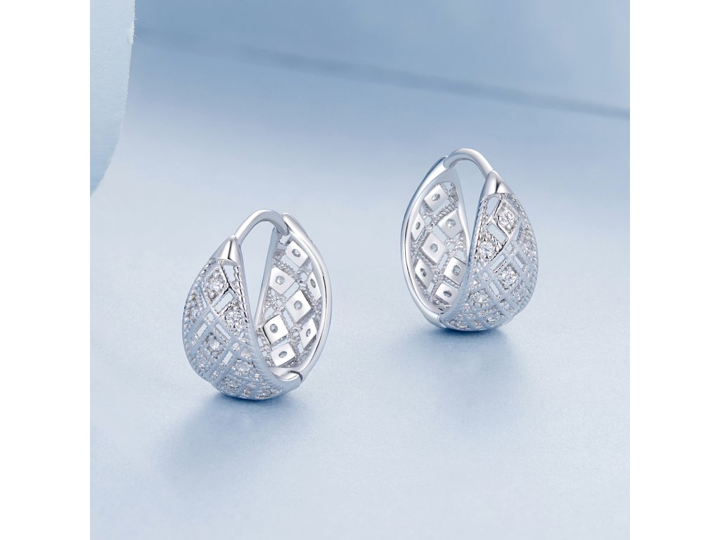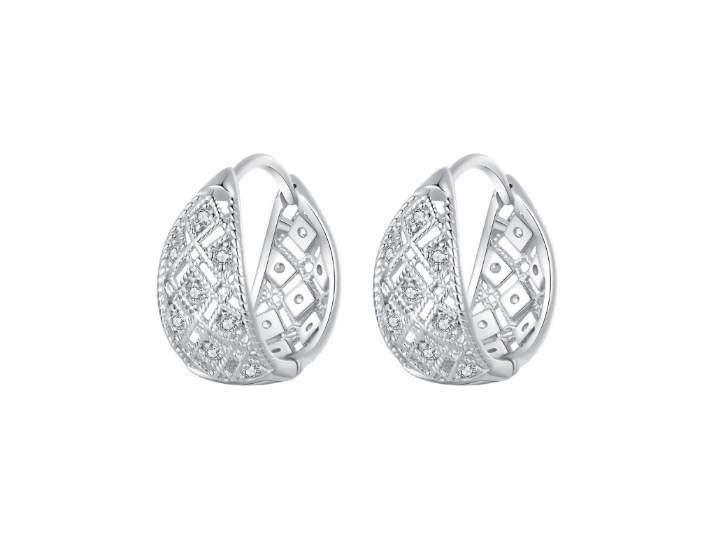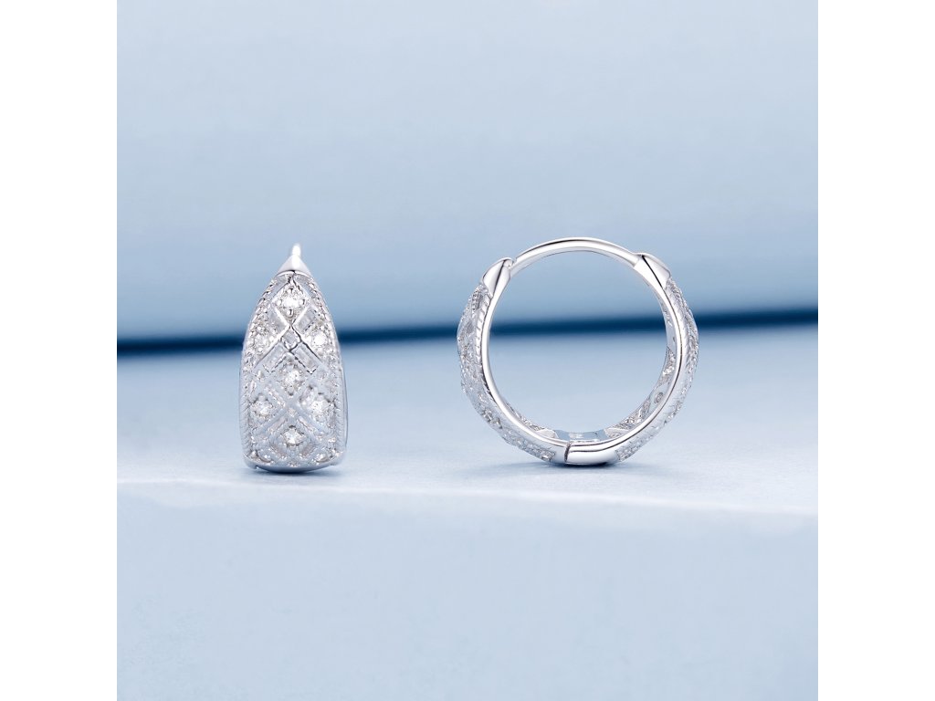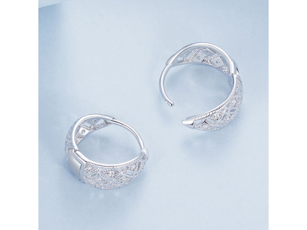 - Stříbrné náušnice kroužky s motivem krajky zdobené čirými třpytivými zirkony. S originálním designem a precizním zpracováním. Vyrobené z kvalitního sterlingového stříbra, doplněné o ručně dokončované detaily, které zajišťují jedinečnost každého kusu.
