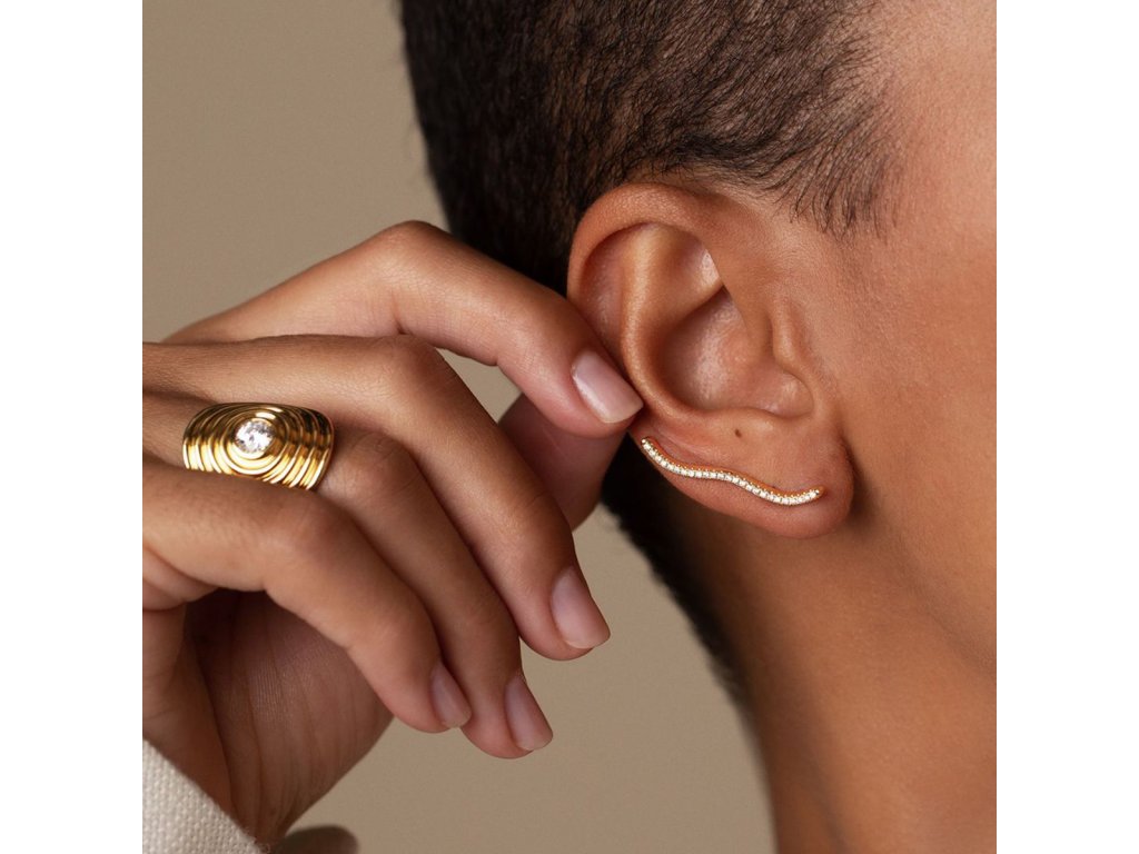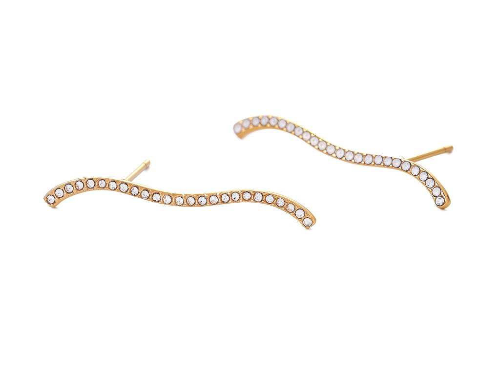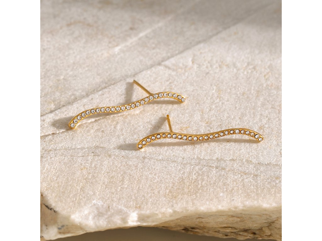 Jemná linie vlny, zdobená skleněnými krystalky, působí jako pohyb světla na hladině. Tyto náušnice přináší minimalistickou eleganci, která se hodí pro každý den i speciální příležitost.