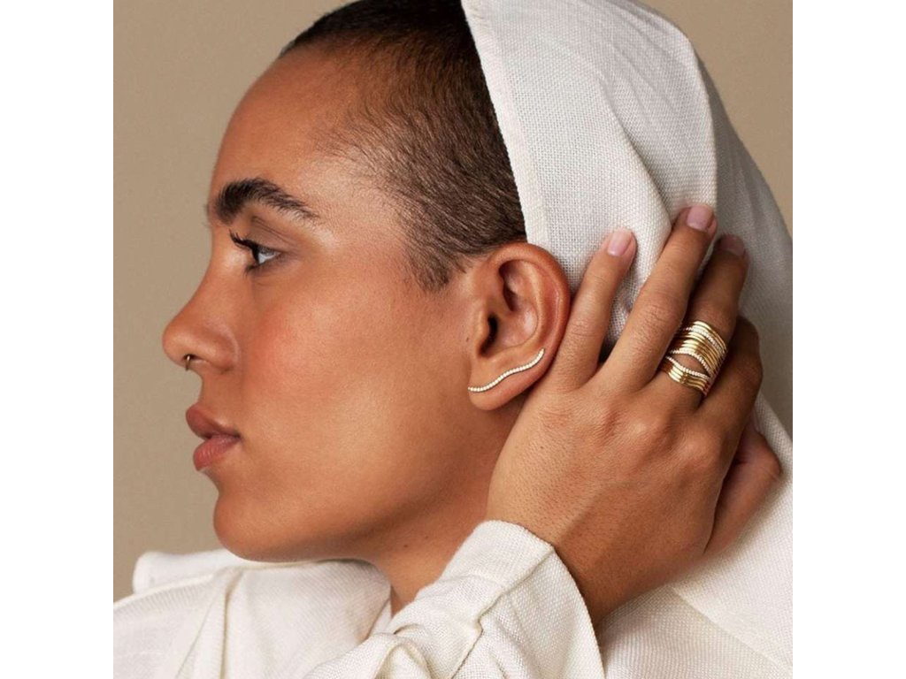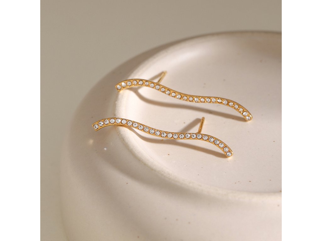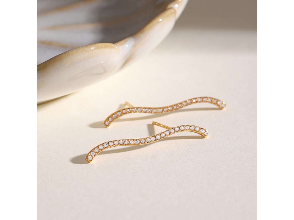 Jemná linie vlny, zdobená skleněnými krystalky, působí jako pohyb světla na hladině. Tyto náušnice přináší minimalistickou eleganci, která se hodí pro každý den i speciální příležitost.