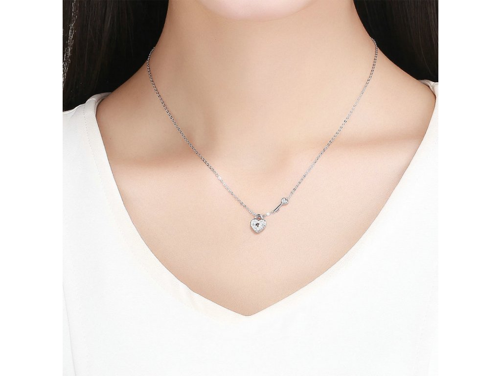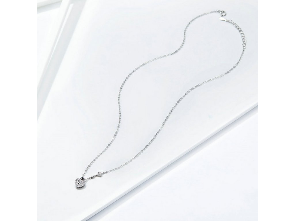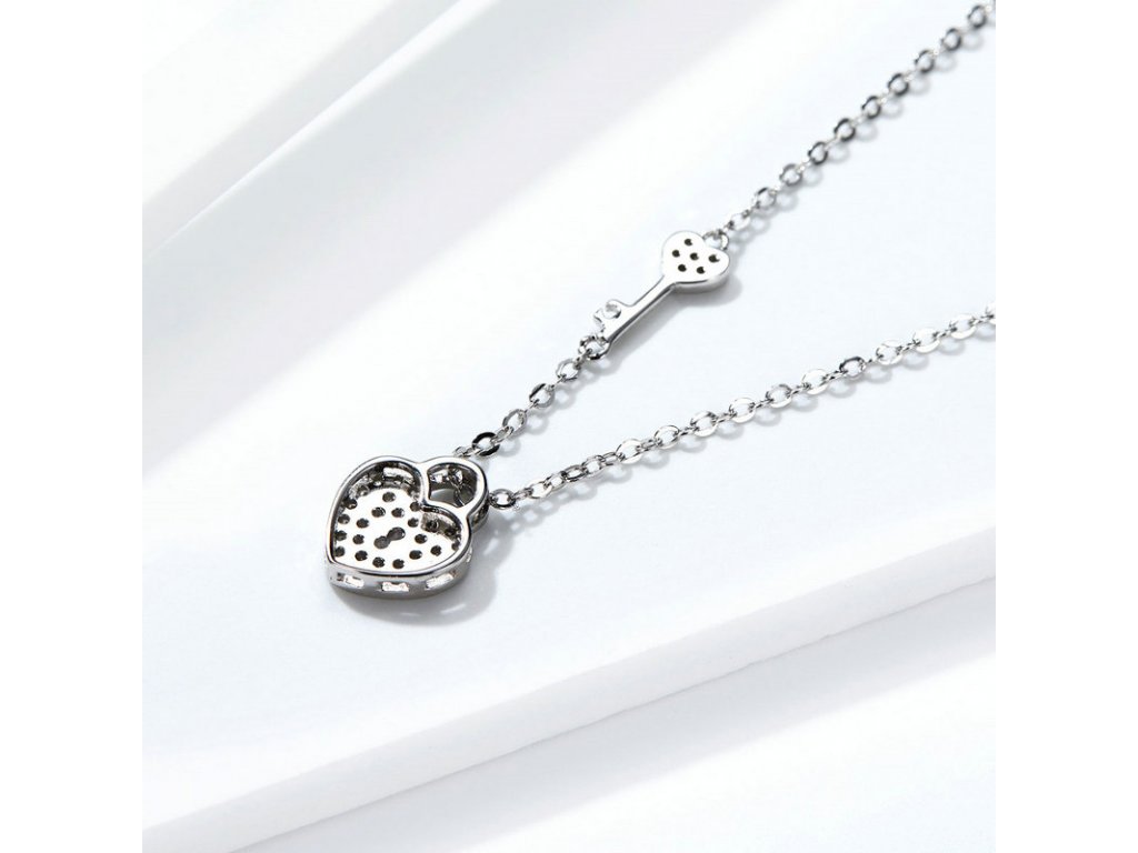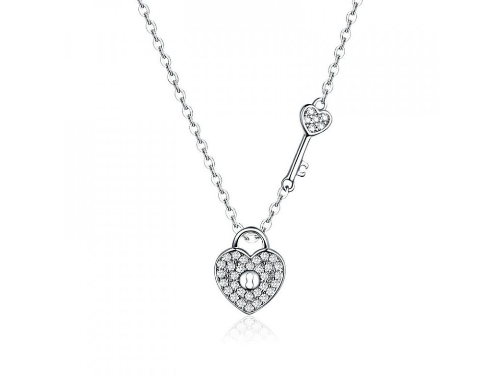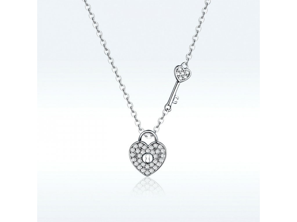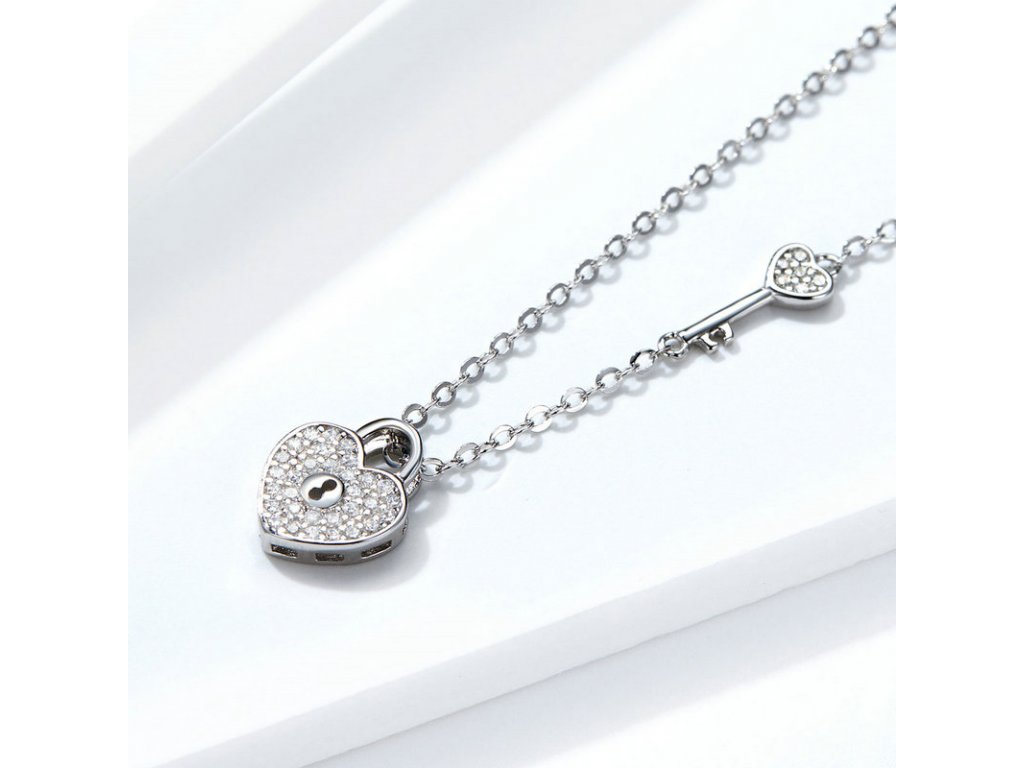 Elegantní stříbrný náhrdelník zvýrazňující pouto v podobě klíče a zámku ve tvaru srdce s posázenými třpytivými zirkony. Očko přívěsku je dekorováno jemnými třpytivými zirkony. Originální design náhrdelníku, kvalitní zpracování a materiál, ručně dohotovené.
