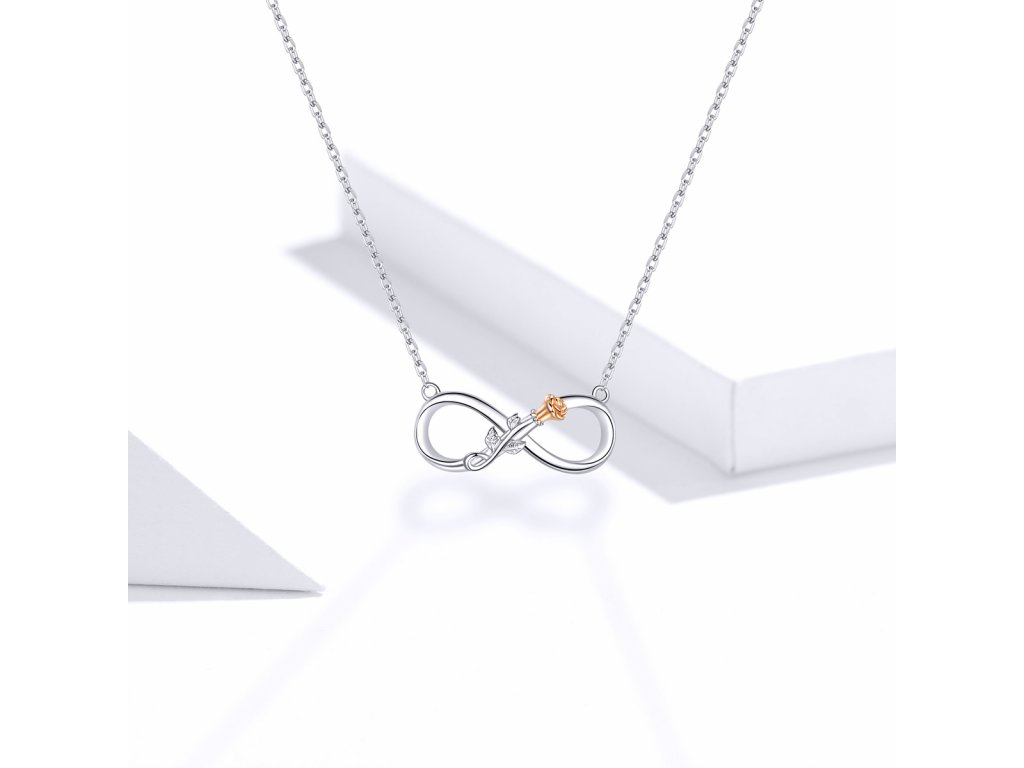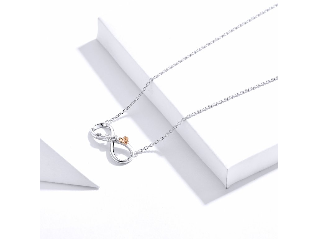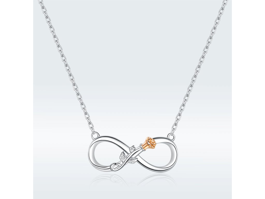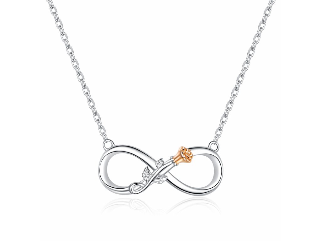 Stříbrný náhrdelník v designu Symbolu nekonečné lásky zdobený krásnou růží. Originální design náhrdelníku, kvalitní zpracování a materiál, ručně dohotovené.