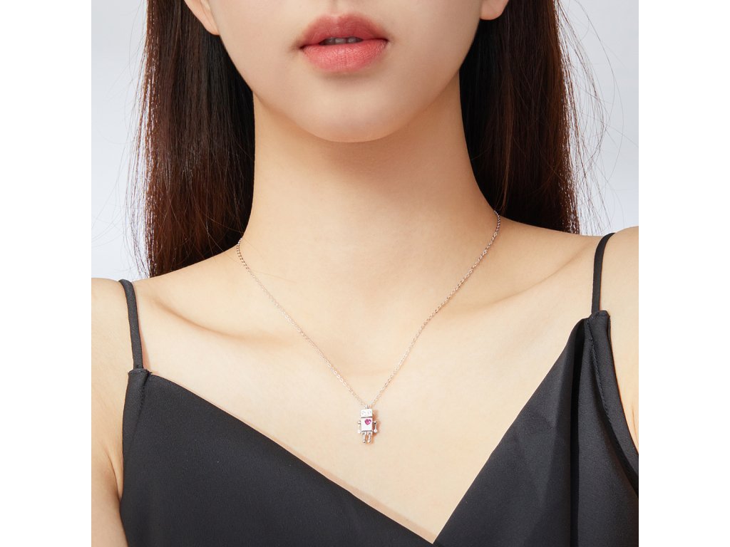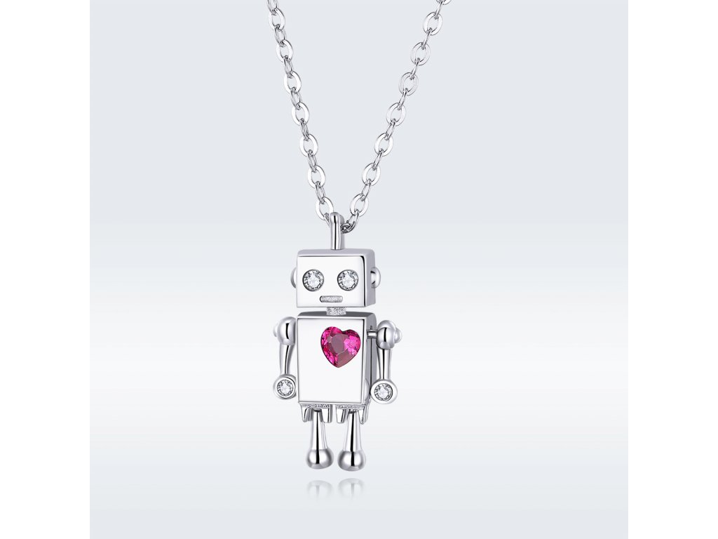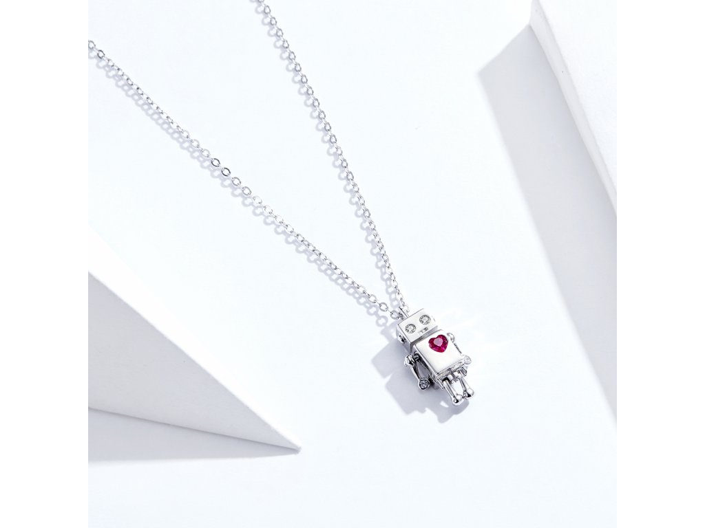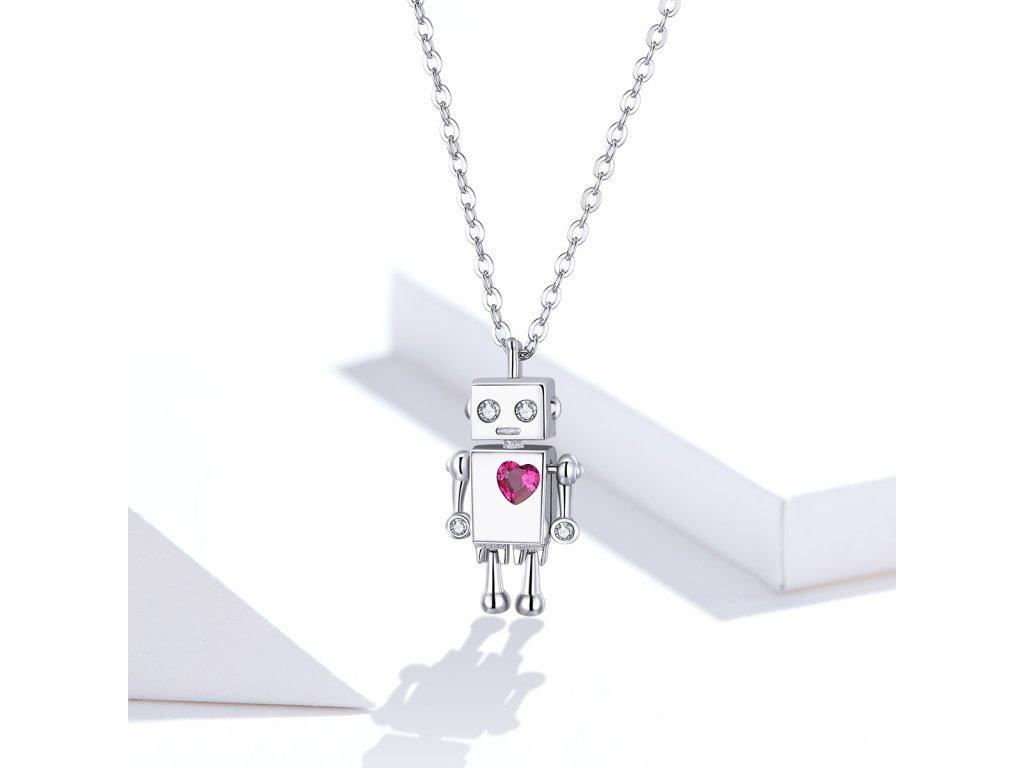 - Stříbrný náhrdelník v designu Zamilovaného robota zdobeného třešňově červeným zirkonem ve tvaru srdce. Originální design náhrdelníku, kvalitní zpracování a materiál, ručně dohotovené.