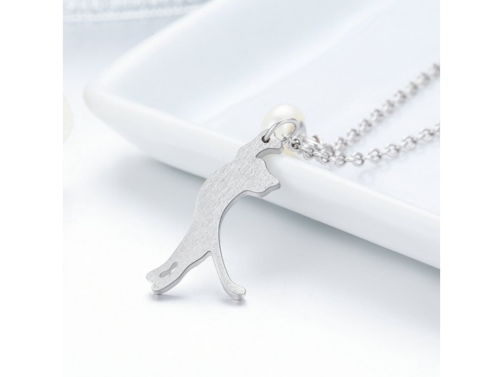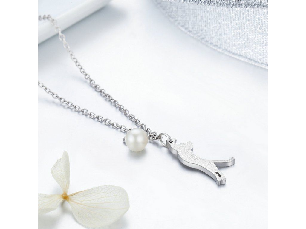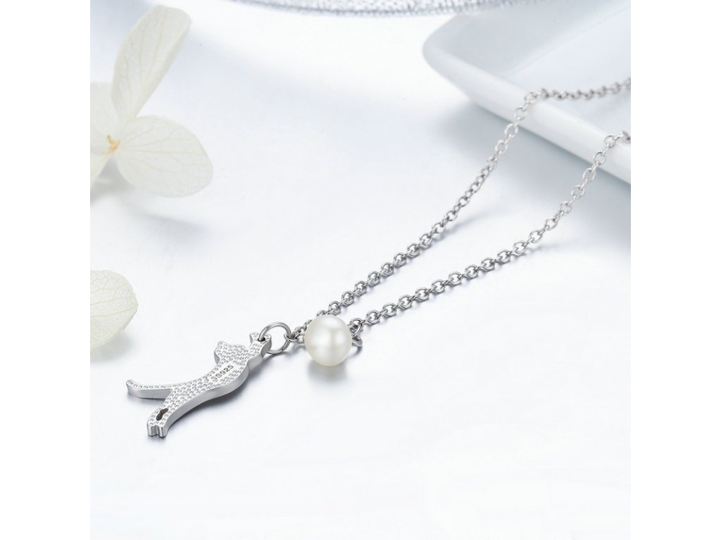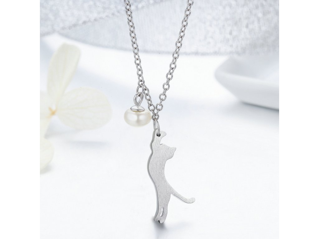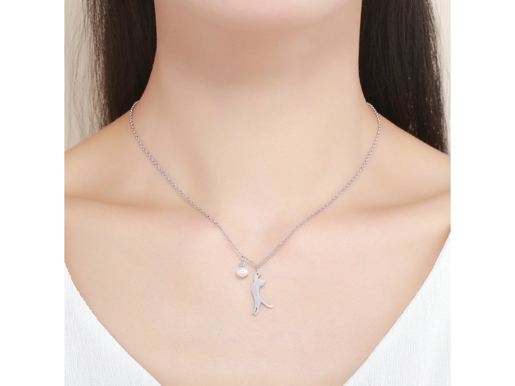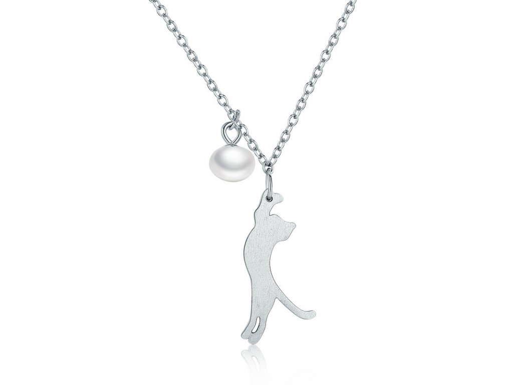 Luxusní a propracovaný náhrdelník z kvalitního stříbra v designu hravé kočky s klubkem v podobě jemné perly.