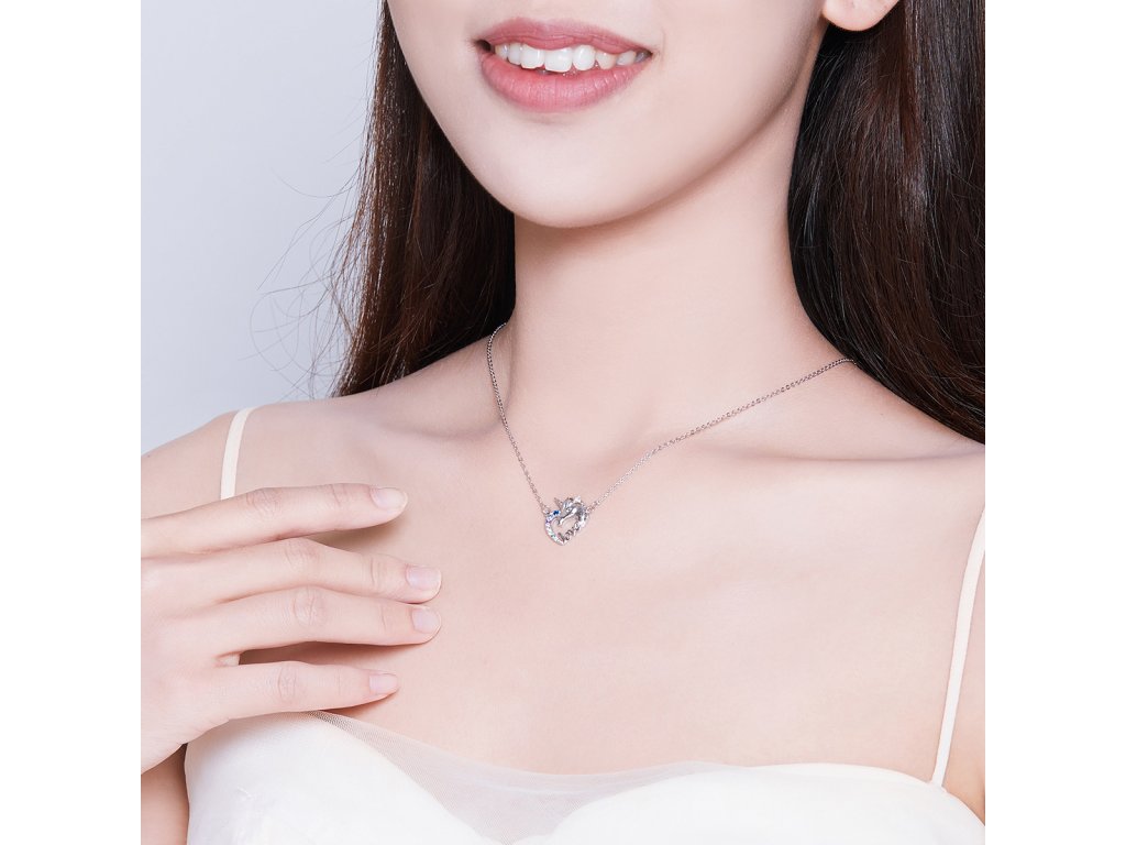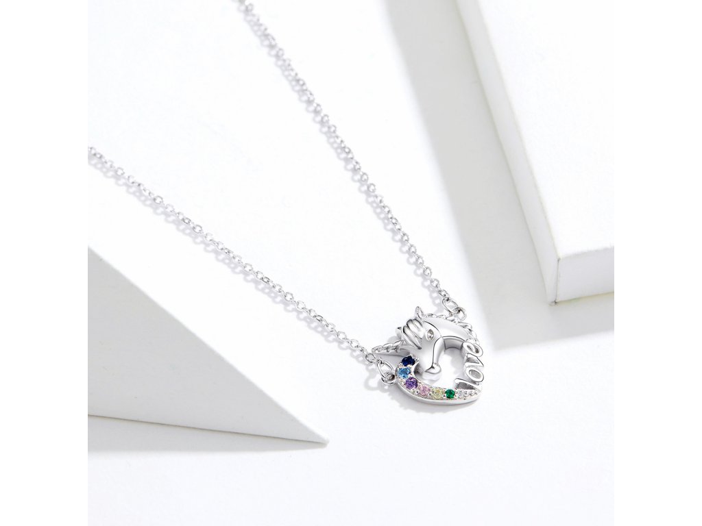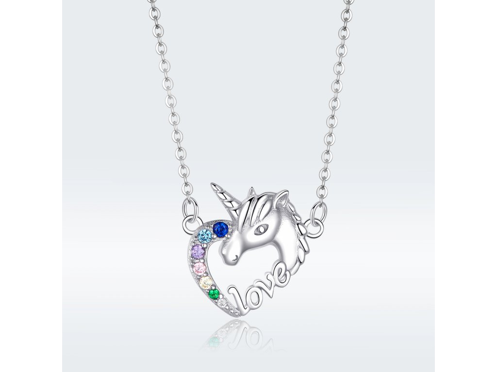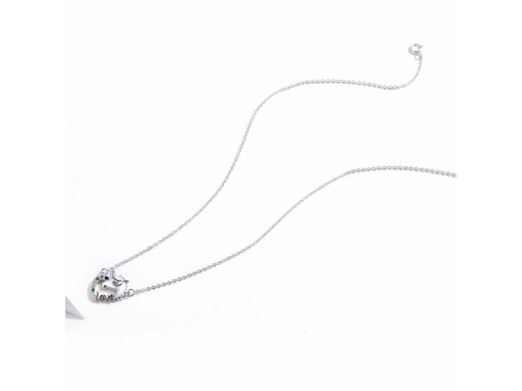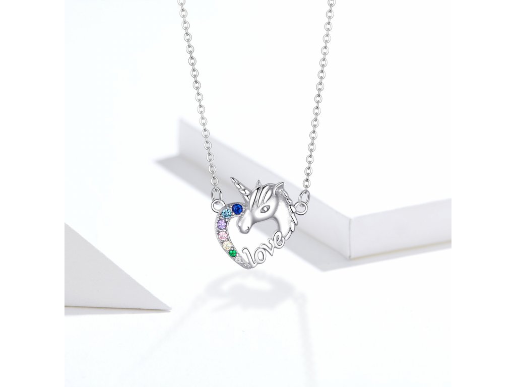 - Stříbrný náhrdelník v designu Jednorožce Unicorna zdobeného barevnými třpytivými zirkony a anglickým nápisem "love" v překladu "láska". Originální design náhrdelníku, kvalitní zpracování a materiál, ručně dohotovené.
