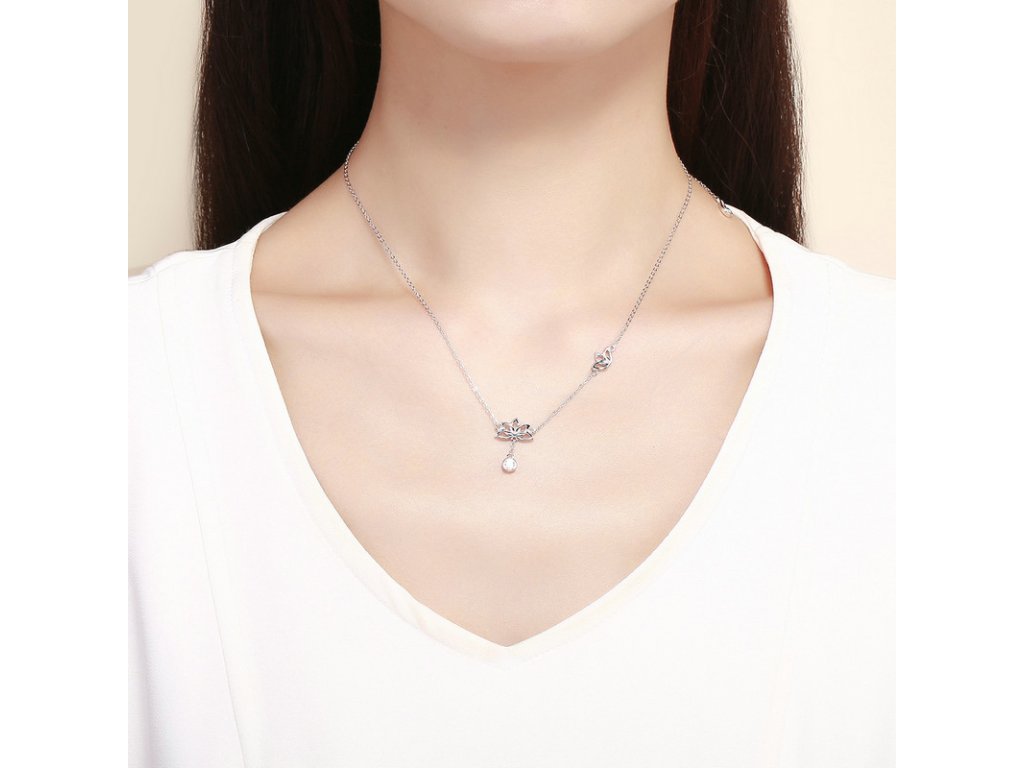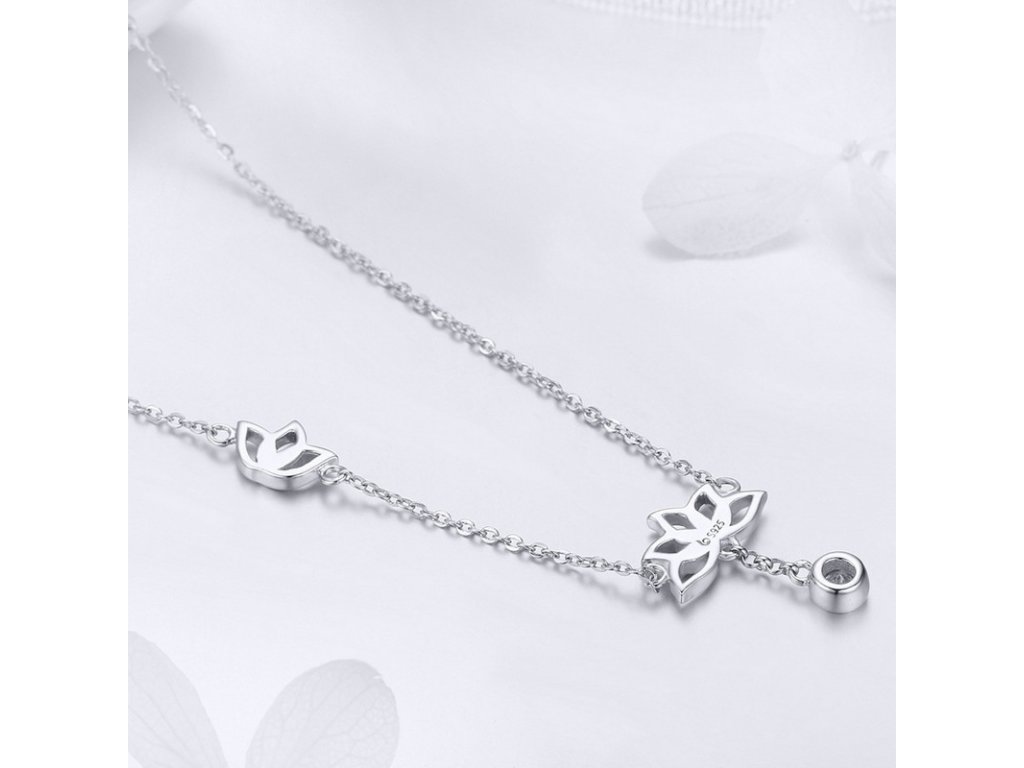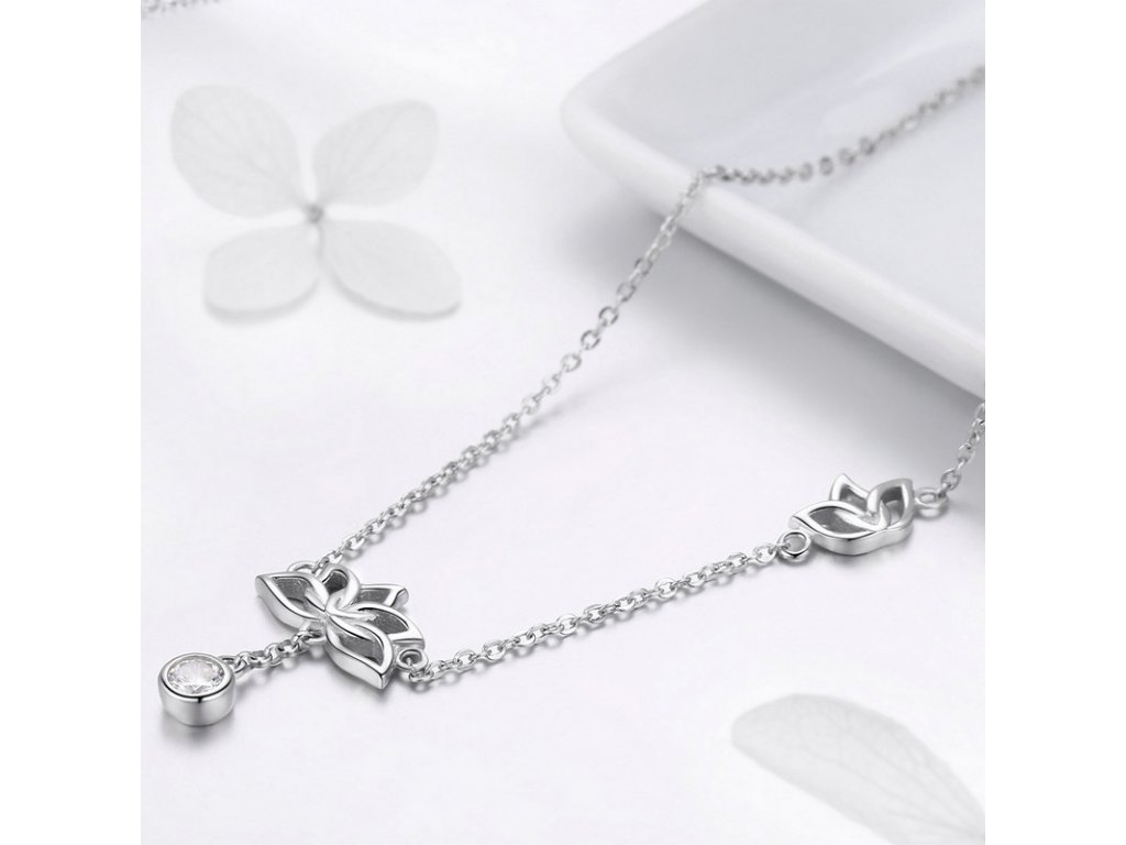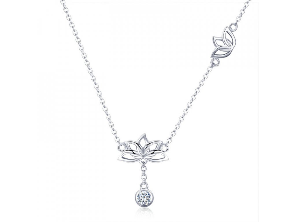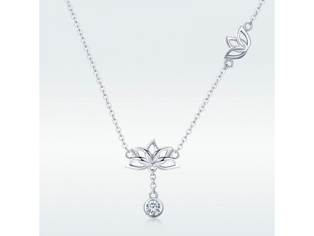Jemný stříbrný náhrdelník s přívěskem lotosových květů doplněný třpytivým kamenem v podobě čirého zirkonu. Originální design náhrdelníku, kvalitní zpracování a materiál, ručně dohotovené.