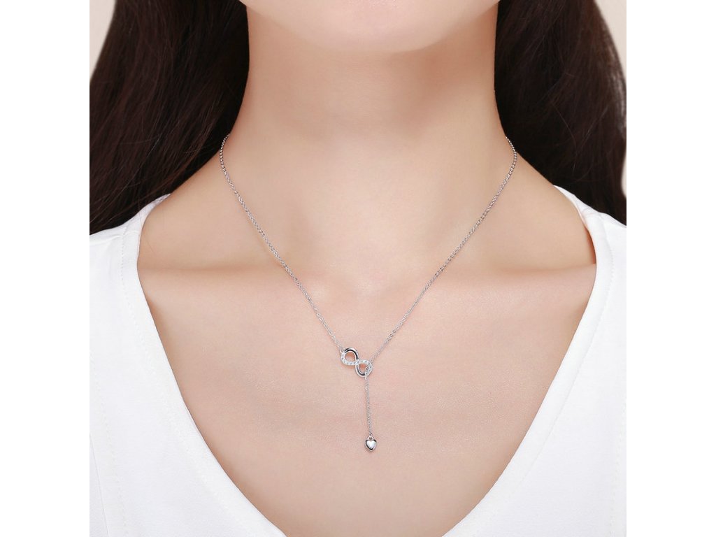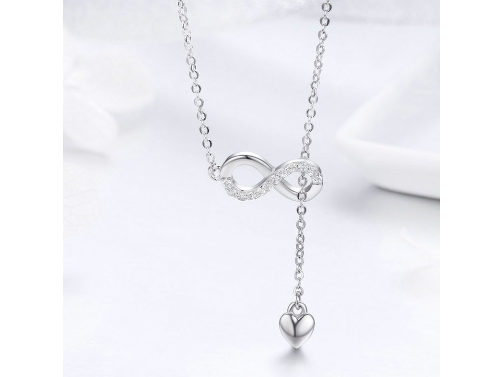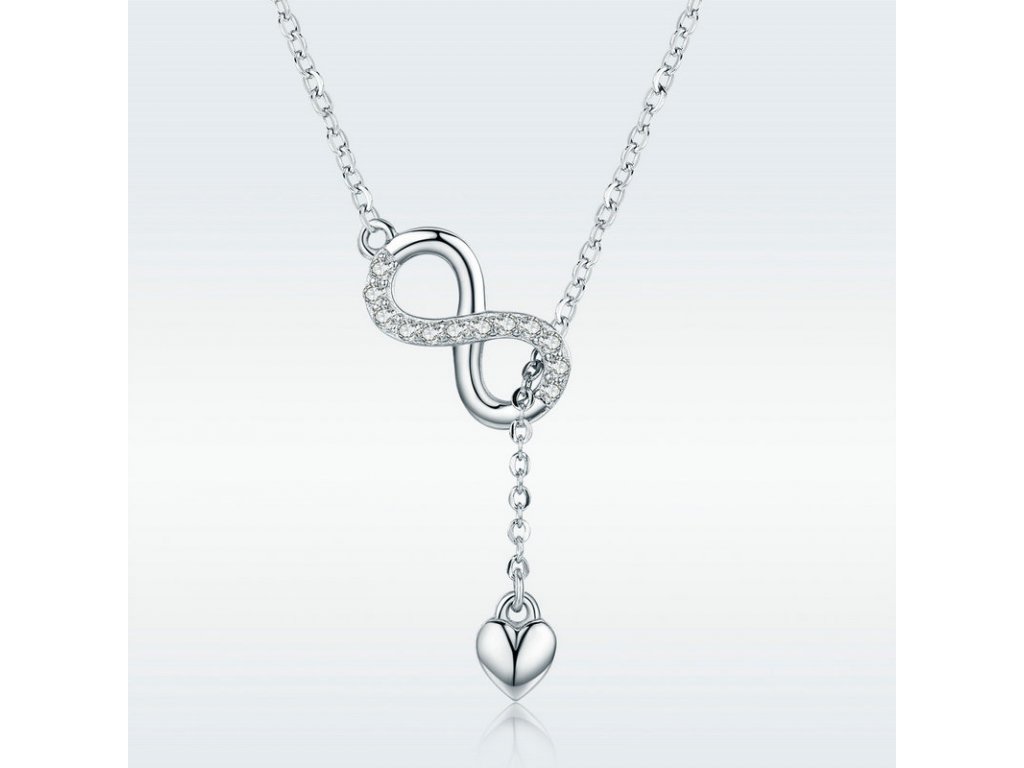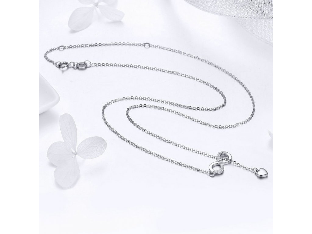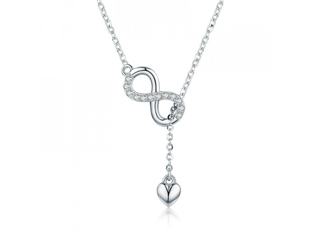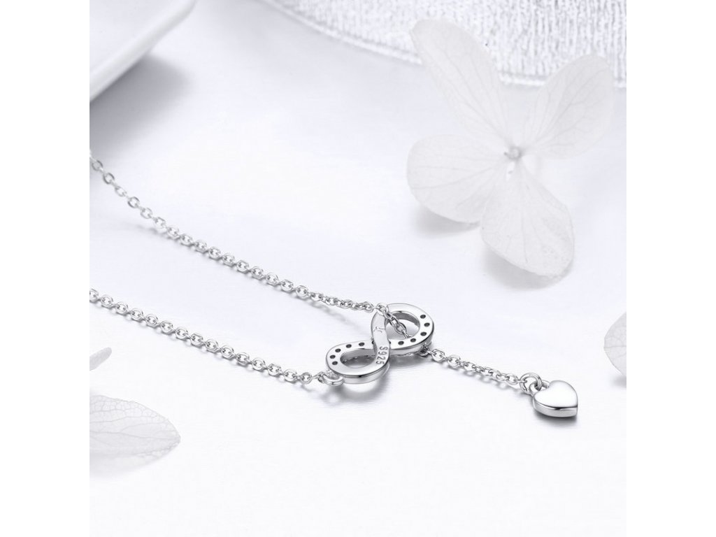 Stříbrný náhrdelník se symbolem nekonečna zdobený třpytivými zirkony. Smyčkou je provlečený řetízek zakončený jemným srdíčkem. Originální design náhrdelníku, kvalitní zpracování a materiál, ručně dohotovené.