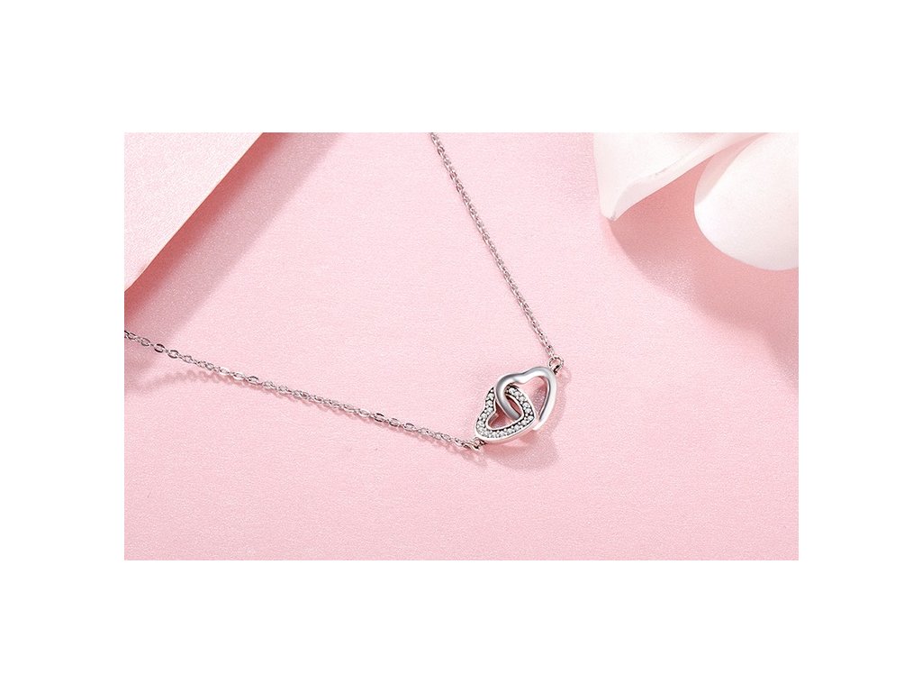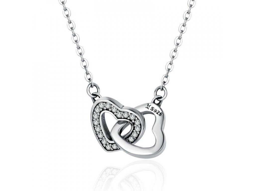 Romantický stříbrný náhrdelník s přívěskem propletených srdcí, kde jedno srdce je zdobeno čirými zirkony. Originální design náhrdelníku, kvalitní zpracování a materiál, ručně dohotovené.