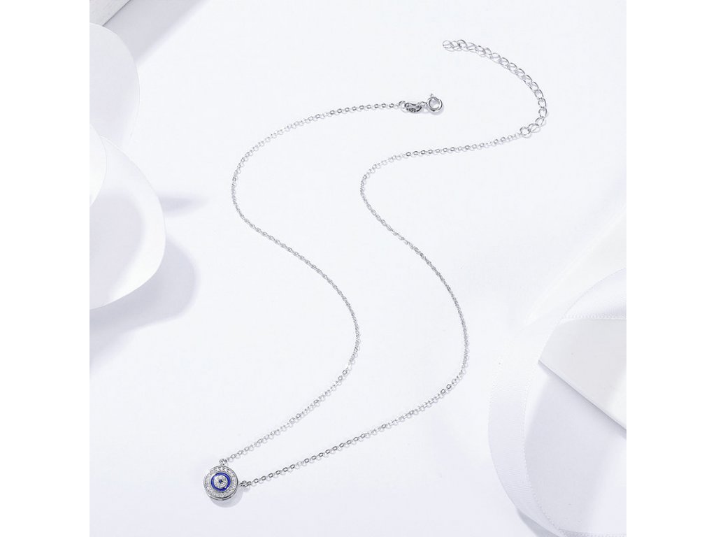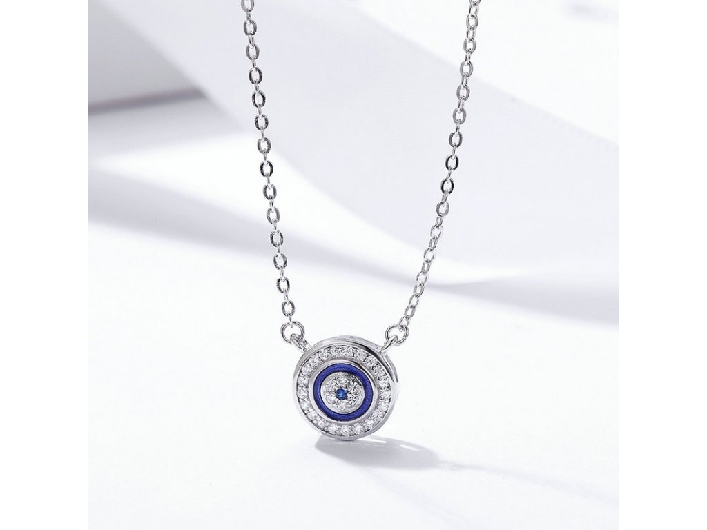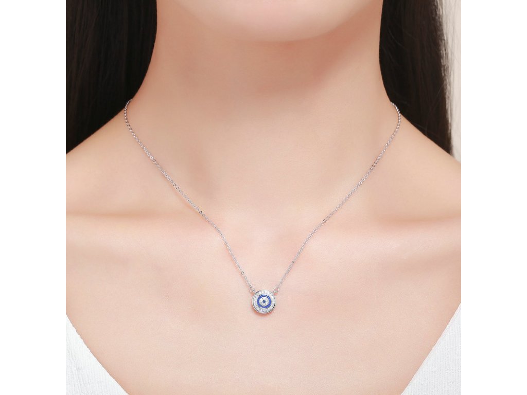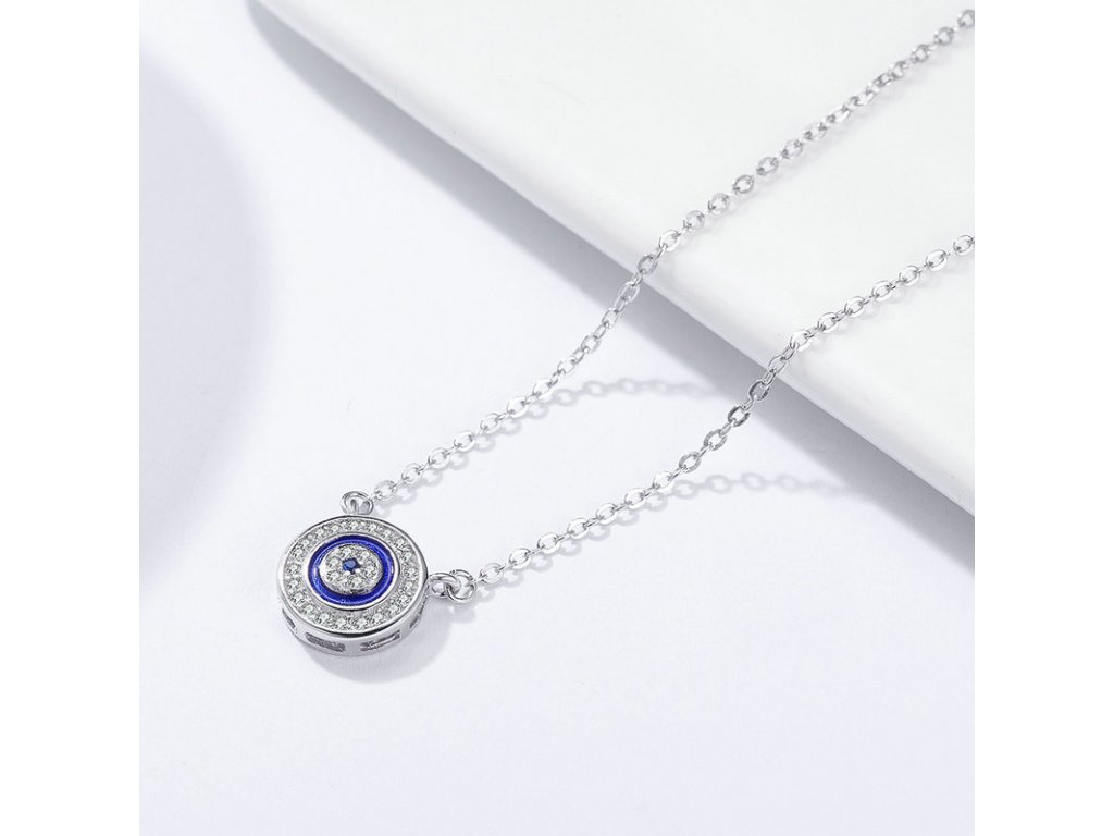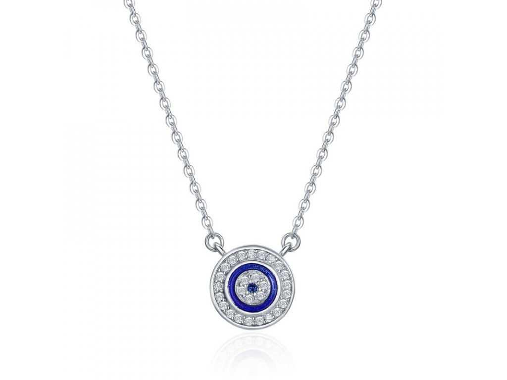 - Stříbrný náhrdelník v designu symbolu ochrany zdobený lesklou modrou glazurou a čirými třpytivými zirkony. Originální design náhrdelníku, kvalitní zpracování a materiál, ručně dohotovené.
